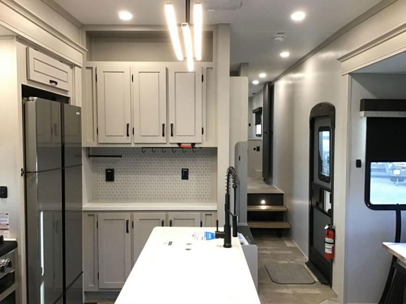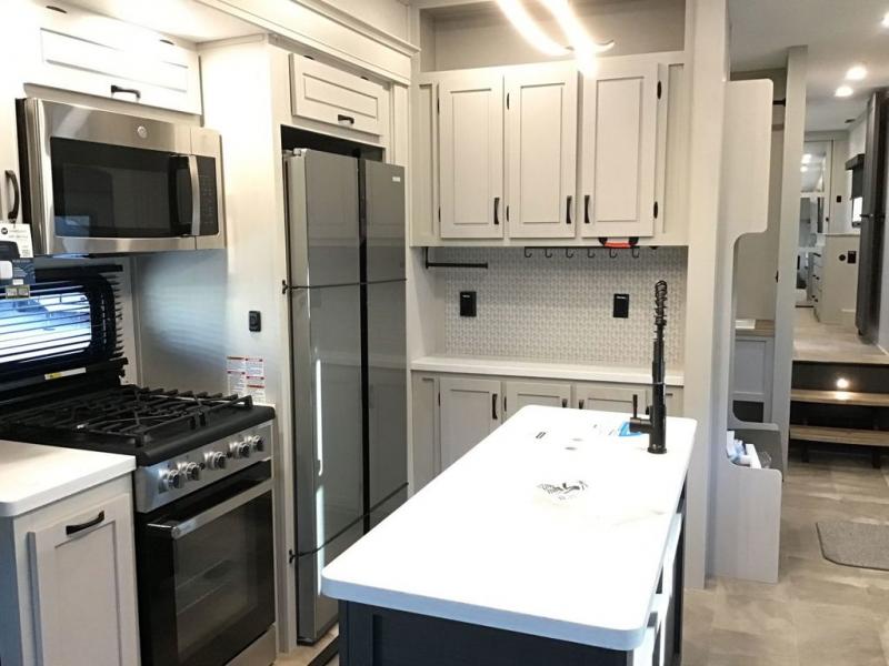 The rear living room is the perfect place to unwind, featuring a 78” trifold sofa, theater seating, overhead cabinets, and an entertainment center. Whether you're watching a movie, reading a book, or simply enjoying the company of loved ones, this room has everything you need to relax and recharge. The spacious kitchen is fitted with a kitchen island, refrigerator, microwave, free-standing table, hutch, and overhead cabinets. Perfect for preparing your favorite meals and enjoy with family. With a convenient coat bench, desk with flip-up storage, washer, and dryer, you'll have everything you need to stay organized and comfortable on the go. The full bathroom is an enormous oasis with a linen closet for added convenience. Also with a front bedroom featuring a king bed, dresser, shelves, and wardrobe, you'll have the perfect place to rest and recharge after a long day of adventure, also plenty of space for storing all your belongings and staying organized on the road.