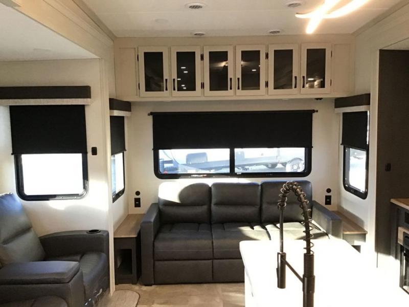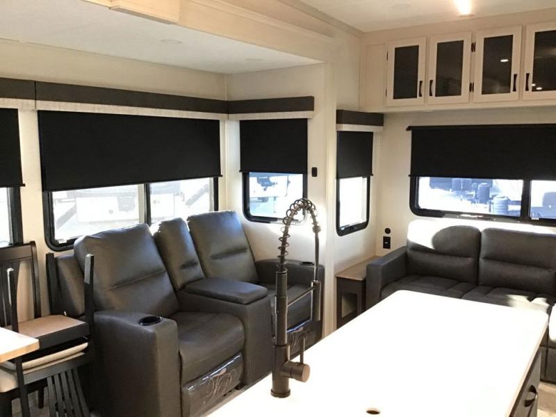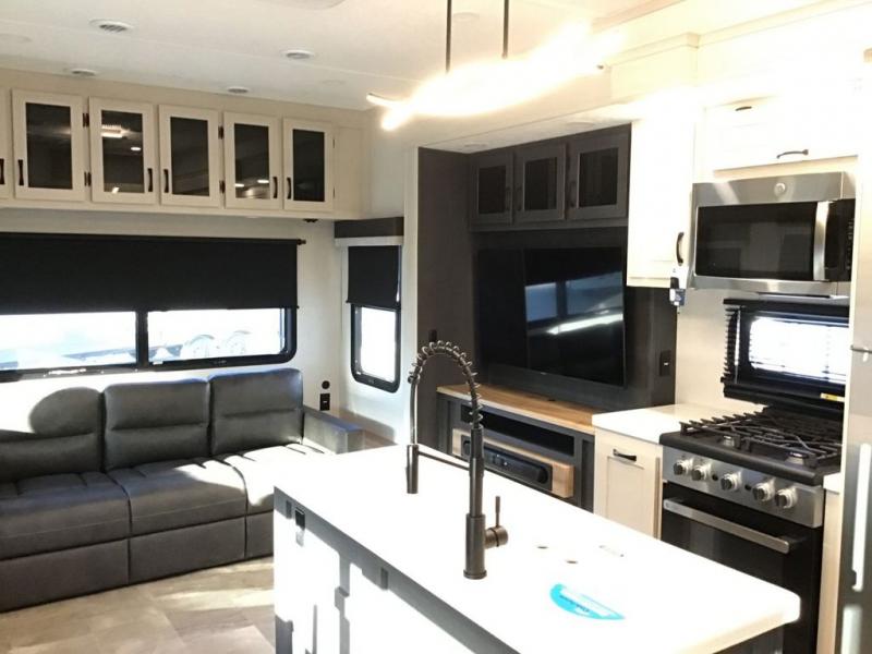 The Brookstone fifth wheels by Coachmen are coming to you with wide-body comfort, home-like amenities, and unique designs for a truly luxurious RV. The Weather Shield+ consists of a 6X double Azdel aluminum cage sidewall system, a Radiant Pro weather barrier system, and more that will help you extend your camping season or go full-time. Head inside to find solid surface countertops in the kitchen, an 4K Smart LED TV in the living room, slow rise roller night shades, and the list of comforts goes on! The Brookstone also includes 6-point electric auto-leveling, four Solid Step entry steps, an electric awning with LED lights, and many more exterior conveniences!