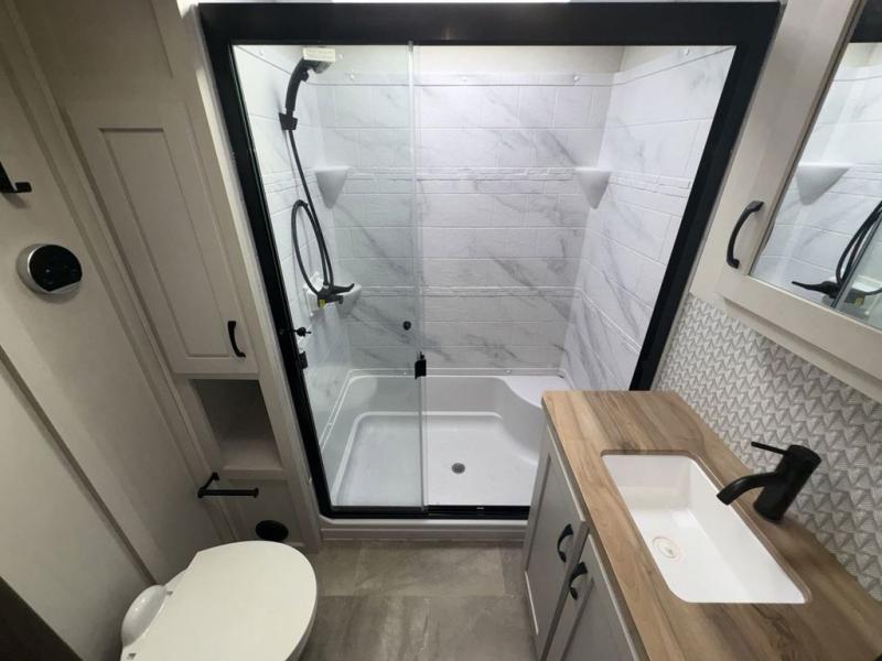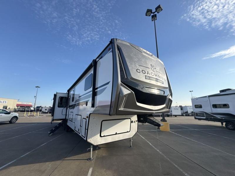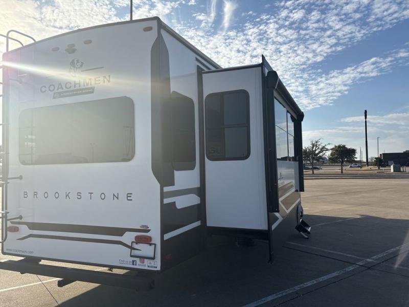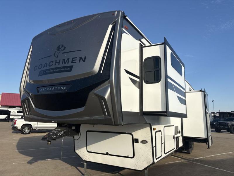 The Brookstone fifth wheels by Coachmen are coming to you with wide-body comfort, home-like amenities, and unique designs for a truly luxurious RV. The Weather Shield+ consists of a 6X double Azdel aluminum cage sidewall system, a Radiant Pro weather barrier system, and more that will help you extend your camping season or go full-time. Head inside to find solid surface countertops in the kitchen, an 4K Smart LED TV in the living room, slow rise roller night shades, and the list of comforts goes on! The Brookstone also includes 6-point electric auto-leveling, four Solid Step entry steps, an electric awning with LED lights, and many more exterior conveniences!