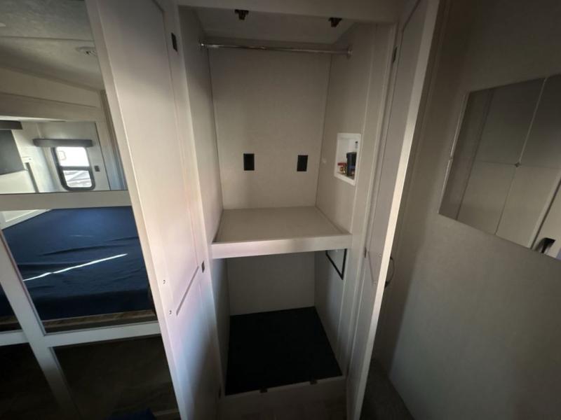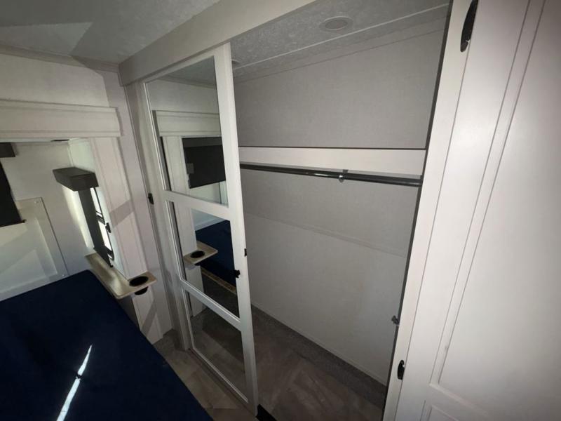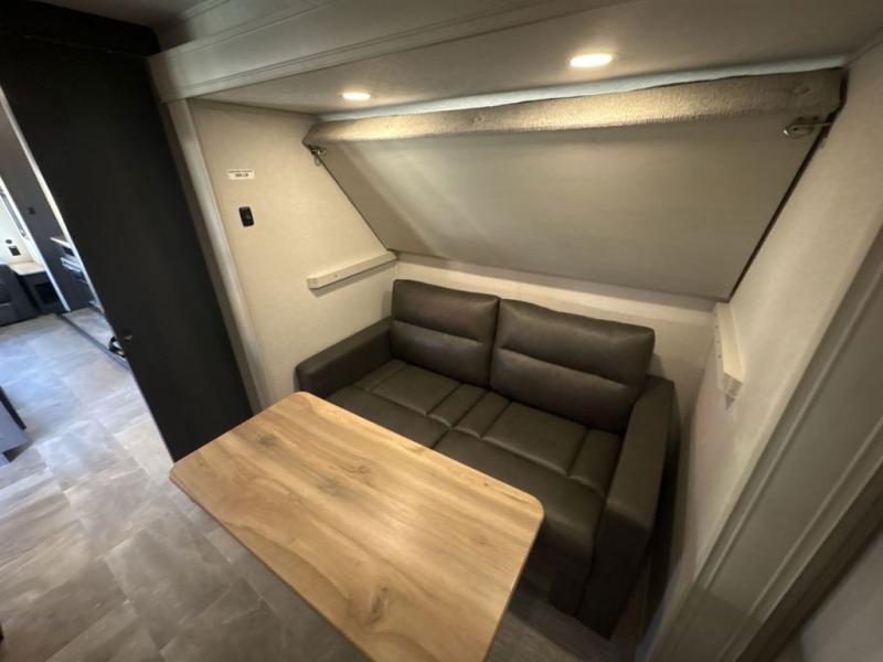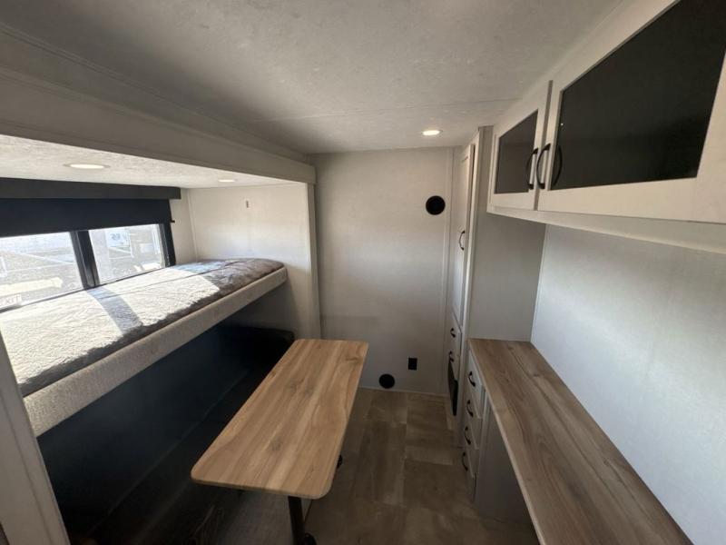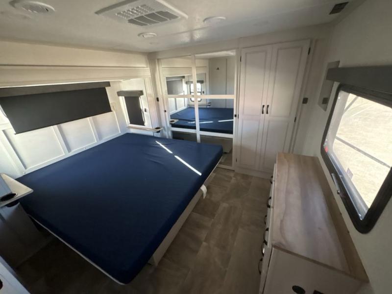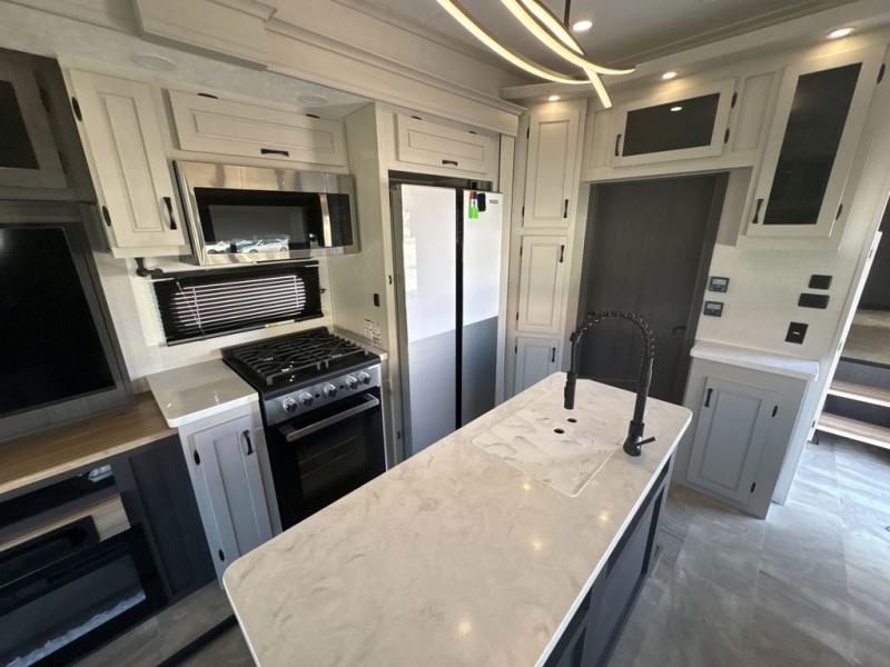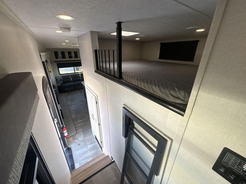 This family-friendly fifth wheel can sleep six to eight comfortably between the king bed, the tri-fold sofa, and the middle bunkhouse with a loft above! There is plenty of counter space in the bunkhouse, plus a sofa with a removable table and a wardrobe for clothes. The kitchen is any chef's dream with its residential cooktop, 12V refrigerator, and kitchen island for more counter space. While dinner is being made, you can play a game of cards at the free-standing table, relax on the tri-fold sofa, or visit outdoors under the 20' power awning with LED lights. You won't be left wanting for storage space in this model thanks to the overhead cabinets, plus the bedroom dresser and large wardrobe. There is even a wardrobe with washer and dryer prep if you choose to go full-time!