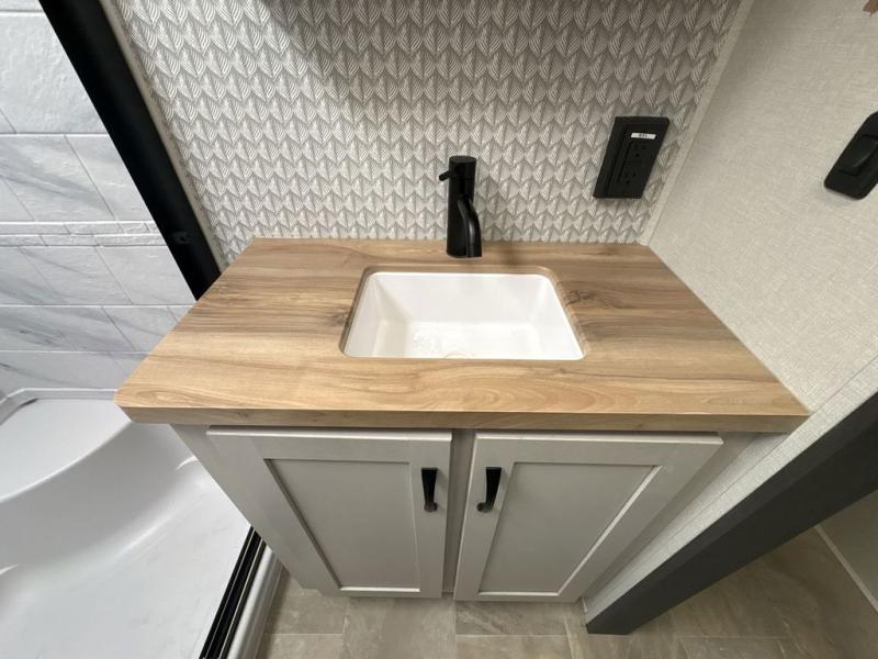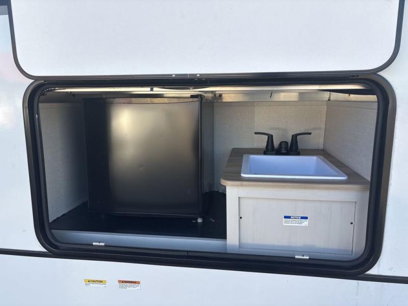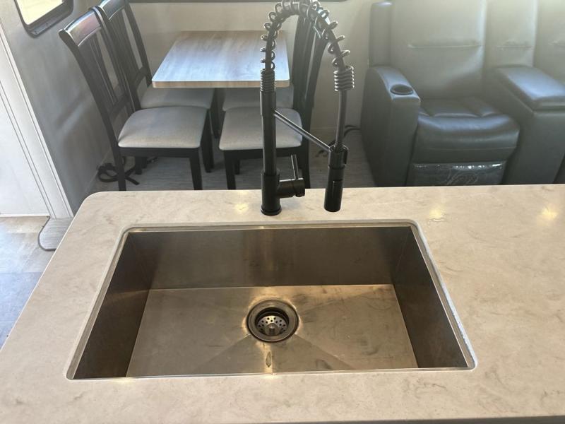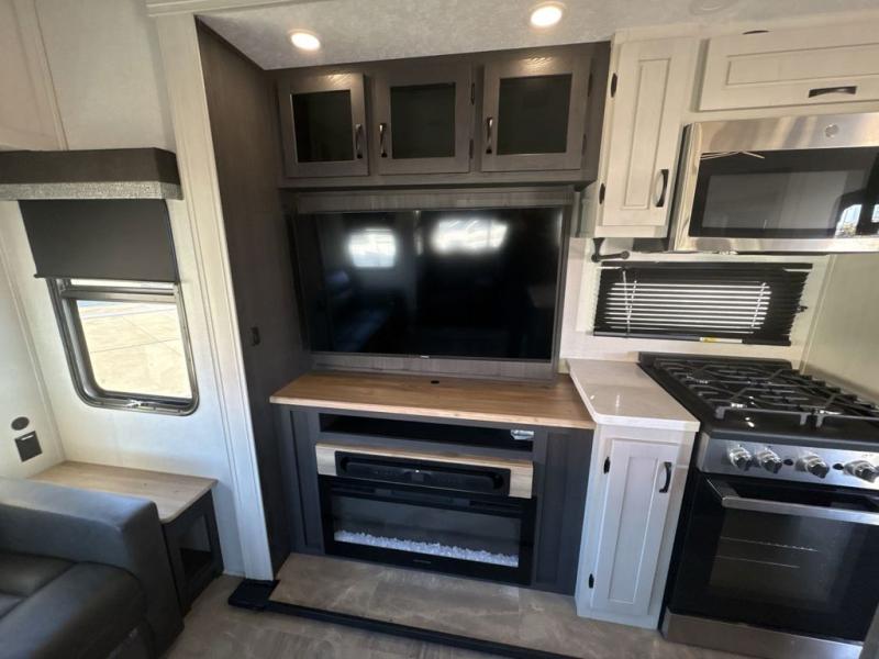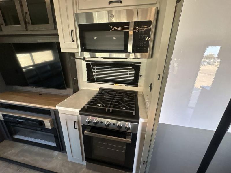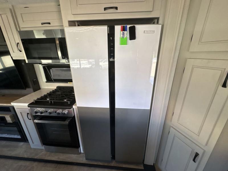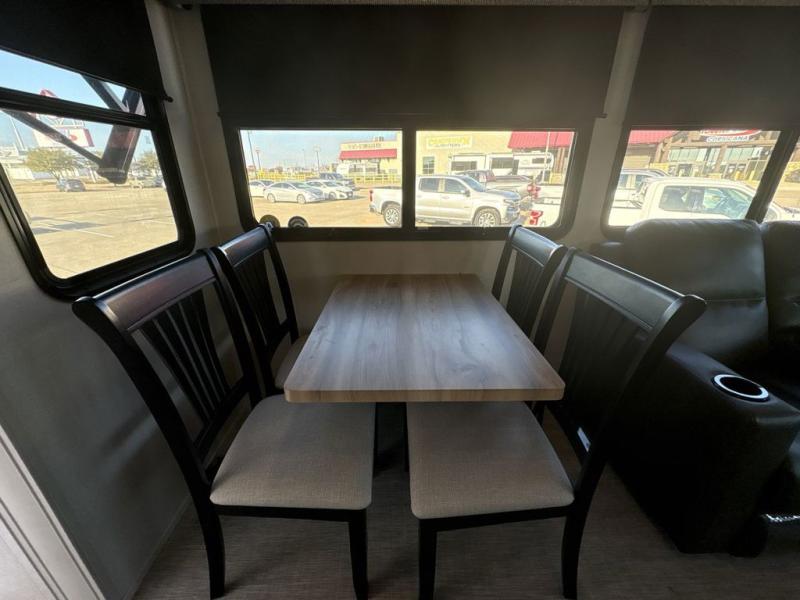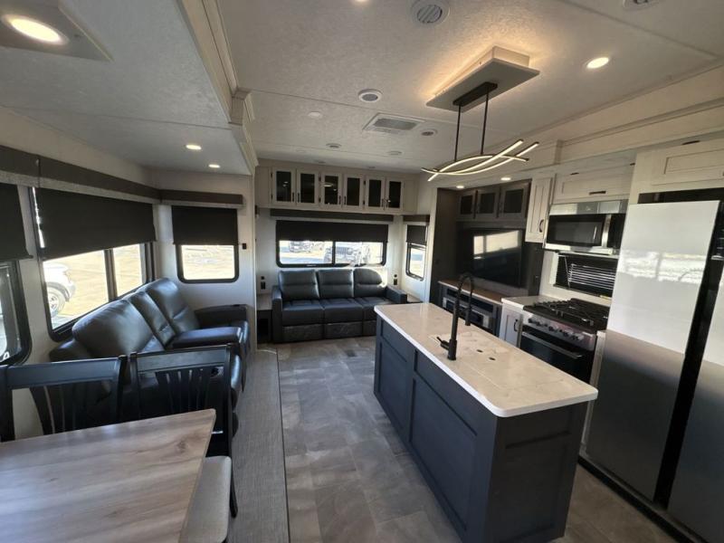 This family-friendly fifth wheel can sleep six to eight comfortably between the king bed, the tri-fold sofa, and the middle bunkhouse with a loft above! There is plenty of counter space in the bunkhouse, plus a sofa with a removable table and a wardrobe for clothes. The kitchen is any chef's dream with its residential cooktop, 12V refrigerator, and kitchen island for more counter space. While dinner is being made, you can play a game of cards at the free-standing table, relax on the tri-fold sofa, or visit outdoors under the 20' power awning with LED lights. You won't be left wanting for storage space in this model thanks to the overhead cabinets, plus the bedroom dresser and large wardrobe. There is even a wardrobe with washer and dryer prep if you choose to go full-time!