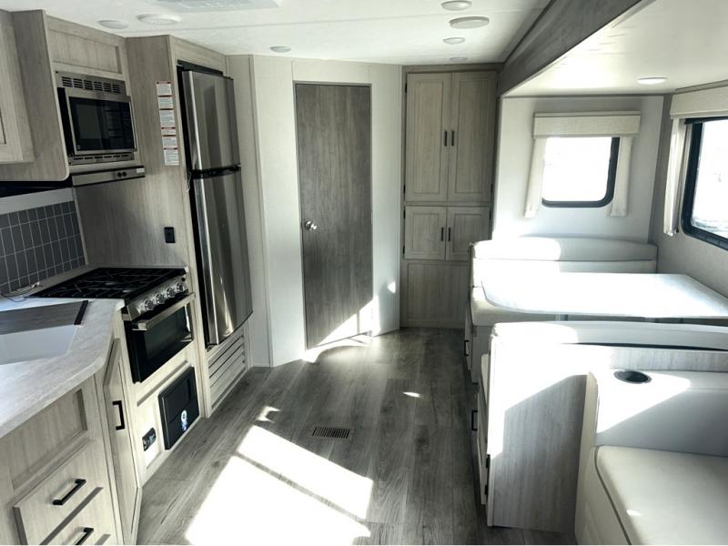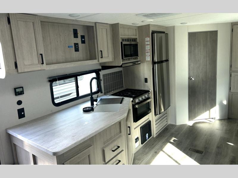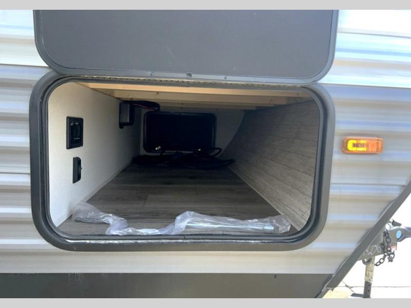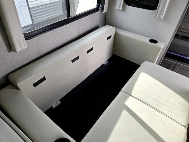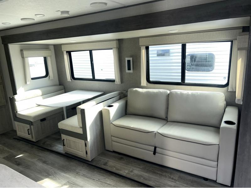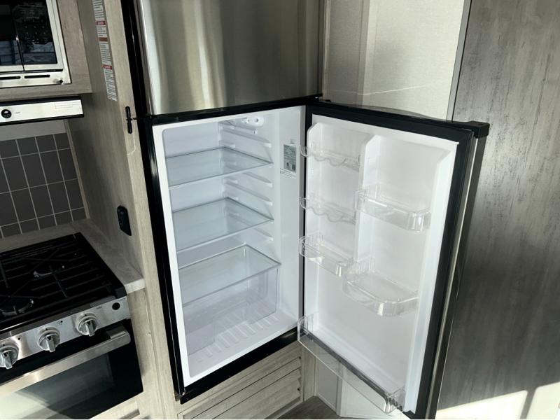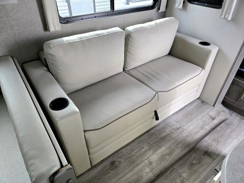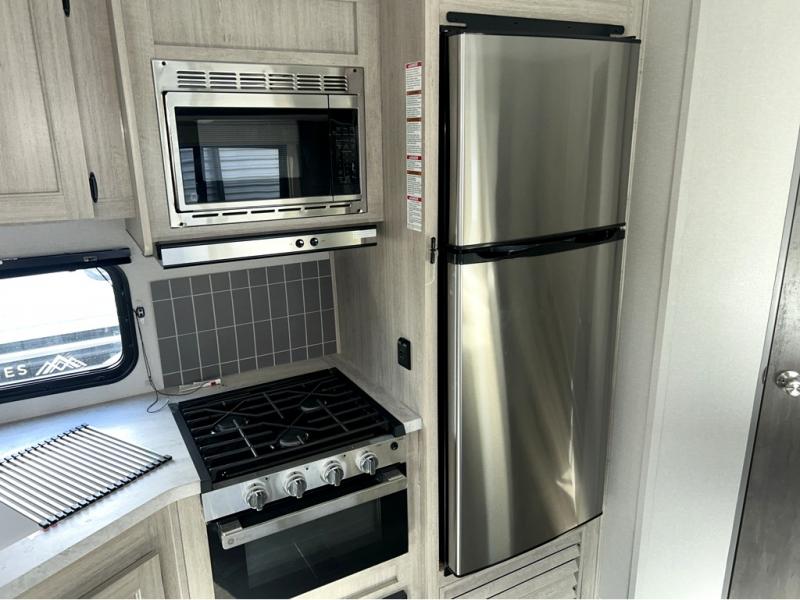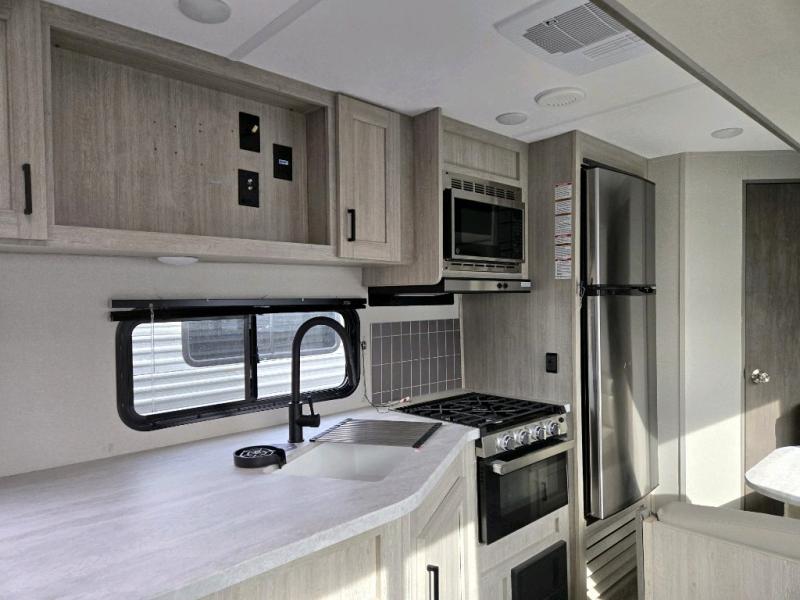This half-ton friendly trailer is easy to pull and park, and is spacious thanks to the large slide out in the main living and kitchen area! You can dine at the booth dinette or choose the free standing dinette option, and the sofa offers drink holders for your drink when you're relaxing. The rear corner offers a full bathroom and a large wardrobe/pantry for the storage you need. The galley kitchen offers full amenities plus a breakfast bar where you can set out fresh fruit and cereal. And the 15' awning provides protection from the elements plus has the choice of multiple LED colors with the use of the remote.