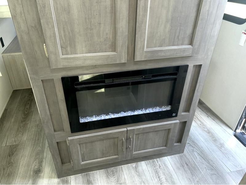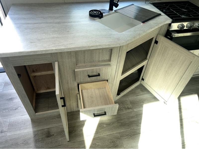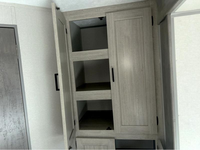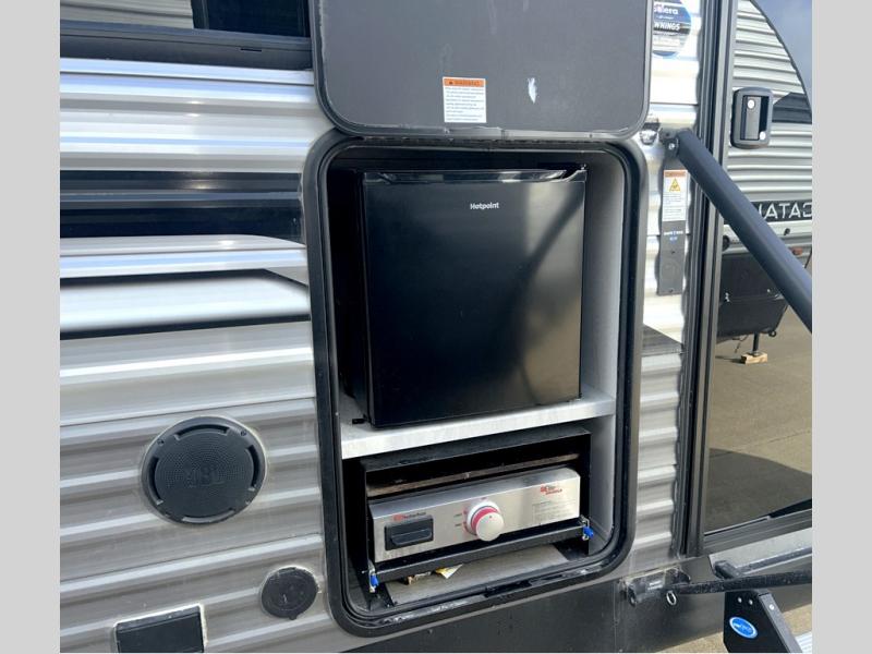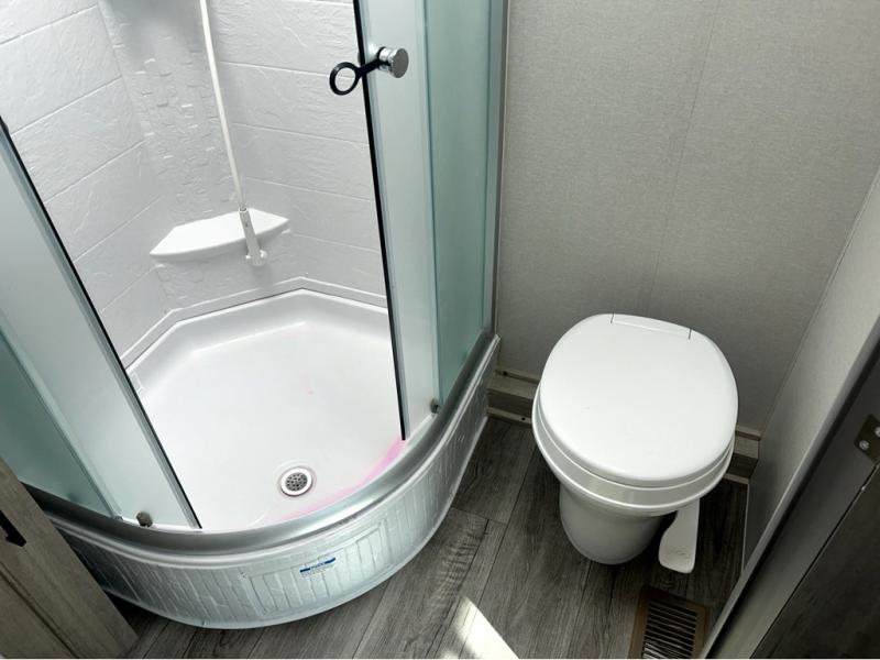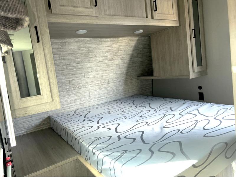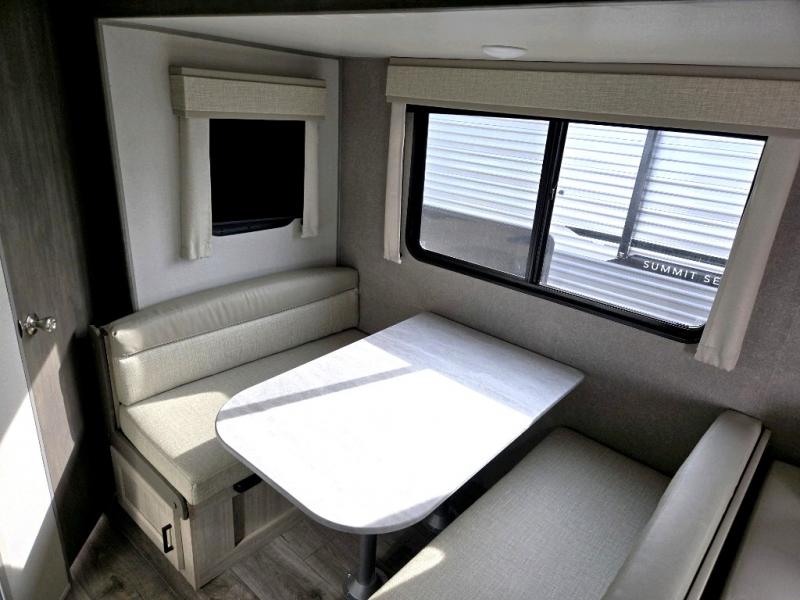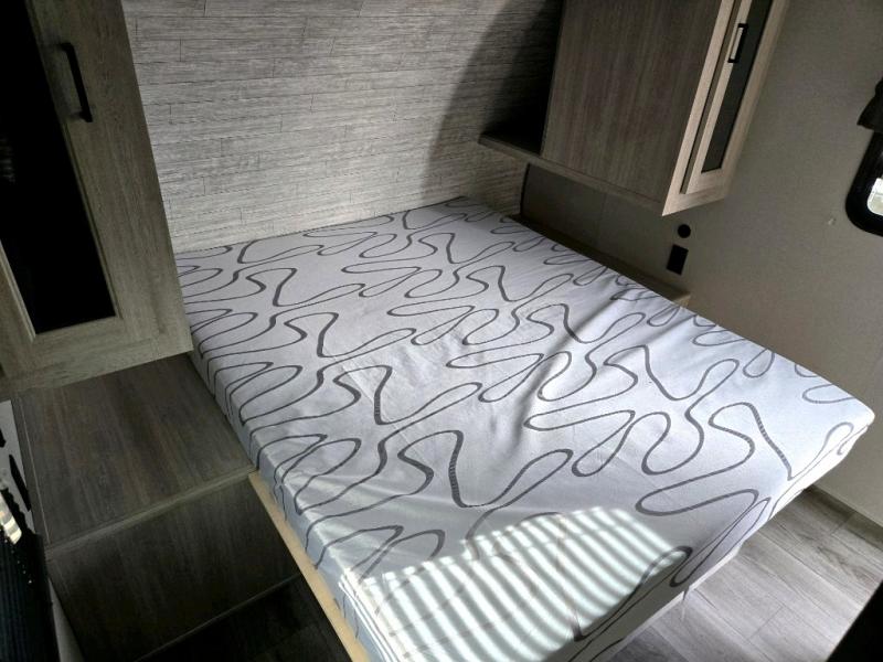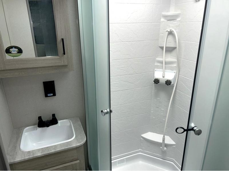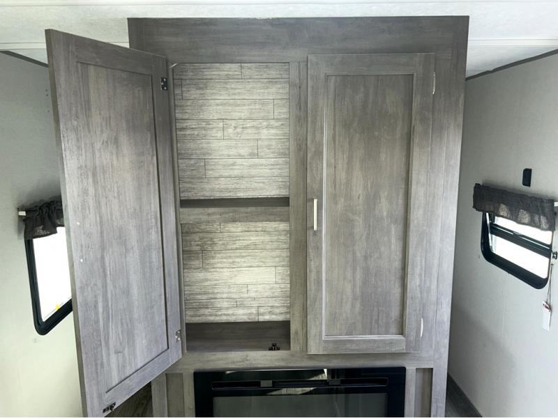 This half-ton friendly trailer is easy to pull and park, and is spacious thanks to the large slide out in the main living and kitchen area! You can dine at the booth dinette or choose the free standing dinette option, and the sofa offers drink holders for your drink when you're relaxing. The rear corner offers a full bathroom and a large wardrobe/pantry for the storage you need. The galley kitchen offers full amenities plus a breakfast bar where you can set out fresh fruit and cereal. And the 15' awning provides protection from the elements plus has the choice of multiple LED colors with the use of the remote.