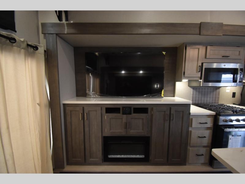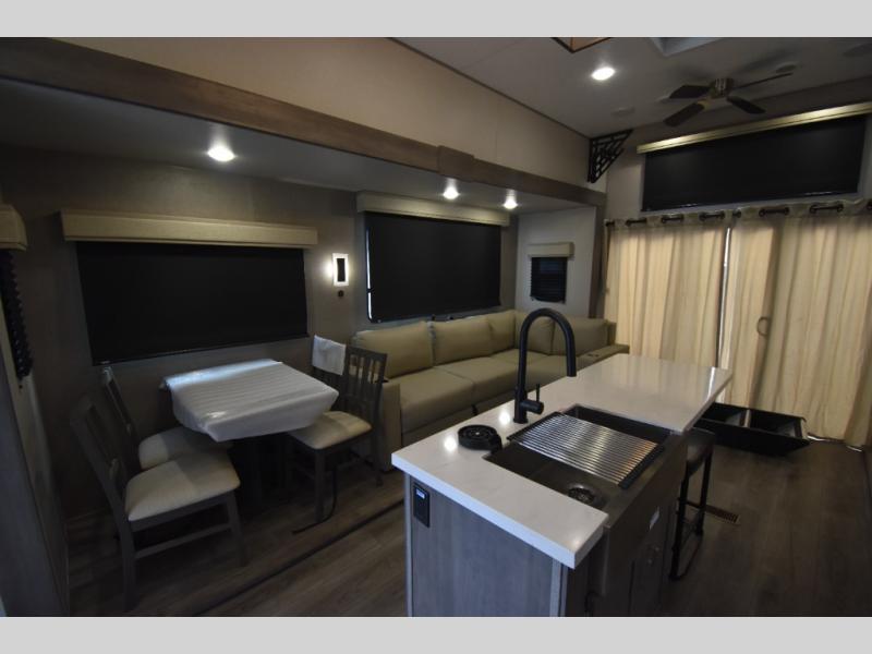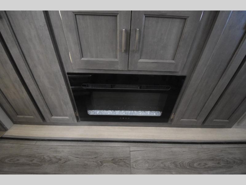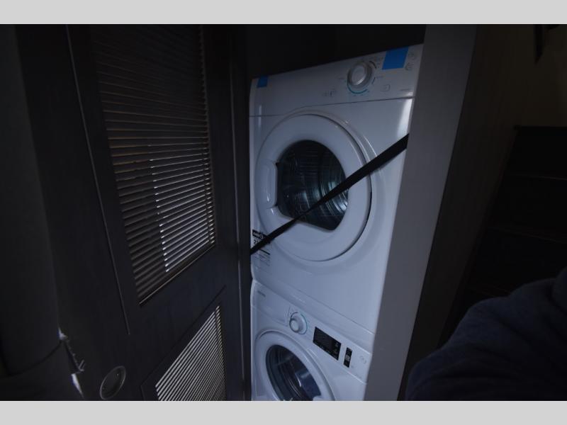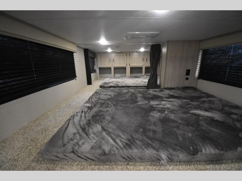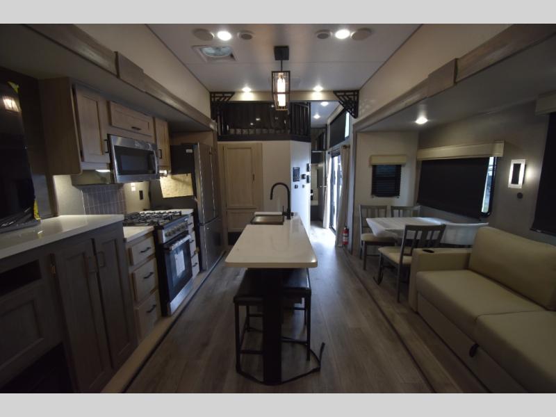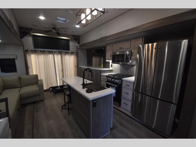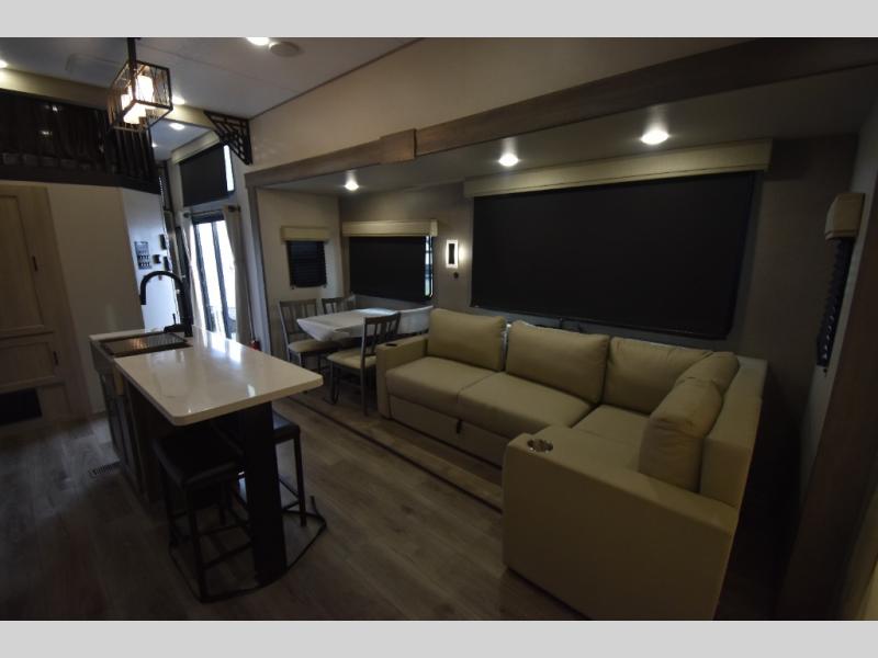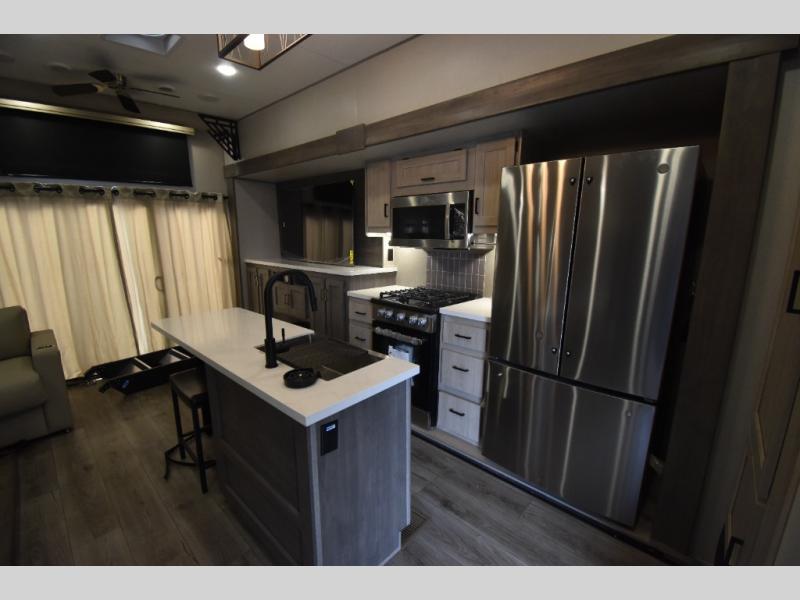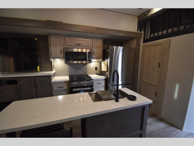 There is much to love about this destination trailer! Starting with the loft that has two queen beds, a wardrobe/storage, and a custom 58" x 71" bed. Downstairs there's a private bedroom with a king bed slide, a fireplace, and its very own private full bathroom complete with a dual sink vanity. The main living area has a huge bi-fold sleeper sectional sofa so you can fit even more guests, or just relax and watch the TV on the power lift in the entertainment center. The kitchen is well-equipped with a residential refrigerator, microwave, and pantry. The centerpiece here is a kitchen island with a deep basin farm-style sink and bar stool seating so your group can gather together and make new memories. The second full bath has a roomy 36" x 30" shower with glass door, and just outside it is the stackable washer and dryer!