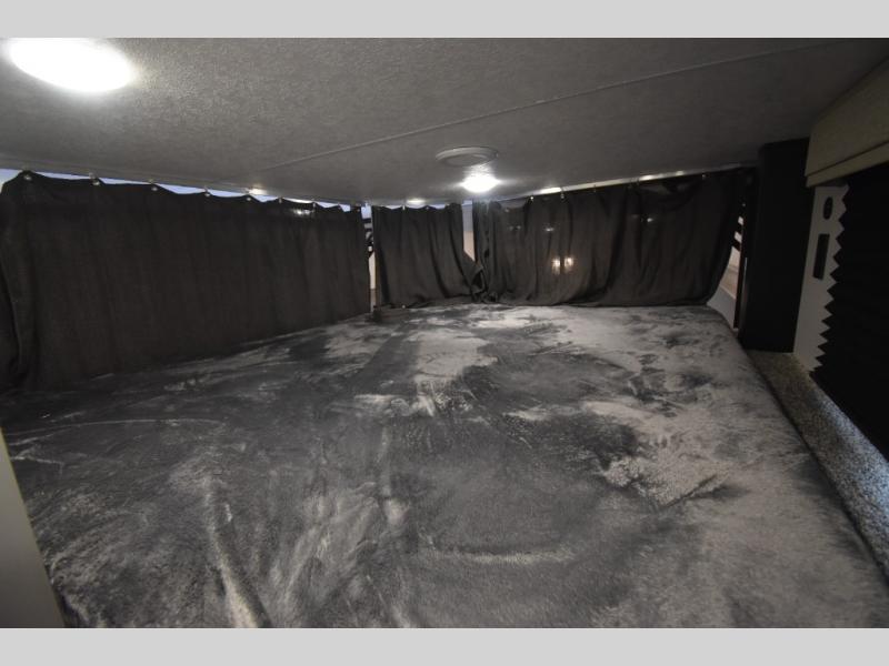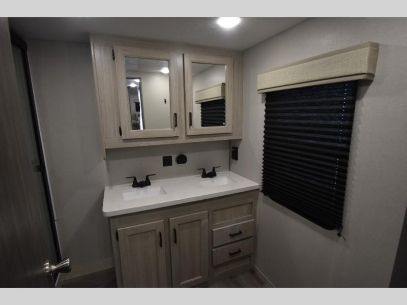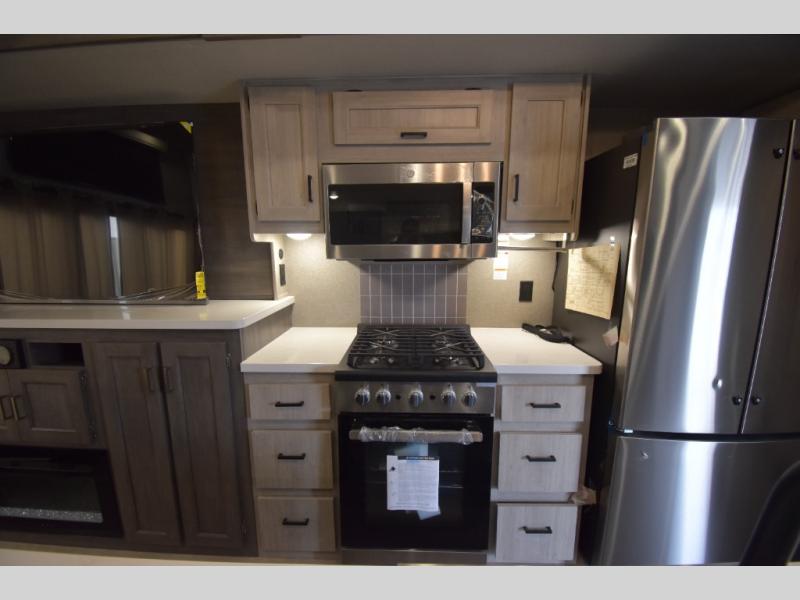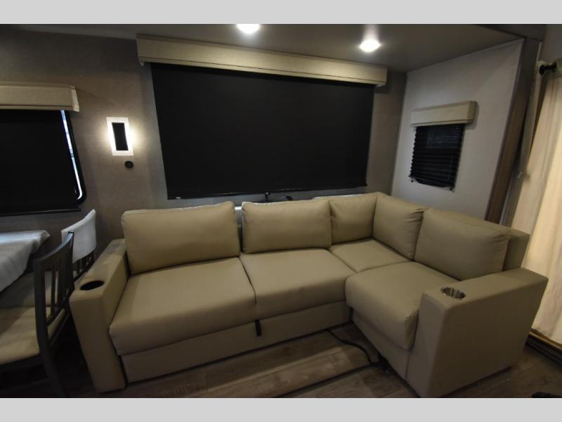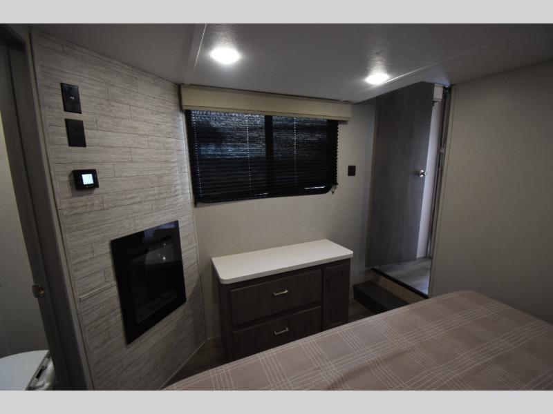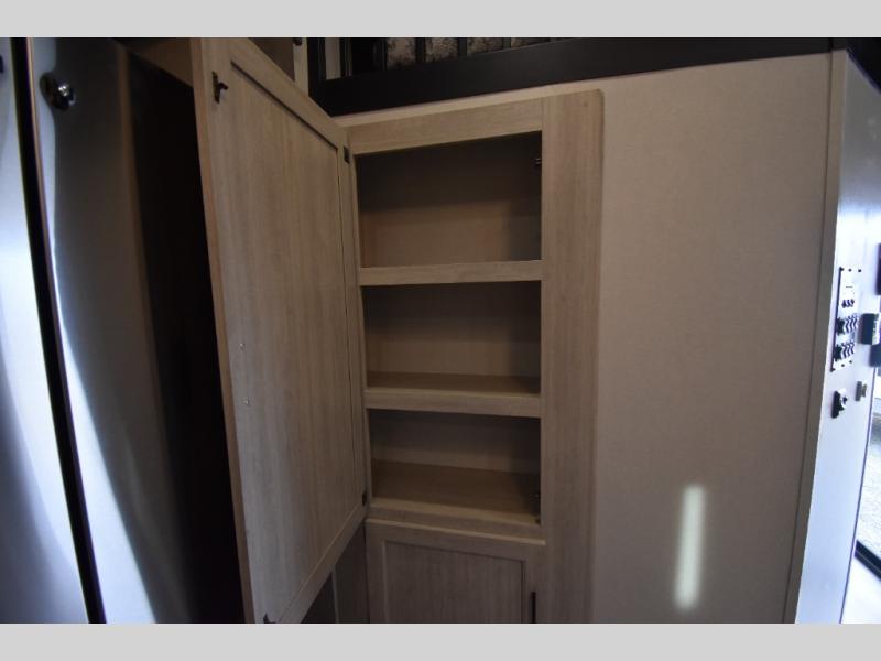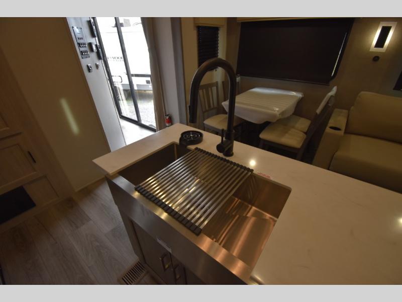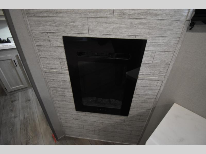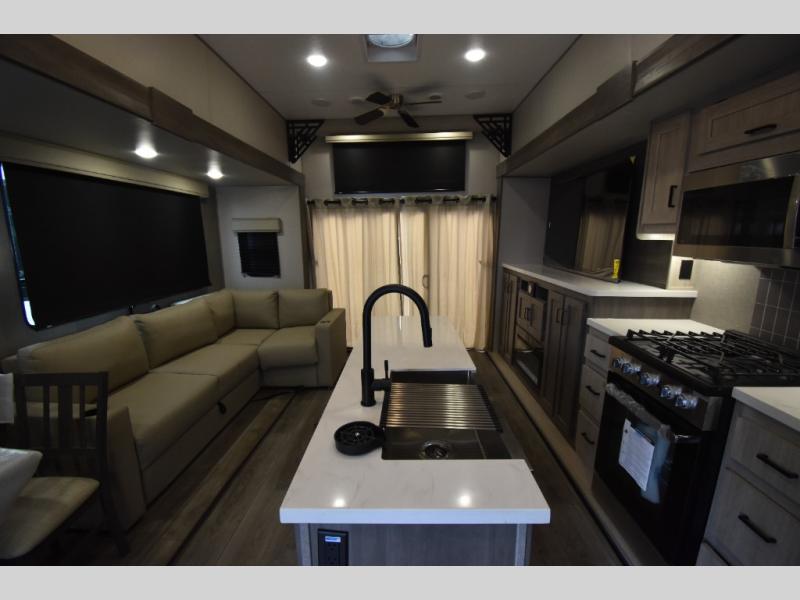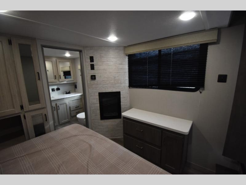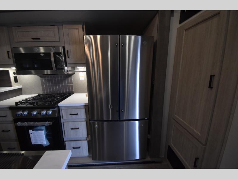 There is much to love about this destination trailer! Starting with the loft that has two queen beds, a wardrobe/storage, and a custom 58" x 71" bed. Downstairs there's a private bedroom with a king bed slide, a fireplace, and its very own private full bathroom complete with a dual sink vanity. The main living area has a huge bi-fold sleeper sectional sofa so you can fit even more guests, or just relax and watch the TV on the power lift in the entertainment center. The kitchen is well-equipped with a residential refrigerator, microwave, and pantry. The centerpiece here is a kitchen island with a deep basin farm-style sink and bar stool seating so your group can gather together and make new memories. The second full bath has a roomy 36" x 30" shower with glass door, and just outside it is the stackable washer and dryer!