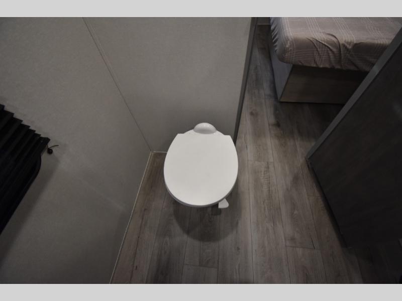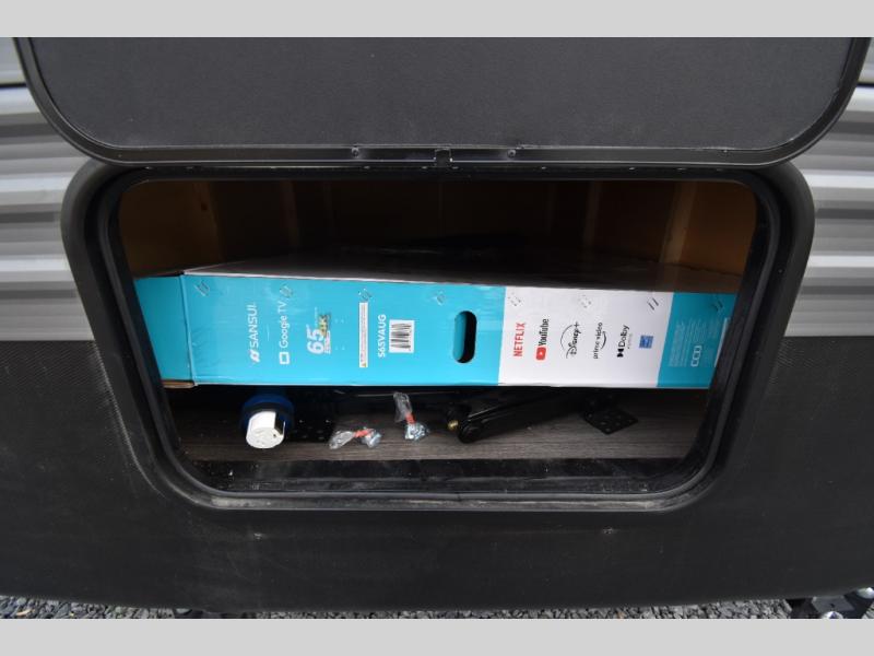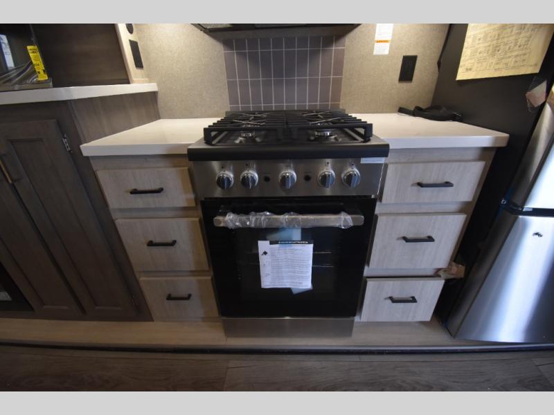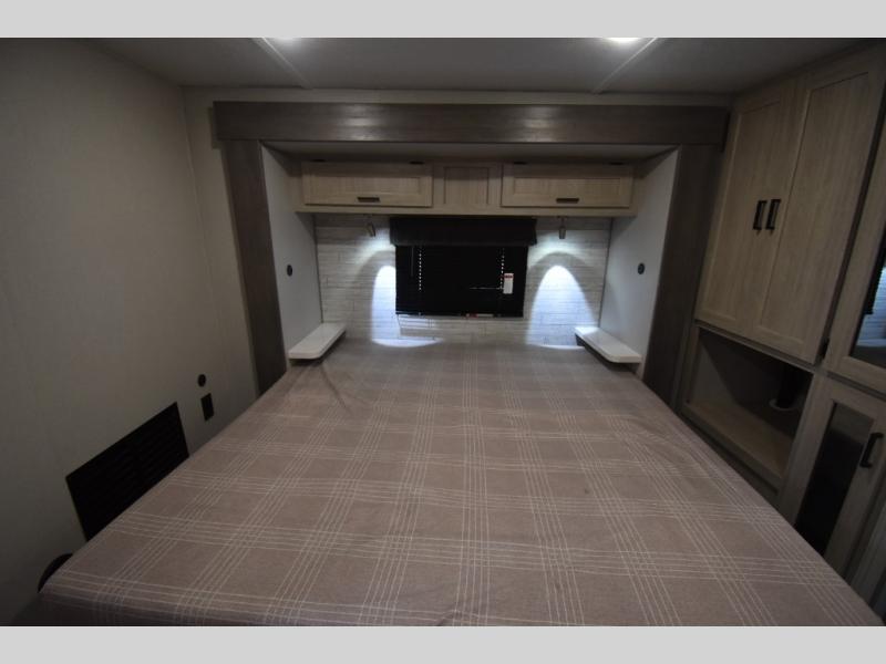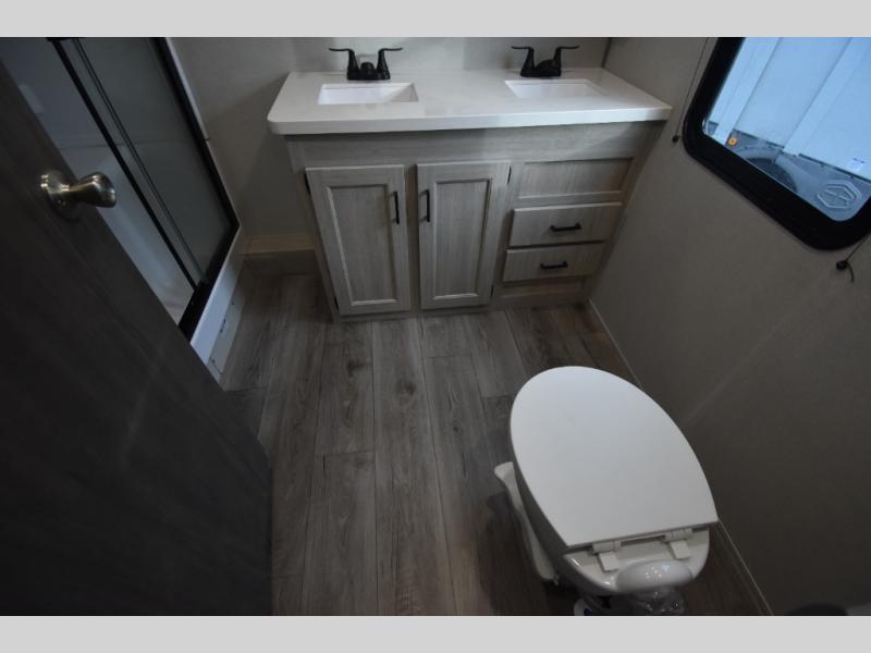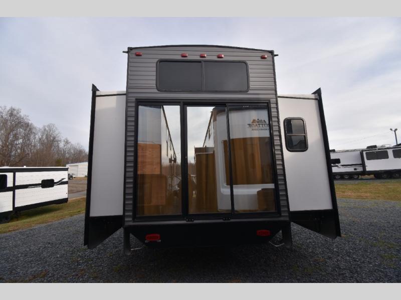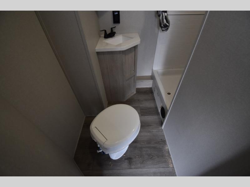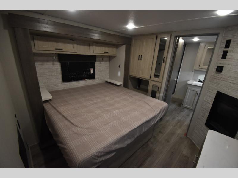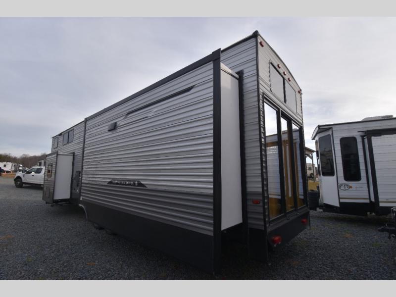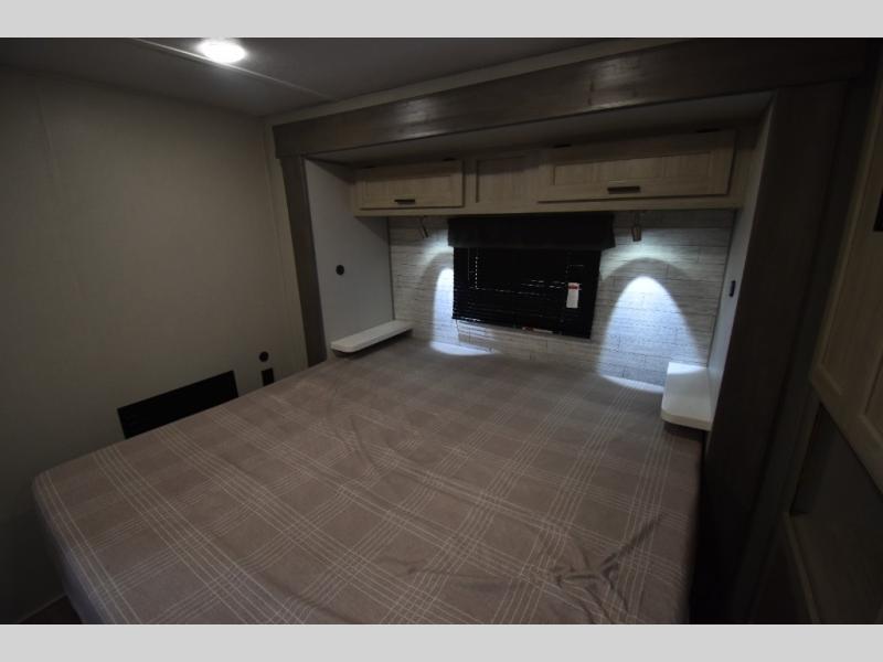 There is much to love about this destination trailer! Starting with the loft that has two queen beds, a wardrobe/storage, and a custom 58" x 71" bed. Downstairs there's a private bedroom with a king bed slide, a fireplace, and its very own private full bathroom complete with a dual sink vanity. The main living area has a huge bi-fold sleeper sectional sofa so you can fit even more guests, or just relax and watch the TV on the power lift in the entertainment center. The kitchen is well-equipped with a residential refrigerator, microwave, and pantry. The centerpiece here is a kitchen island with a deep basin farm-style sink and bar stool seating so your group can gather together and make new memories. The second full bath has a roomy 36" x 30" shower with glass door, and just outside it is the stackable washer and dryer!