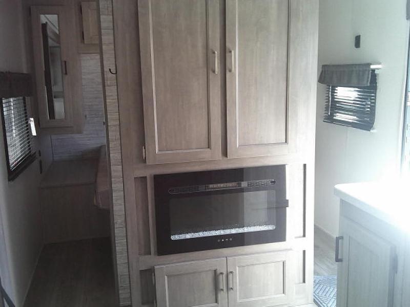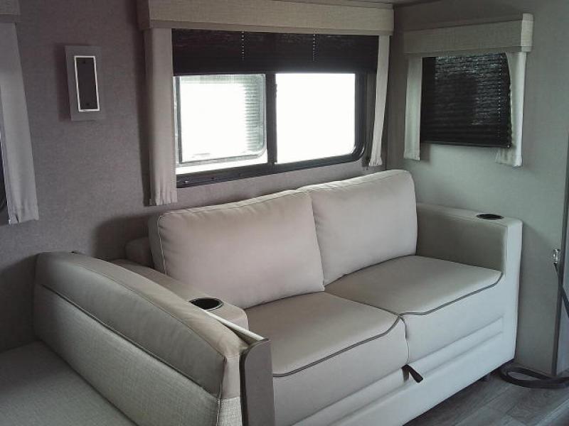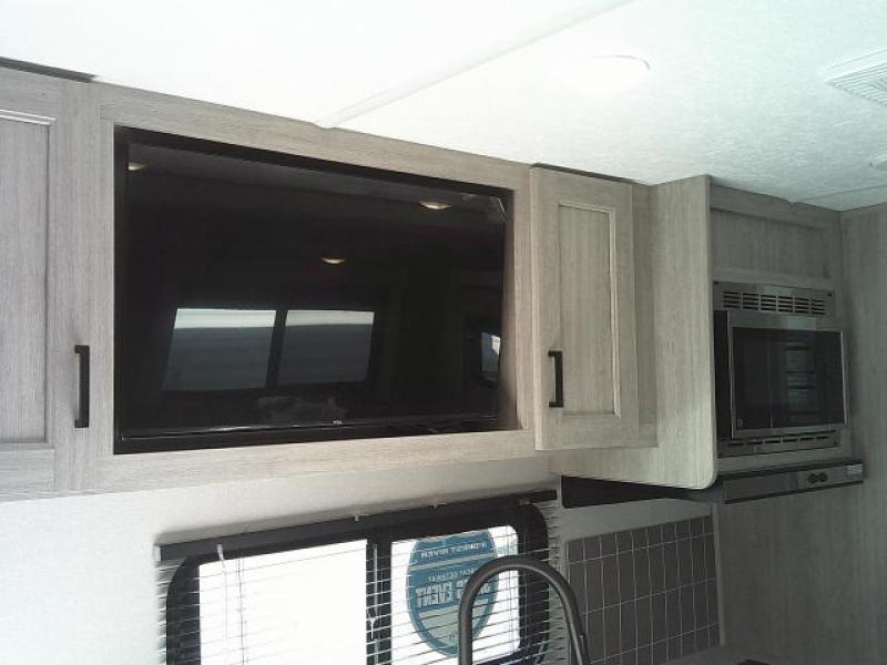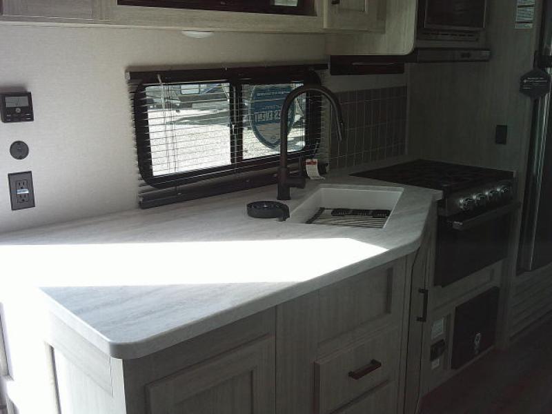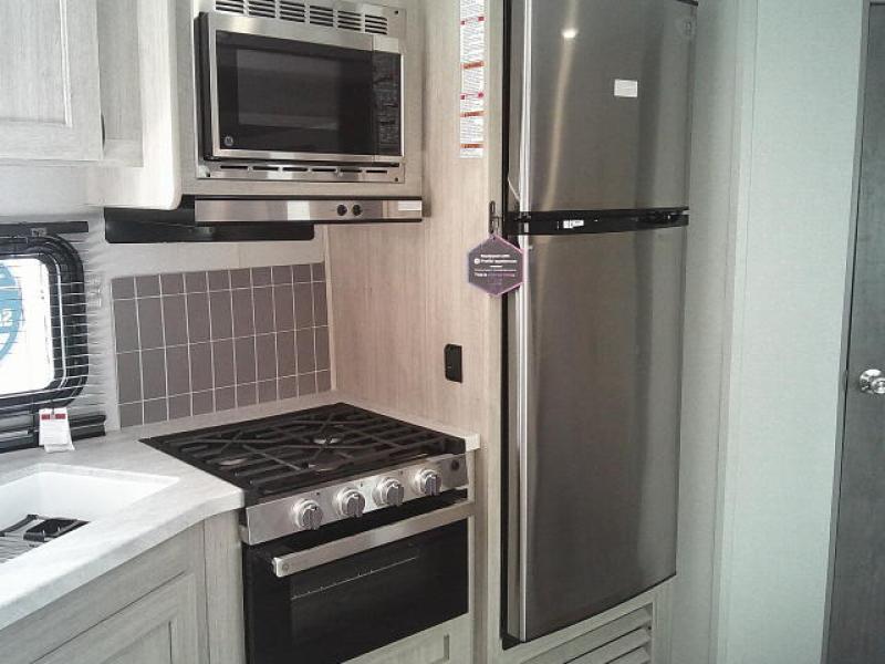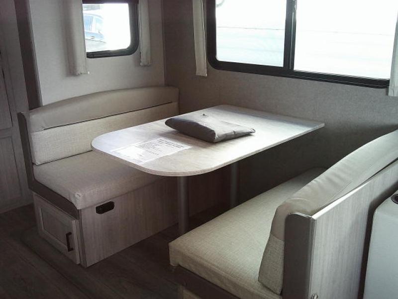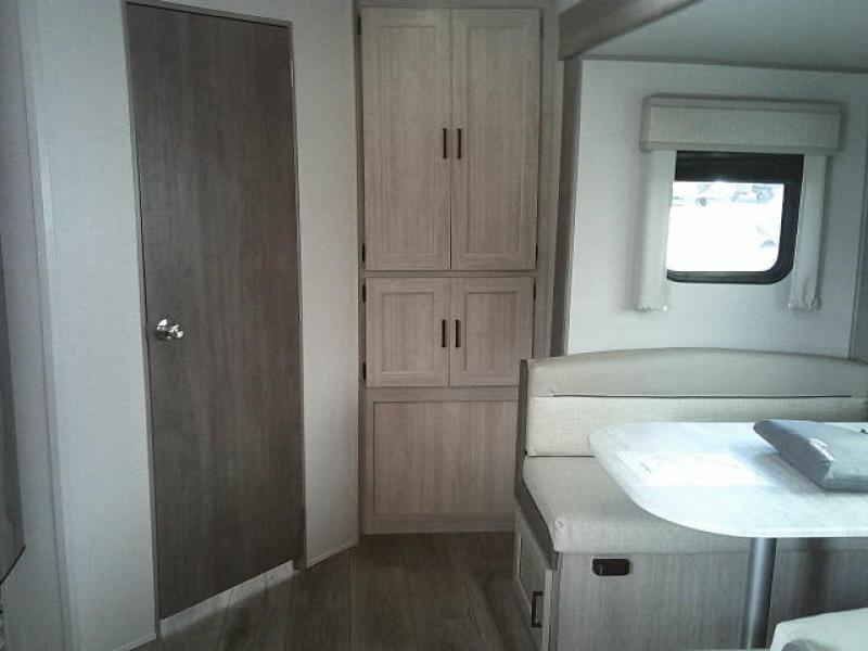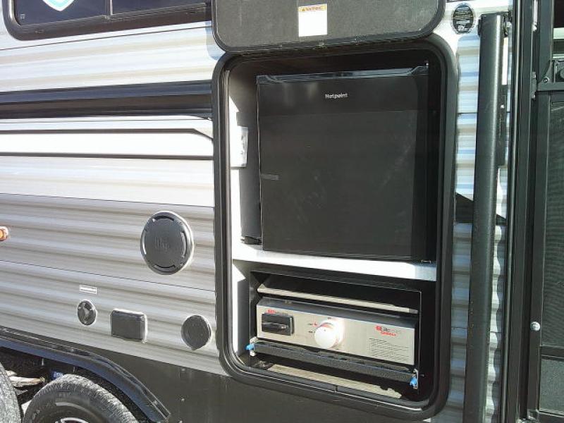 This half-ton friendly trailer is easy to pull and park, and is spacious thanks to the large slide out in the main living and kitchen area! You can dine at the booth dinette or choose the free standing dinette option, and the sofa offers drink holders for your drink when you're relaxing. The rear corner offers a full bathroom and a large wardrobe/pantry for the storage you need. The galley kitchen offers full amenities plus a breakfast bar where you can set out fresh fruit and cereal. And the 15' awning provides protection from the elements plus has the choice of multiple LED colors with the use of the remote.