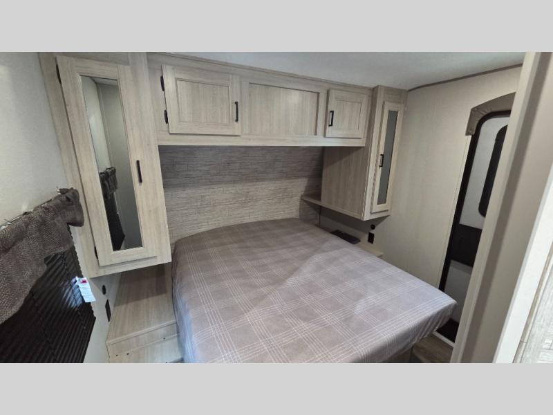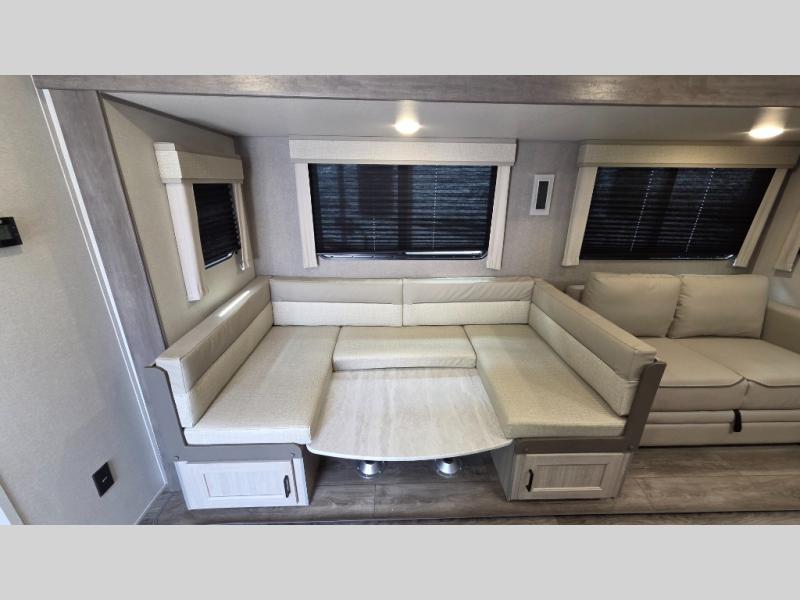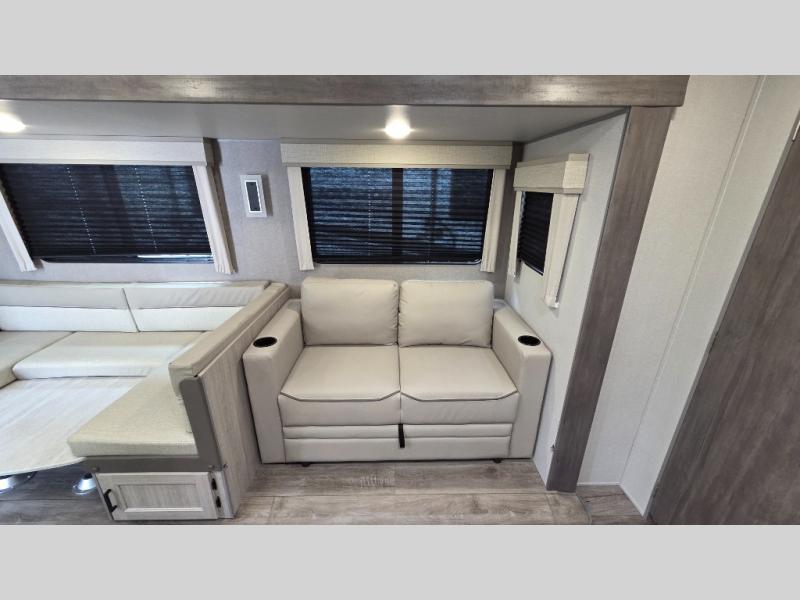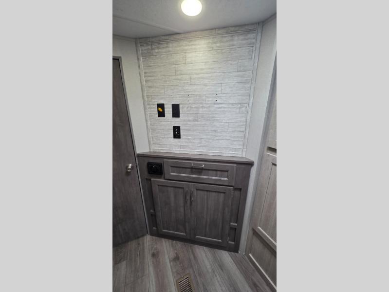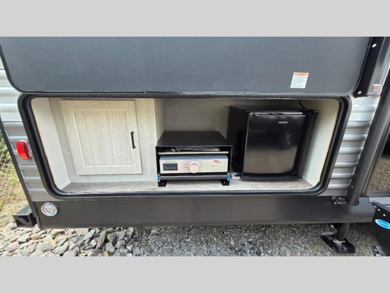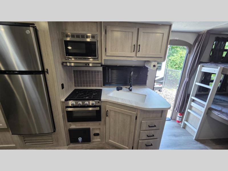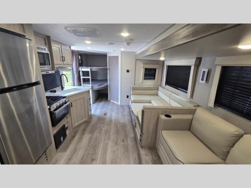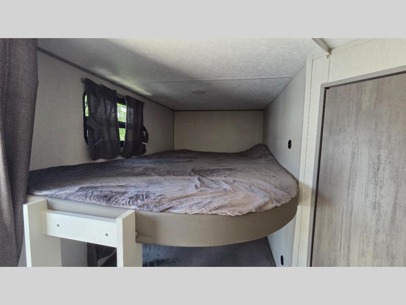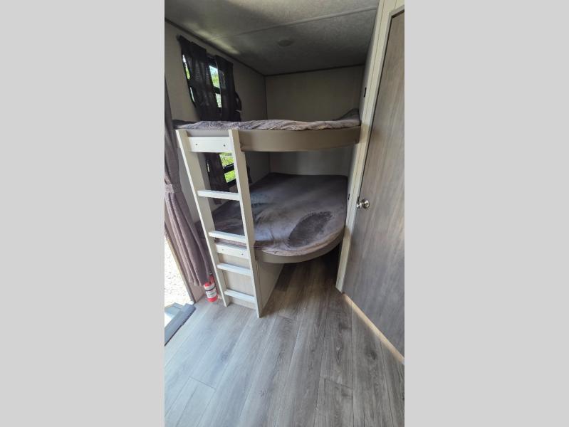 When you enjoy camping with your own accommodations and space for the whole crew, hitch this trailer up and head to the campgrounds! After loading everything easily thanks to the dual entry doors and all the interior and exterior storage, you will have no worries that you left anything behind. The electric awning is easy to set up, like the large slide out, and the awning offers multicolor LED lights to choose from by using the remote. When you are outside the cook might like to make a meal using the outside camper kitchen. The interior kitchen offers full amenities including a pantry, and everyone can enjoy the angled entertainment center. There are double-size bunks with a ladder for the kids and a walk-around queen bed for the owner to sleep on, plus furniture in the living area that doubles as additional sleeping space!