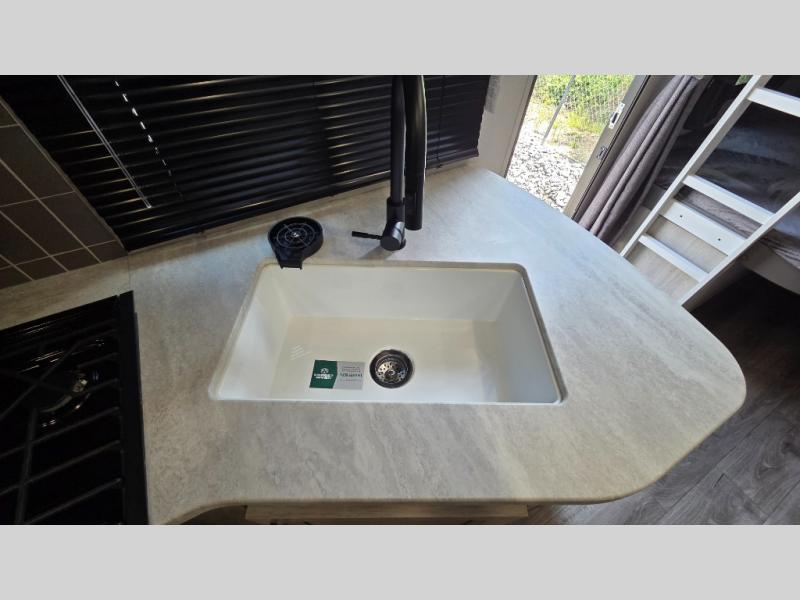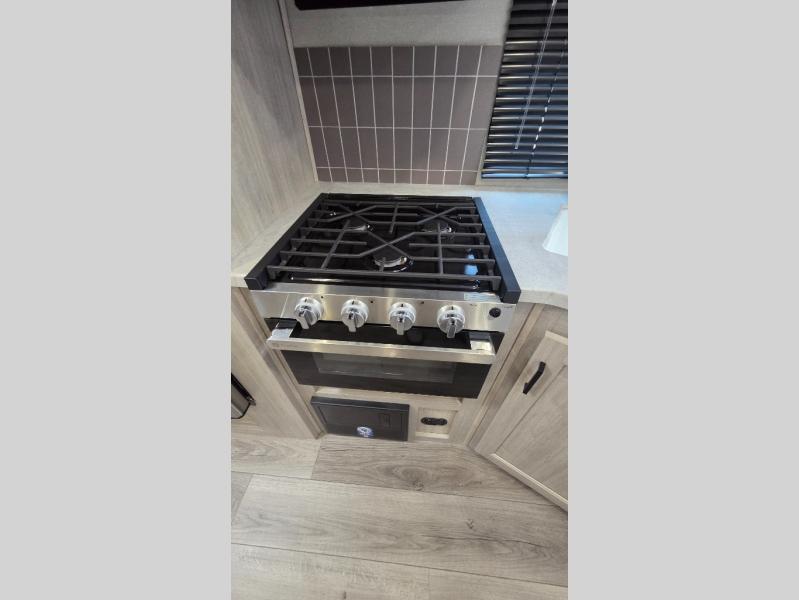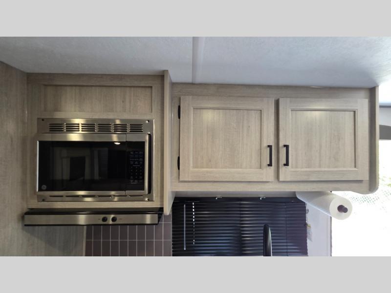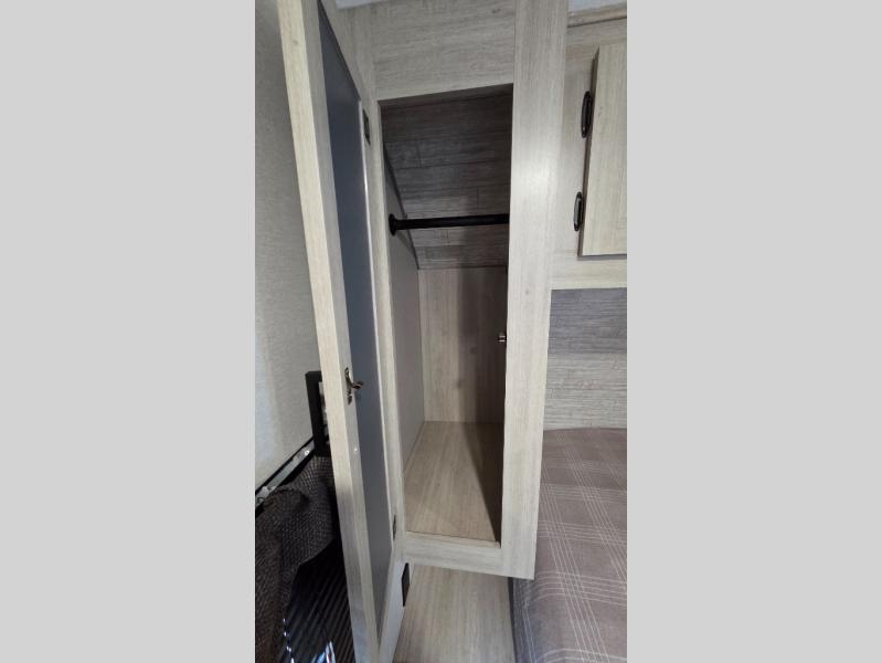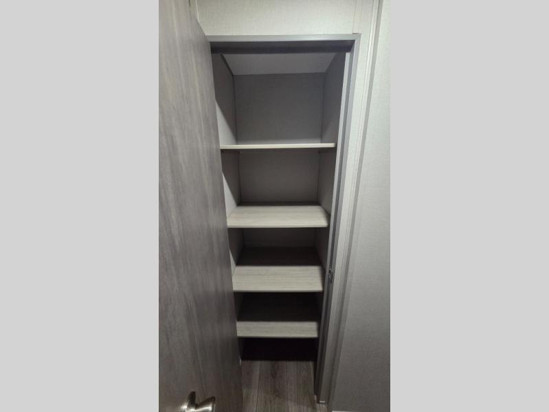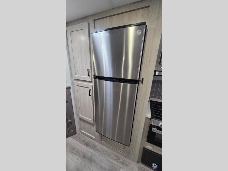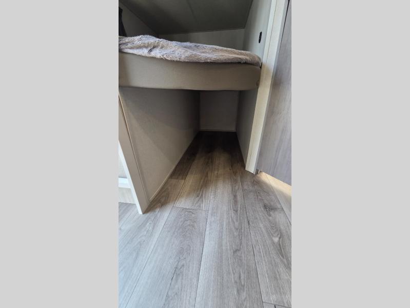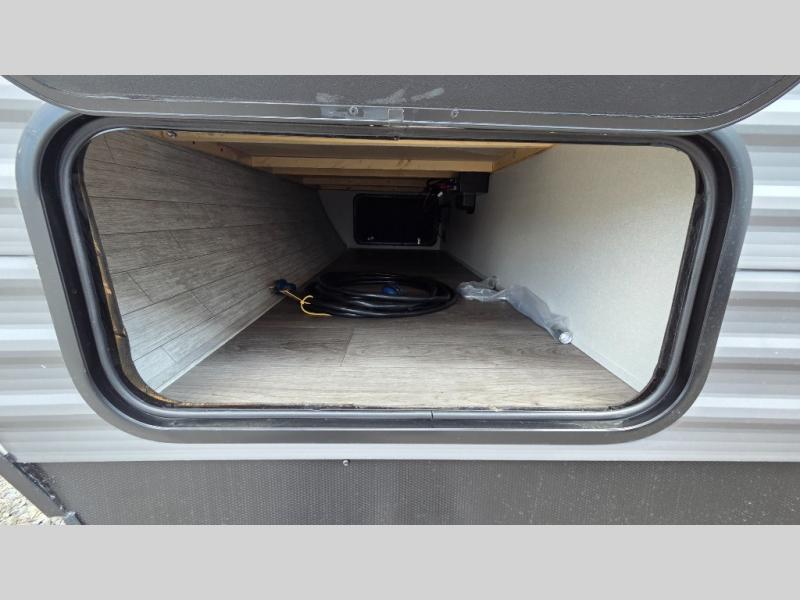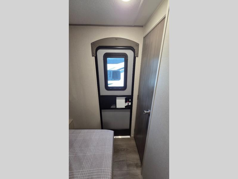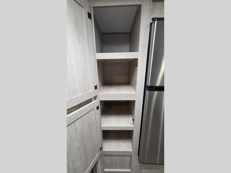 When you enjoy camping with your own accommodations and space for the whole crew, hitch this trailer up and head to the campgrounds! After loading everything easily thanks to the dual entry doors and all the interior and exterior storage, you will have no worries that you left anything behind. The electric awning is easy to set up, like the large slide out, and the awning offers multicolor LED lights to choose from by using the remote. When you are outside the cook might like to make a meal using the outside camper kitchen. The interior kitchen offers full amenities including a pantry, and everyone can enjoy the angled entertainment center. There are double-size bunks with a ladder for the kids and a walk-around queen bed for the owner to sleep on, plus furniture in the living area that doubles as additional sleeping space!