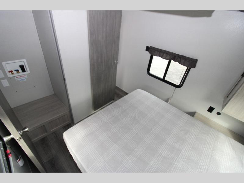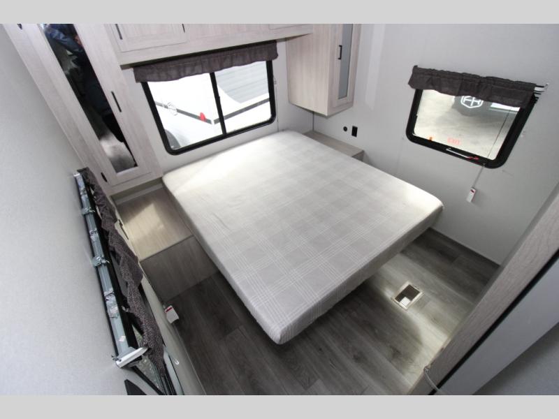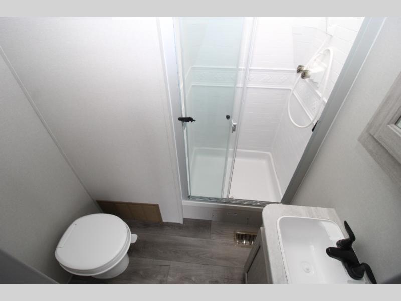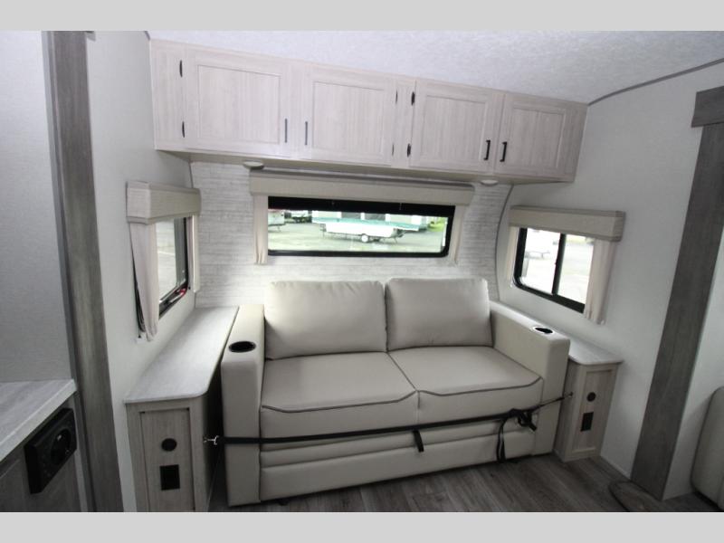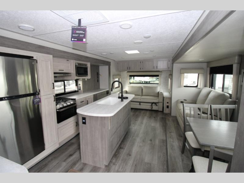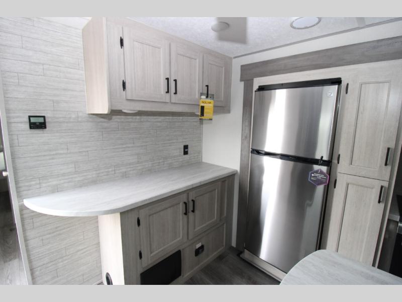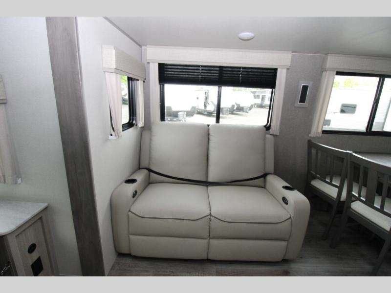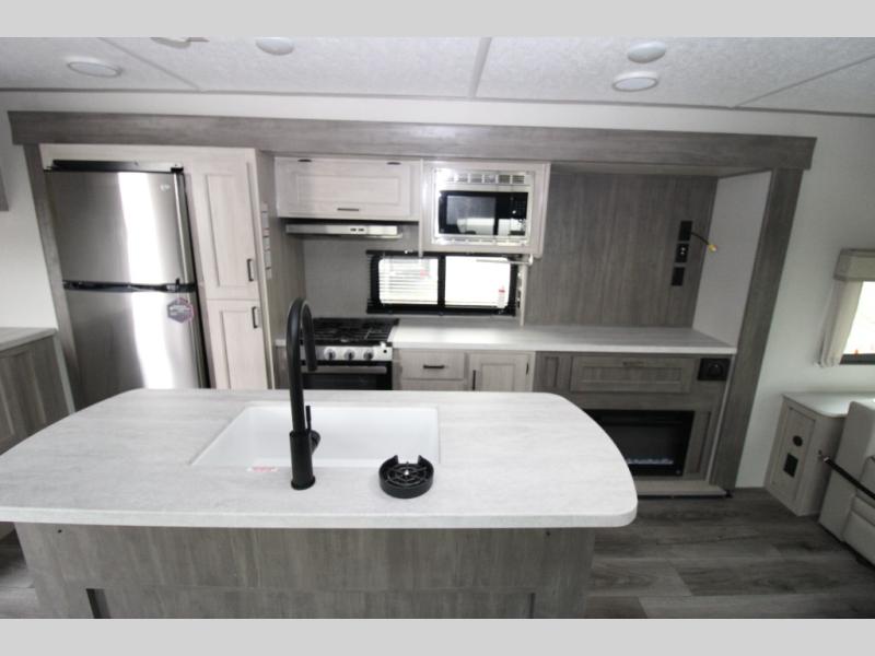 Summer camping trips just got sweeter in this spacious travel trailer that can sleep four to five each night. The dual opposing slides in the combined kitchen and living room will give your crew plenty of space to relax on the front sofa or the theater seating, and there is a booth dinette to dine at. There is even an optional fireplace if you want your space to feel a little more like home. A kitchen island with a double sink will make cooking and cleaning easier, and the bar area is sure to be a big hit when entertaining guests. The spacious full bath includes a 36" x 30" shower with a skylight and a convenient medicine cabinet to keep things tidy. When you're ready to turn in for the night, the rear bedroom with an RV queen bed is sure to bring a great night's rest. There are also dual wardrobes to keep your clothes organized and a closet with washer and dryer prep if you want the option to make laundry day easier.