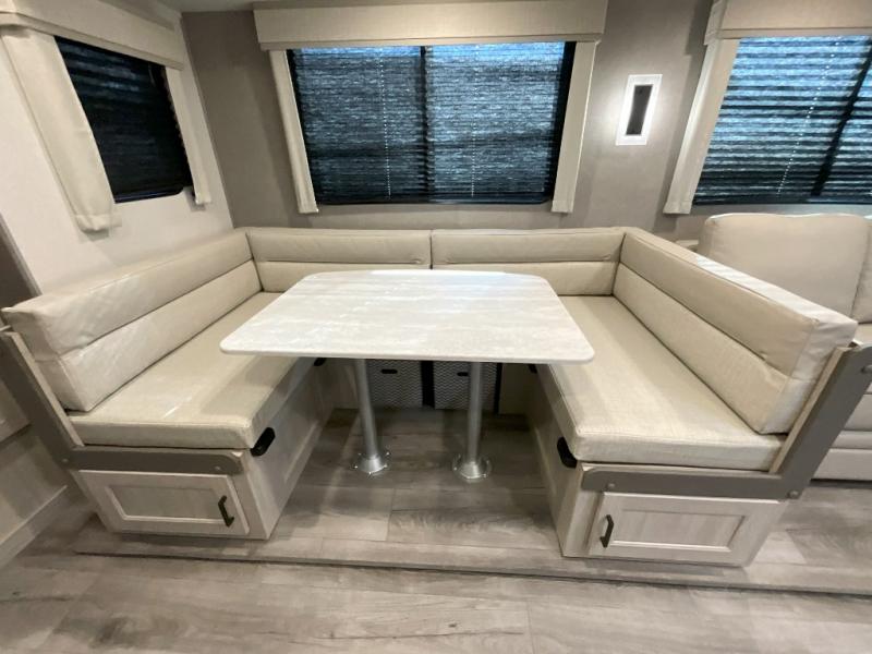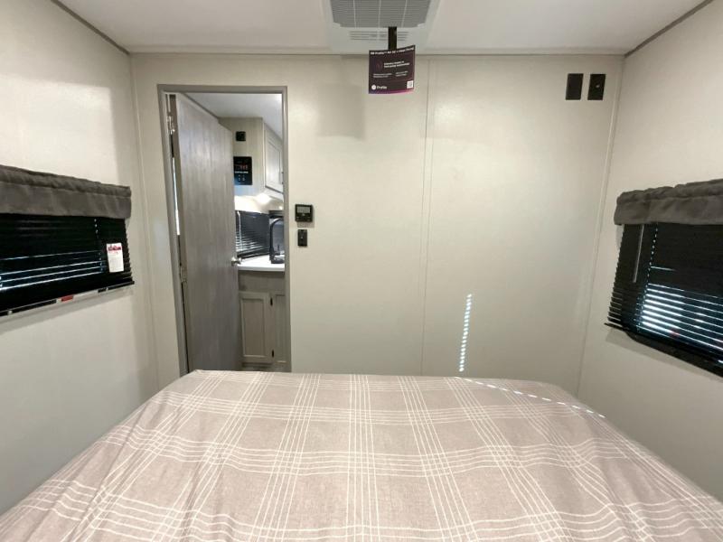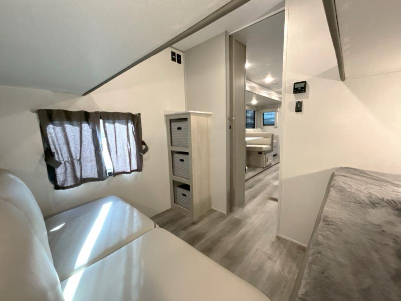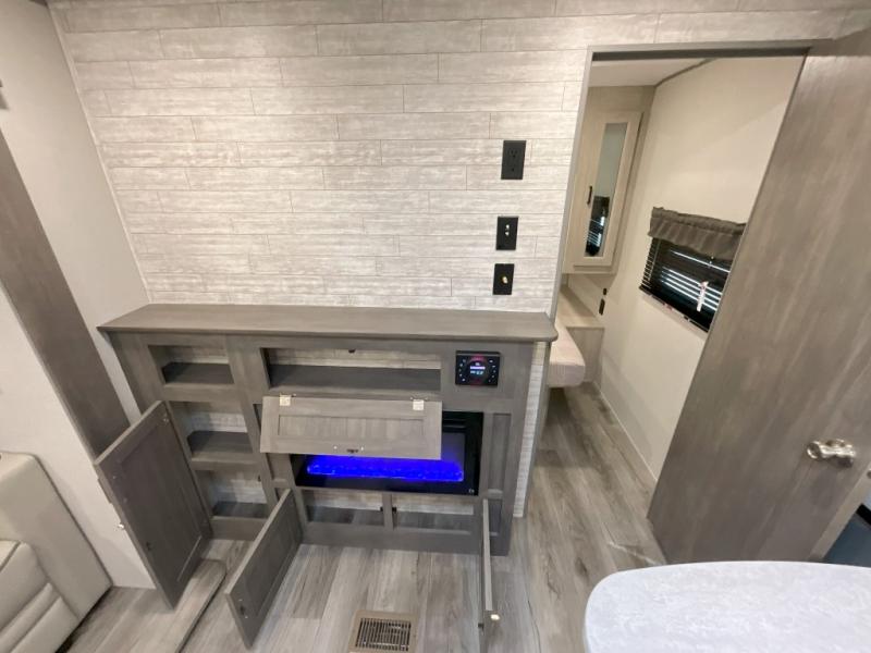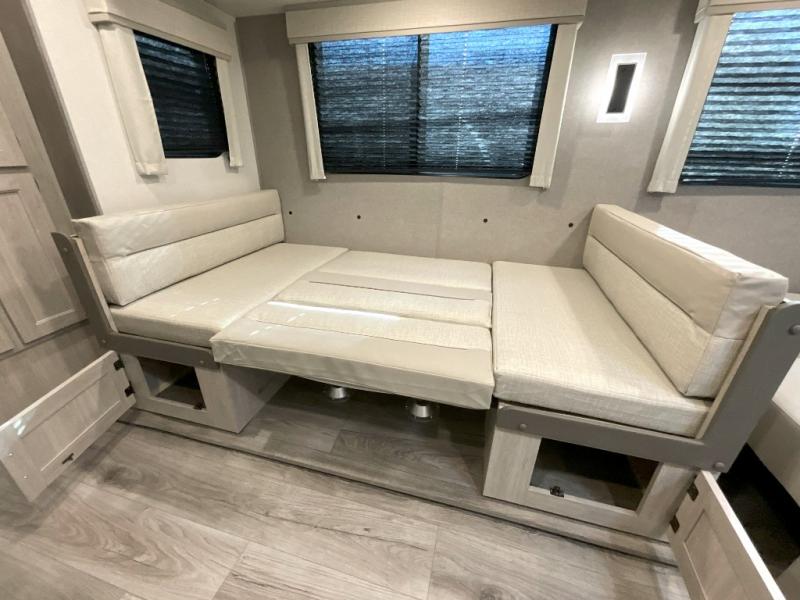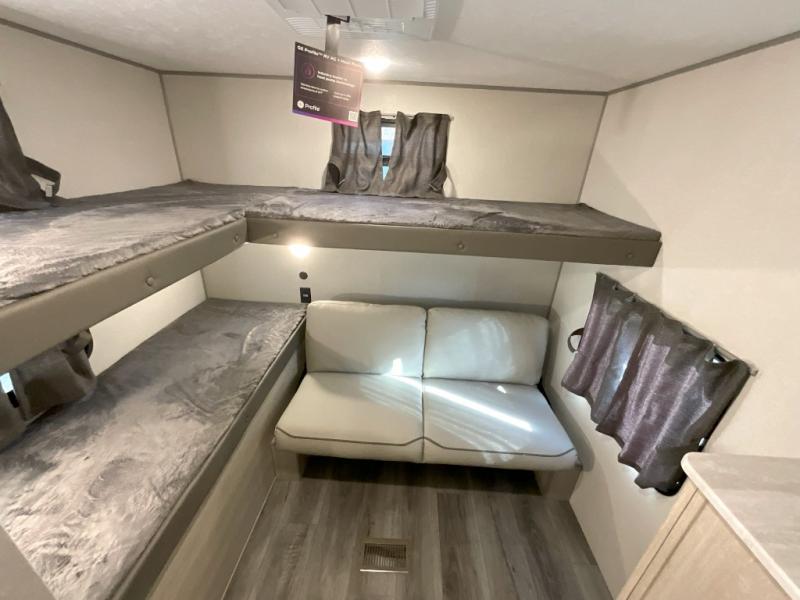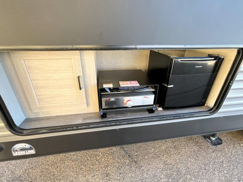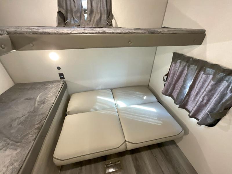 Not only will you be comfortable in this trailer, your friends will have comfort and privacy thanks to having their own bunkhouse, and you'll have a front bedroom where you can sleep like royalty! There are three bunk beds and two COA cube seats plus a location for a TV, a wardrobe, and windows for natural lighting. The combined living and kitchen is spacious thanks to the slide out U-shaped dinette and sofa with drink holders. You can even add the fireplace option if you want that feature. The cook will have full amenities to whip up meals including overhead cabinets for dishes and snacks. And the exterior camper kitchen allows the cook to visit with everyone outside under the 18' electric awning that includes multicolor LED lights with a remote.
