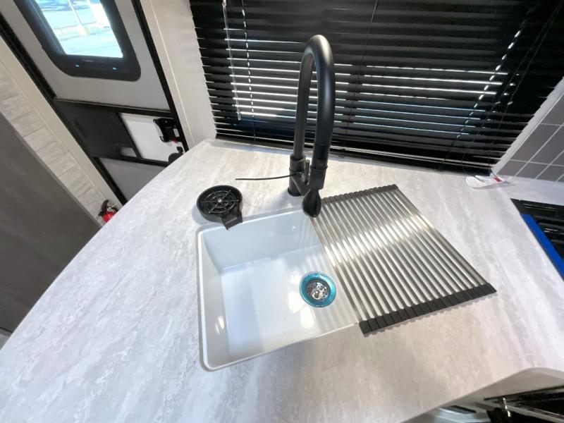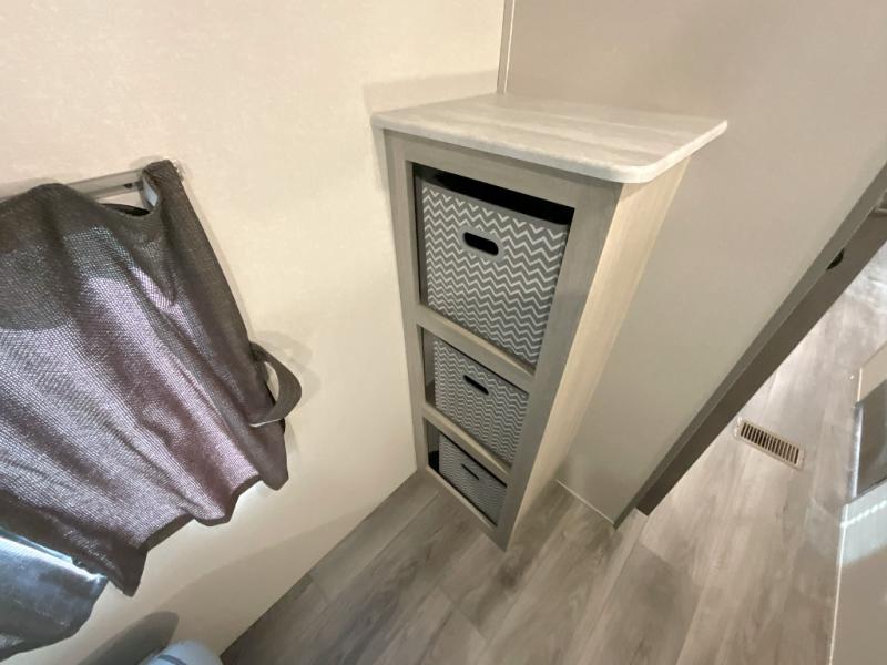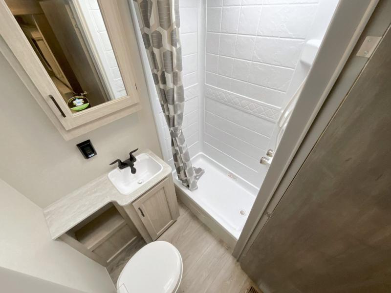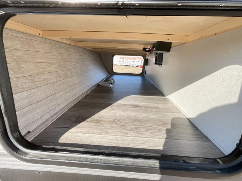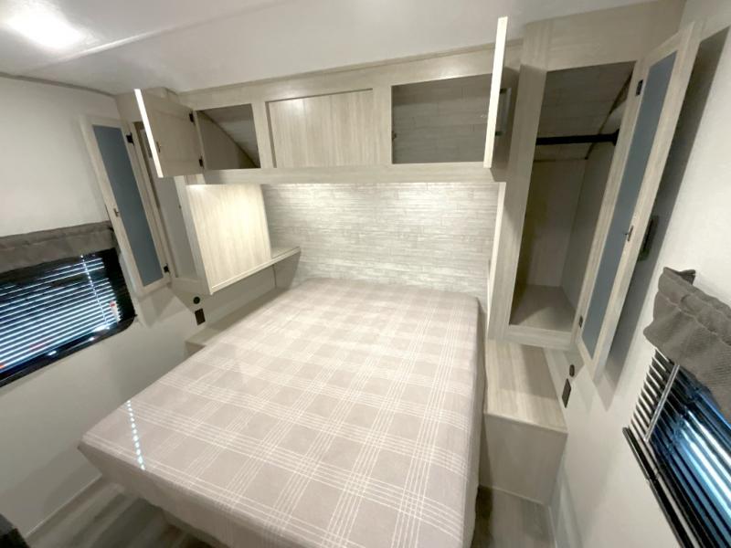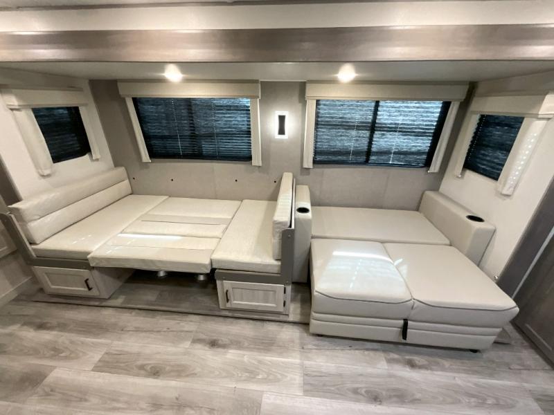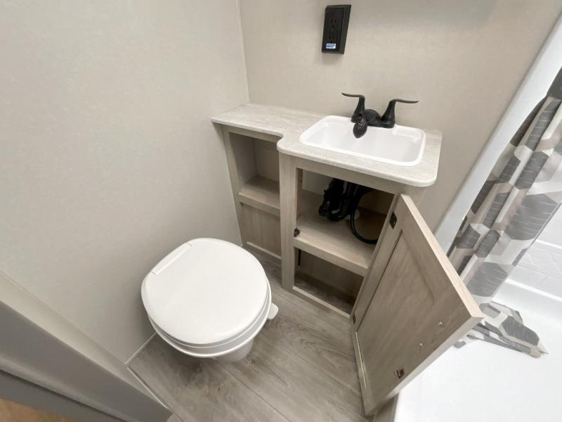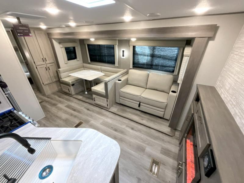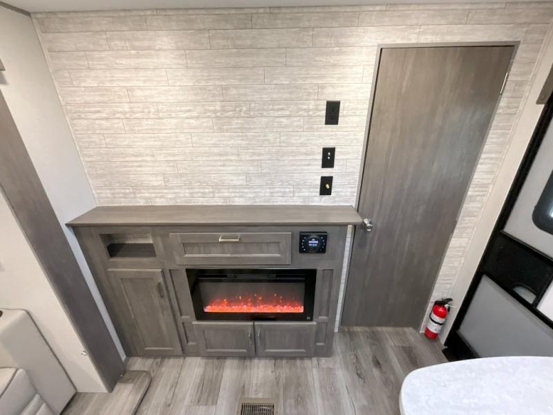 Not only will you be comfortable in this trailer, your friends will have comfort and privacy thanks to having their own bunkhouse, and you'll have a front bedroom where you can sleep like royalty! There are three bunk beds and two COA cube seats plus a location for a TV, a wardrobe, and windows for natural lighting. The combined living and kitchen is spacious thanks to the slide out U-shaped dinette and sofa with drink holders. You can even add the fireplace option if you want that feature. The cook will have full amenities to whip up meals including overhead cabinets for dishes and snacks. And the exterior camper kitchen allows the cook to visit with everyone outside under the 18' electric awning that includes multicolor LED lights with a remote.