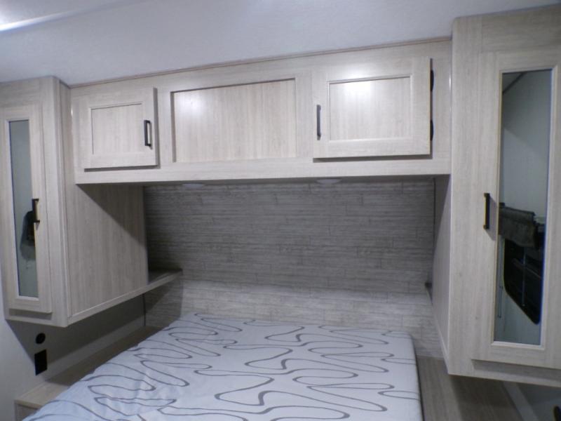 Not only will you be comfortable in this trailer, your friends will have comfort and privacy thanks to having their own bunkhouse, and you'll have a front bedroom where you can sleep like royalty! There are three bunk beds and a jack knife sofa with storage totes below plus a TV cabinet if you want to add a television here. The combined living and kitchen is spacious thanks to the slide out U-shaped dinette and sofa with drink holders. You can even add the fireplace option if you want that feature. The cook will have full amenities to whip up meals including overhead cabinets for dishes and snacks. And the exterior camper kitchen allows the cook to visit with everyone outside under the 18' electric awning that includes multicolor LED lights with a remote.
