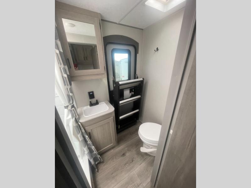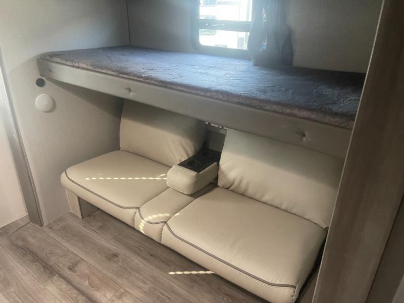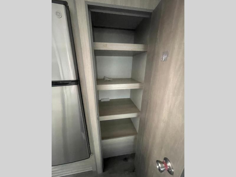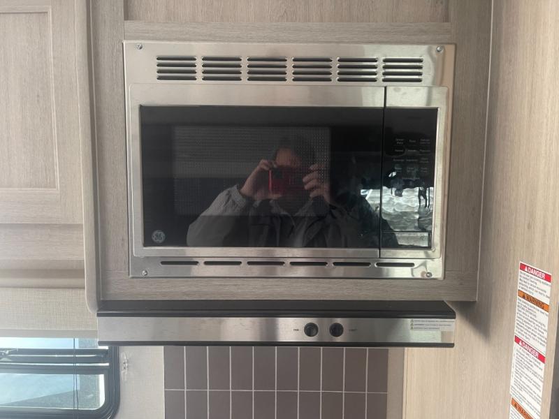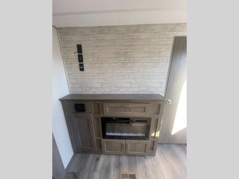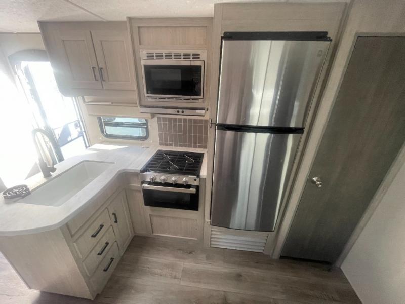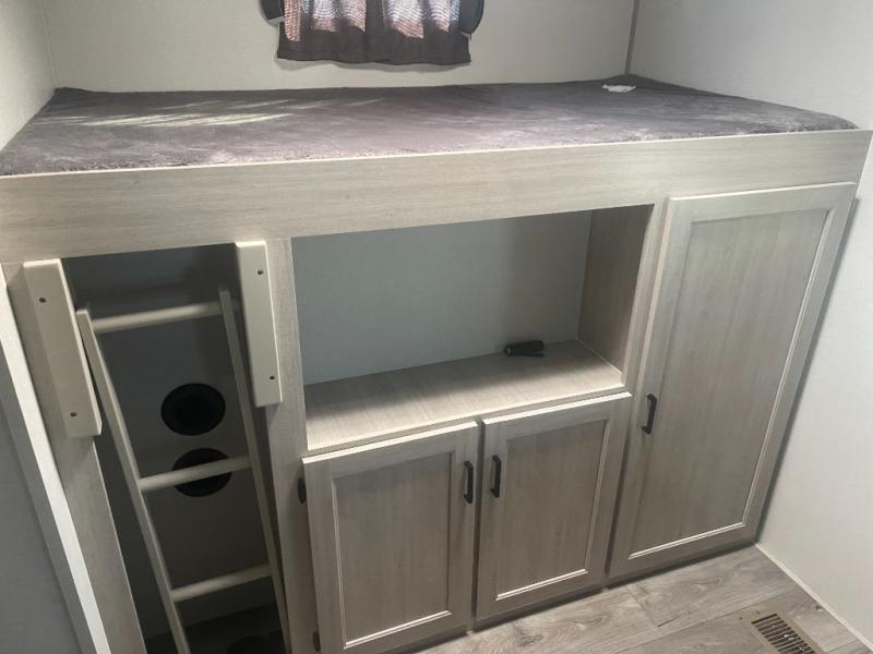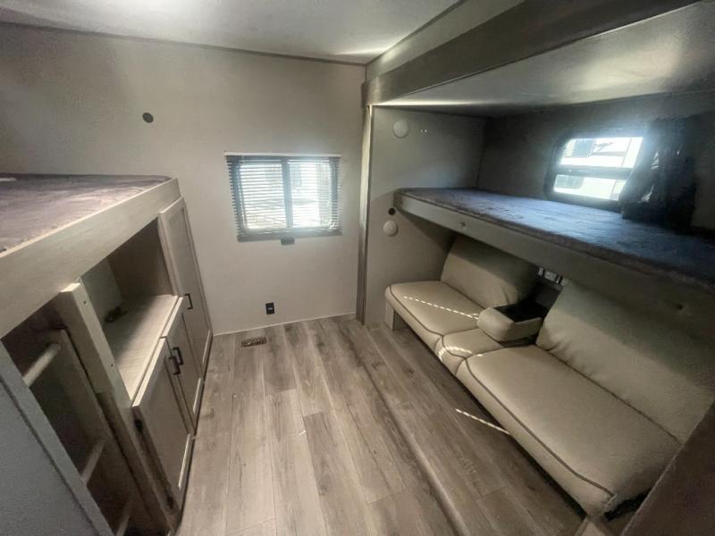 If you enjoy hiking, biking, and fishing, and waking up to beautiful scenery from your own comforts, then start camping with this trailer at the campsite! You will be able to sleep like a queen on the walk-around bed with dual wardrobes and overhead storage for more items in the front private bedroom while your family or friends have their own privacy in the bunkhouse complete with two bunks, a jack knife sofa with storage totes below and a TV/wardrobe cabinet for even more storage. The full bathroom includes the second entry/exit door for convenience when outside under the 21' electric awning with multicolor LED lights, or while cooking using the full size camper kitchen along the exterior. There are full kitchen amenities inside including a 10 cu. ft. refrigerator and a pantry.