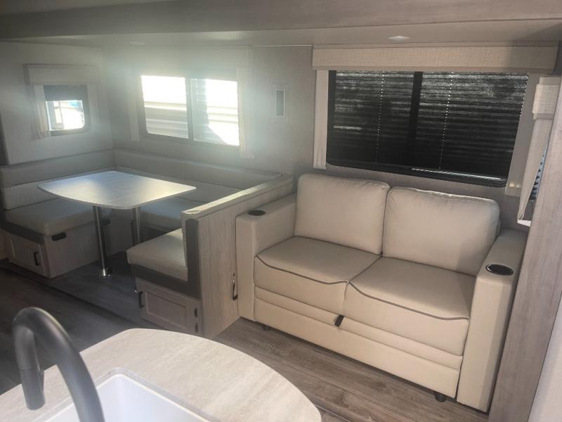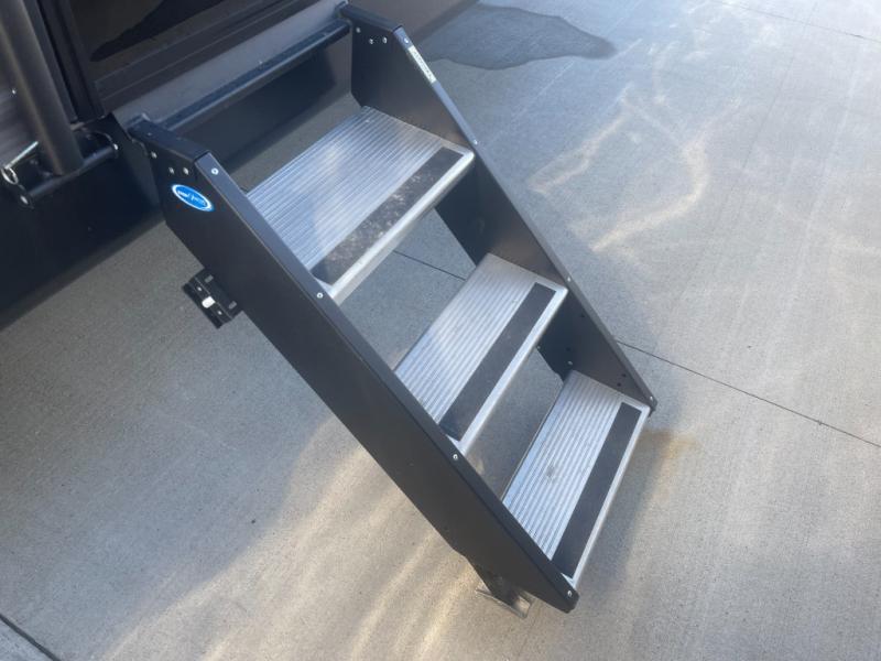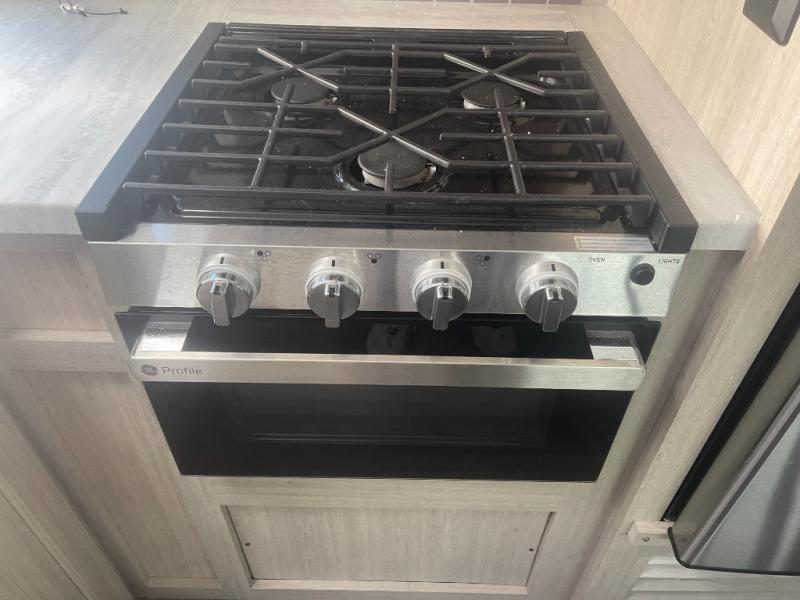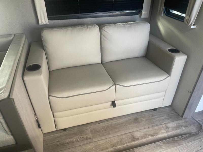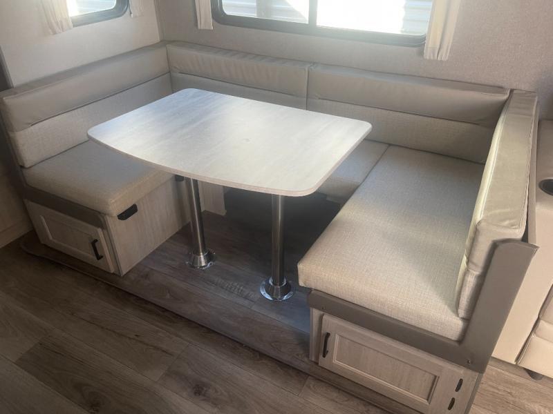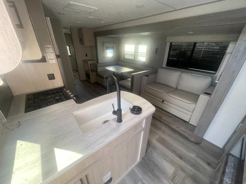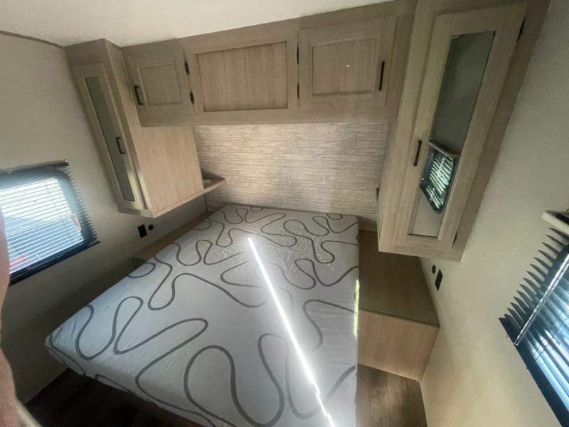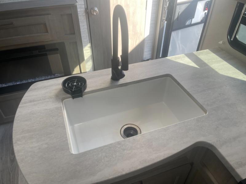 If you enjoy hiking, biking, and fishing, and waking up to beautiful scenery from your own comforts, then start camping with this trailer at the campsite! You will be able to sleep like a queen on the walk-around bed with dual wardrobes and overhead storage for more items in the front private bedroom while your family or friends have their own privacy in the bunkhouse complete with two bunks, a jack knife sofa with storage totes below and a TV/wardrobe cabinet for even more storage. The full bathroom includes the second entry/exit door for convenience when outside under the 21' electric awning with multicolor LED lights, or while cooking using the full size camper kitchen along the exterior. There are full kitchen amenities inside including a 10 cu. ft. refrigerator and a pantry.