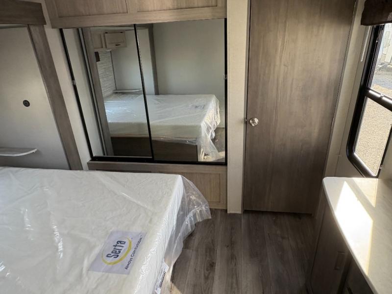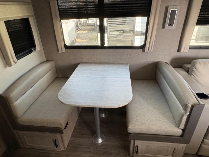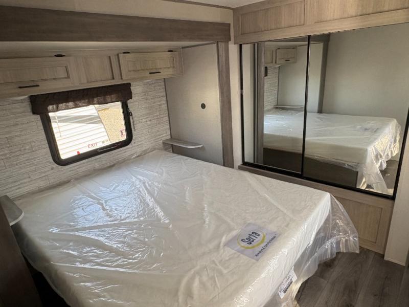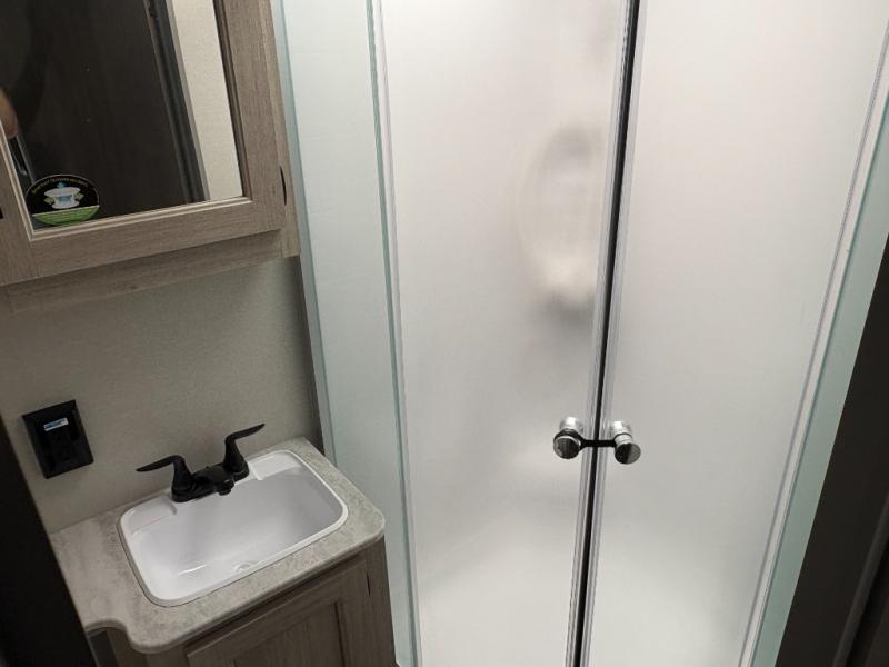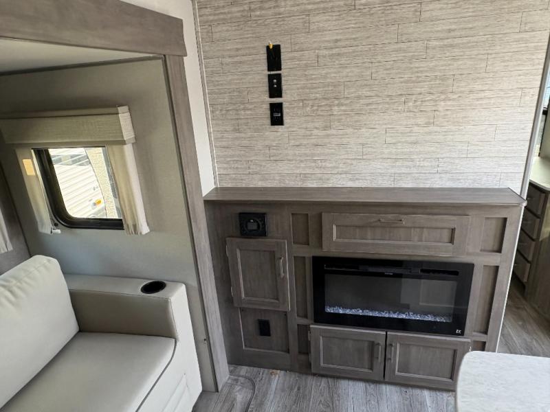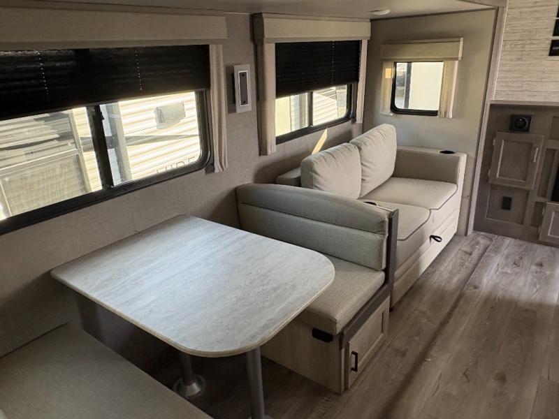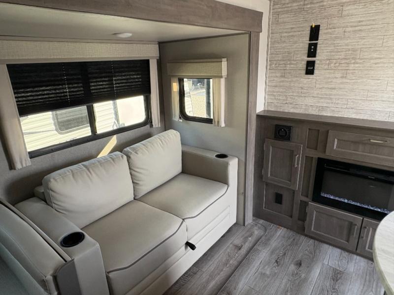 This family-friendly trailer offers lots of floor space thanks to the triple slides throughout! You and your family will love the combined living and kitchen area with a slide out booth dinette and a sofa with drink holders. The L-shaped kitchen counter allows the cook to make meals without moving for anyone trying to get to the full bathroom or the rear bunkhouse. The kids will have their own privacy, two bunk beds, a jack knife sofa with storage totes below plus a TV/wardrobe cabinet. The front private bedroom allows you to sleep like royalty, and offers a large closet for your clothing and another closet prepped for a washer/dryer. And don't forget about the full size camper kitchen and the 21' power awning with multicolor LED lights when you are outside.