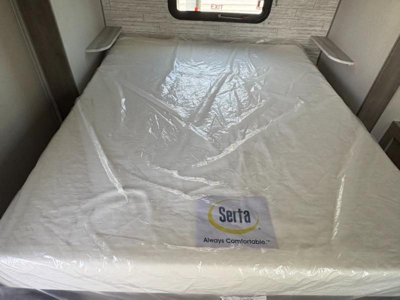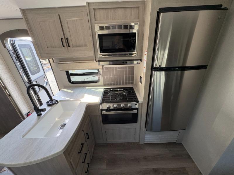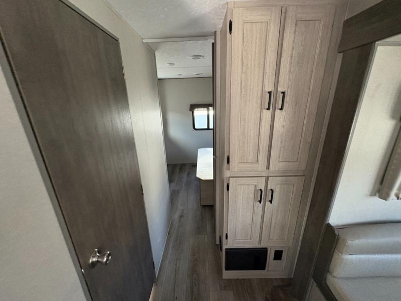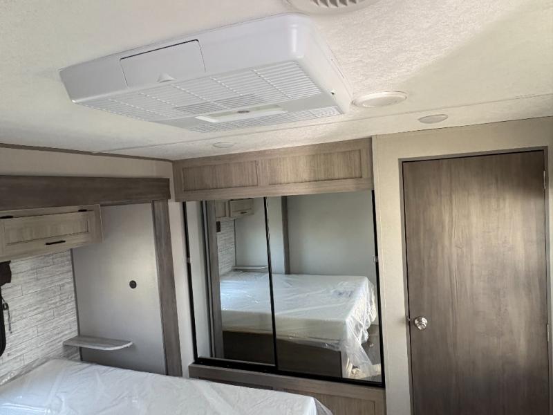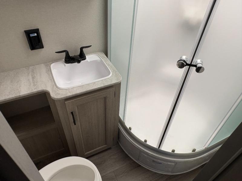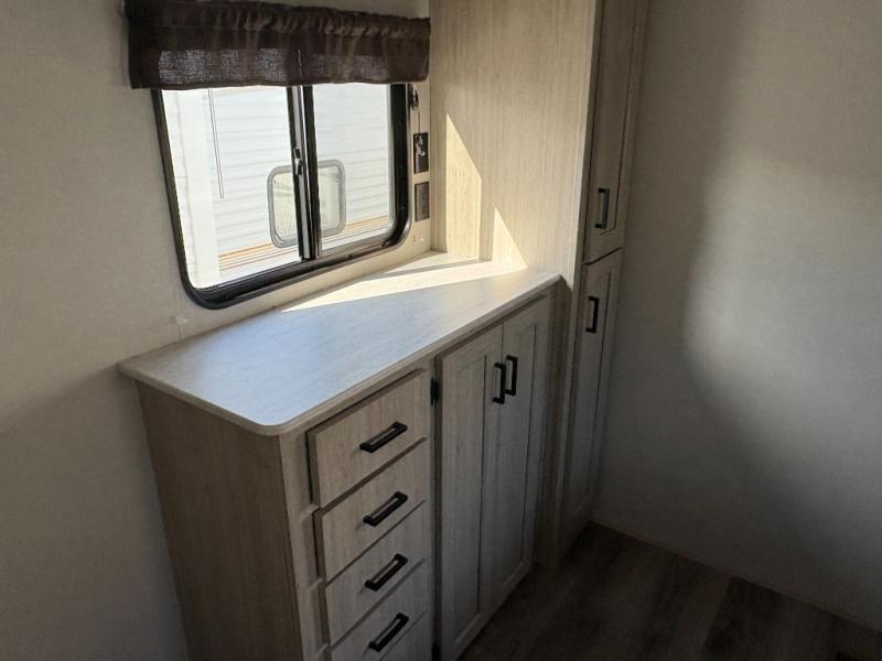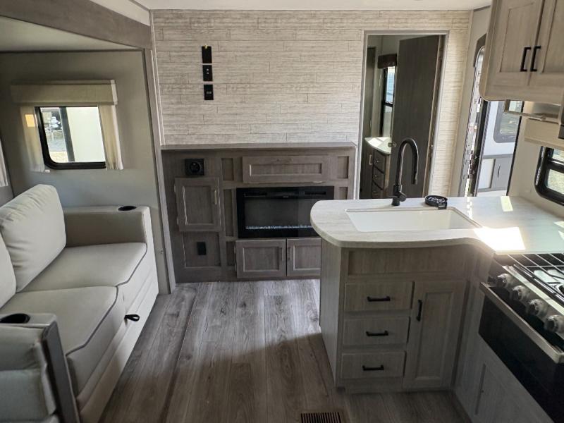 This family-friendly trailer offers lots of floor space thanks to the triple slides throughout! You and your family will love the combined living and kitchen area with a slide out booth dinette and a sofa with drink holders. The L-shaped kitchen counter allows the cook to make meals without moving for anyone trying to get to the full bathroom or the rear bunkhouse. The kids will have their own privacy, two bunk beds, a jack knife sofa with storage totes below plus a TV/wardrobe cabinet. The front private bedroom allows you to sleep like royalty, and offers a large closet for your clothing and another closet prepped for a washer/dryer. And don't forget about the full size camper kitchen and the 21' power awning with multicolor LED lights when you are outside.
