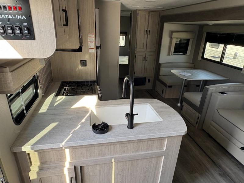 Each Catalina Legacy travel trailer by Coachmen is constructed with a cambered structural steel I-beam frame for added strength and support, plus an enclosed and fully sealed corrugated underbelly to extend your camping season. There is also a seamless Alpha roof membrane, R-7 insulation throughout, full length frame outriggers, plus many more durable construction materials. You will love the 6' 9" interior height, along with Congoleum woodplank linoleum flooring, seamless Thermofoil countertops, and hard valance window treatments. Choose a Catalina Legacy today!