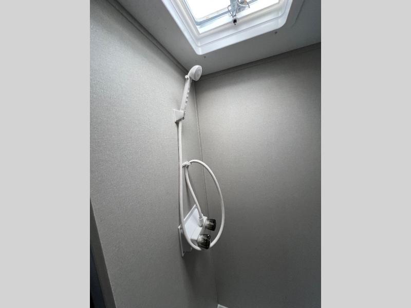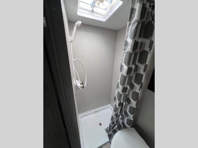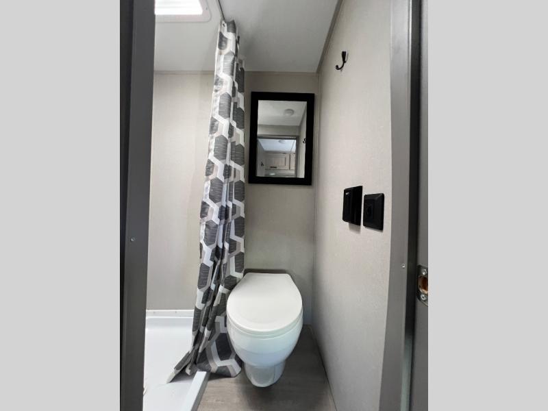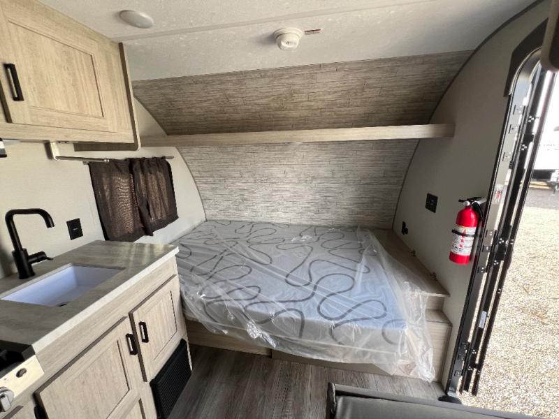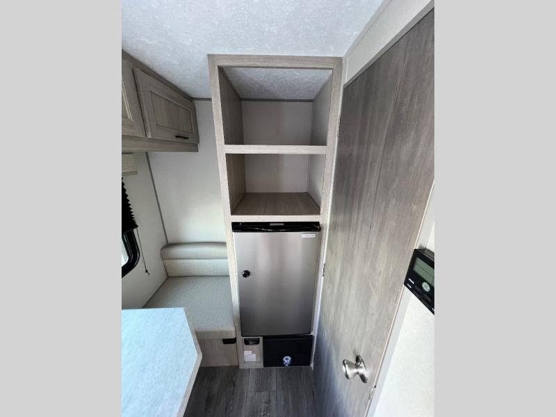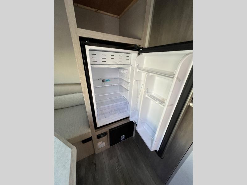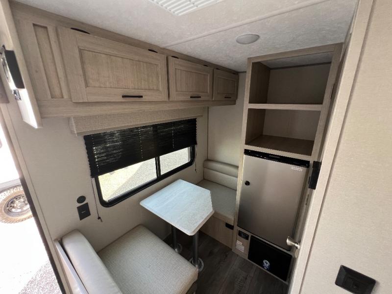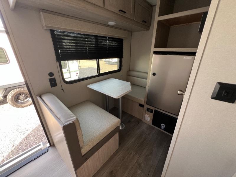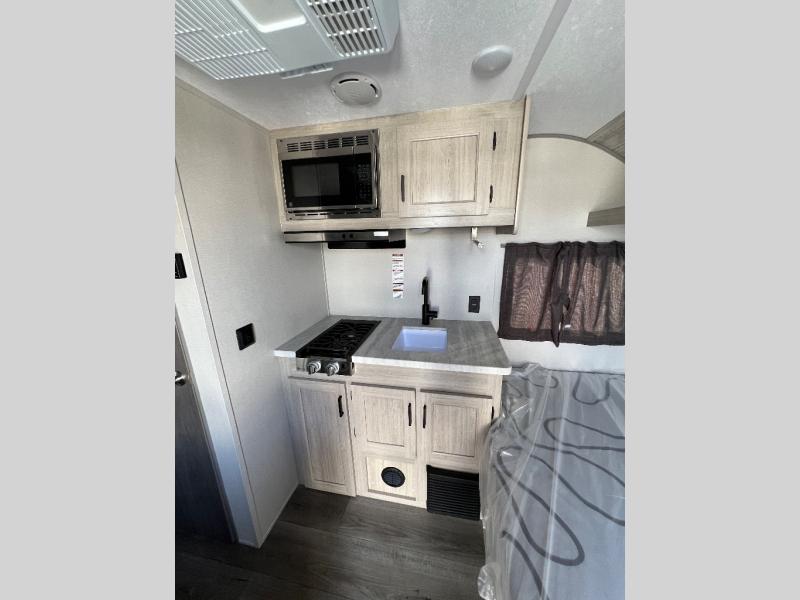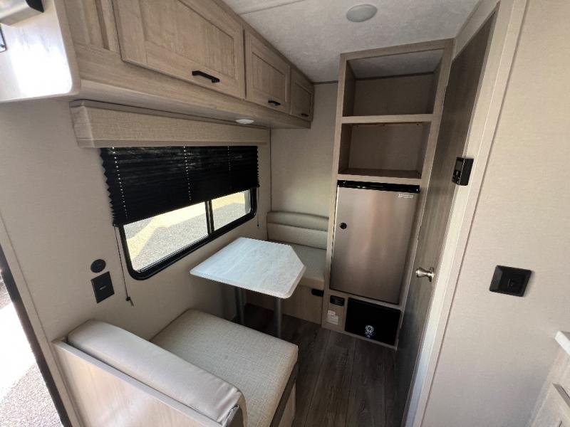 Lightweight camping is easier than you think with this travel trailer in tow! The front 54" x 74" queen bed will provide a great night's rest each night, while your overnight guest takes the booth dinette. There is a handy shelf above the front bed for your belongings plus additional bedroom storage. A private bath includes a 24" x 32" shower and a toilet with a mirror behind it so you can freshen up each day. You'll also find a two burner cooktop and microwave oven to make meals each day plus a 3.3 cu. ft. 12V refrigerator for food storage!