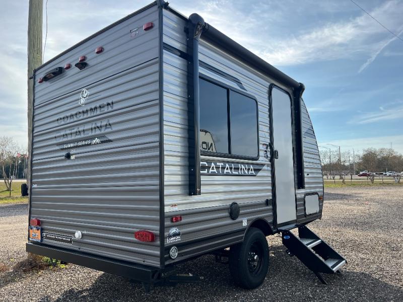 With any Catalina Summit Series 7' by Coachmen RV, you can create an easier adventure with the versatility and simplicity of the shorter lengths and lighter weights! Each includes a premium exterior graphics package, a smooth HD aluminum radius front, and EZ lube axles with leaf spring suspension. The exterior offers a heavy duty standard tongue jack, a diamond plate rock guard to protect against road debris, exterior RG-6 coax cabling and satellite prep, rear view camera prep, and flush mount baggage doors with radius corners for your outdoor gear. Inside, you will enjoy a premium JBL interior speaker, USB charging ports, seamless Thermofoil countertops throughout, a deep basin farm style sink for easy cleanup, and GE kitchen appliances. It's time to choose an affordable and maneuverable single axle trailer today!