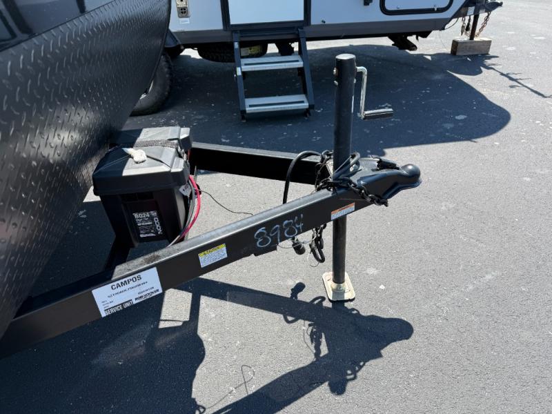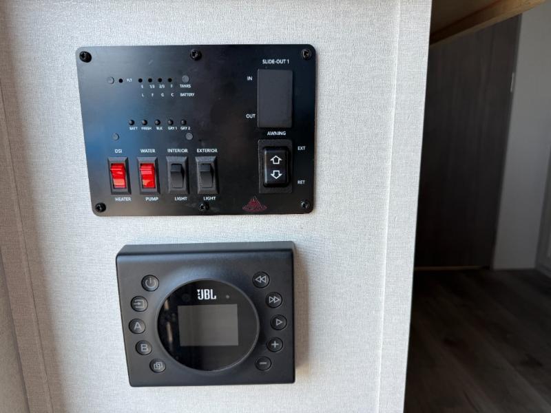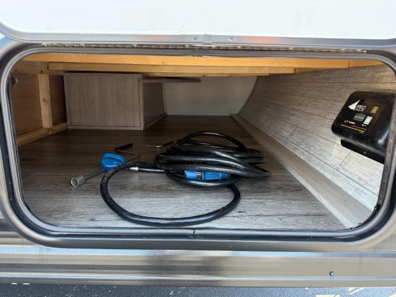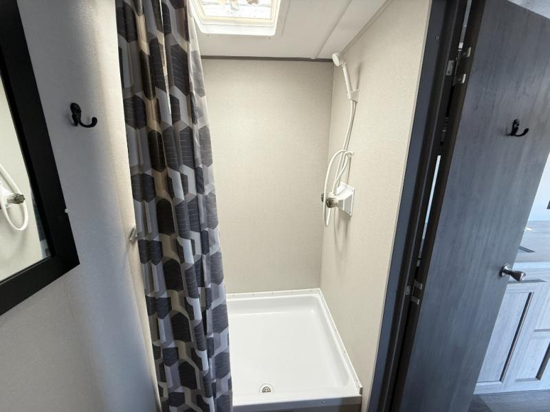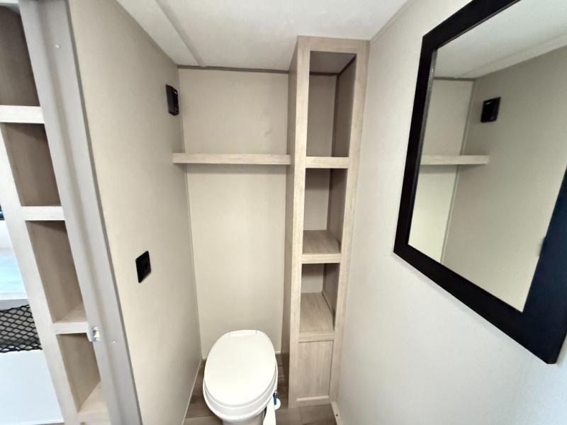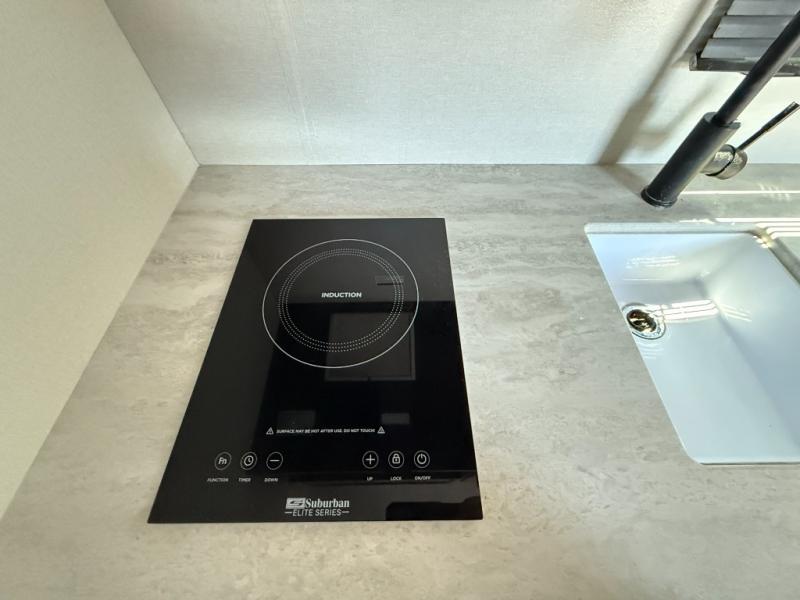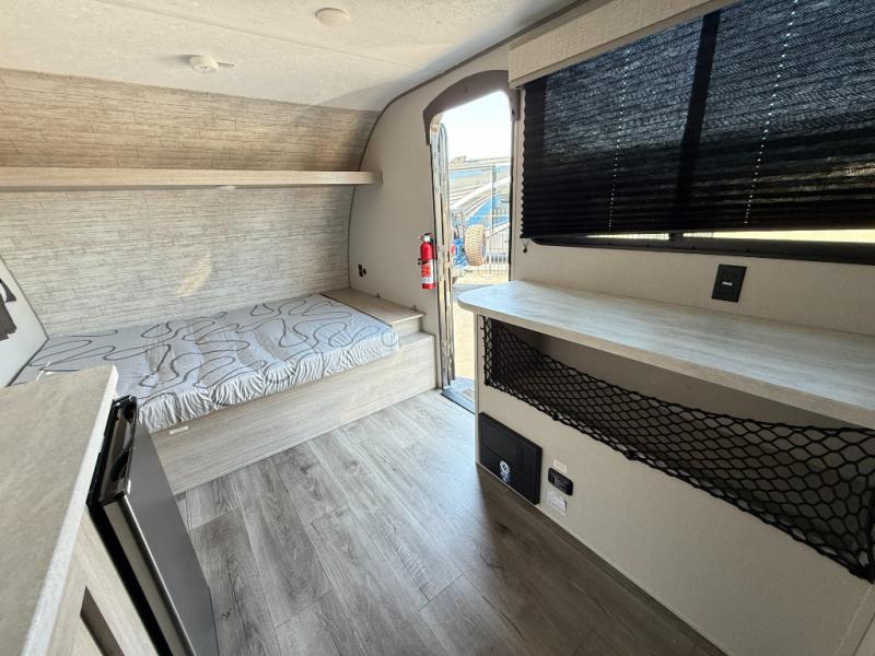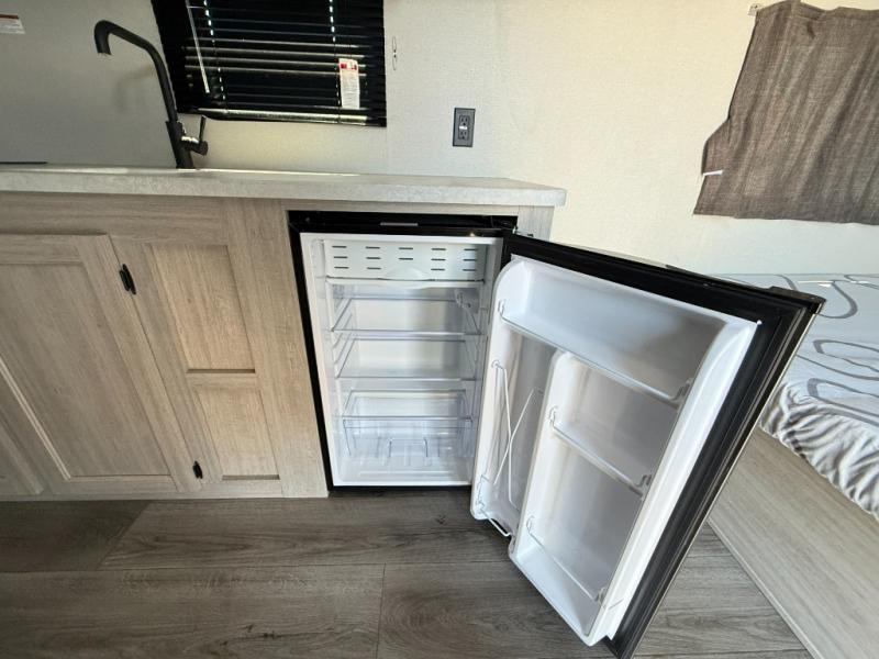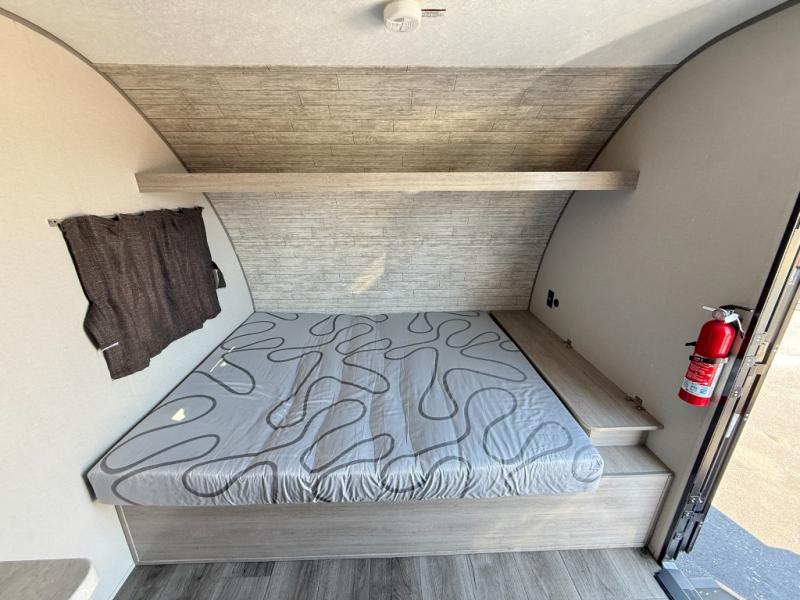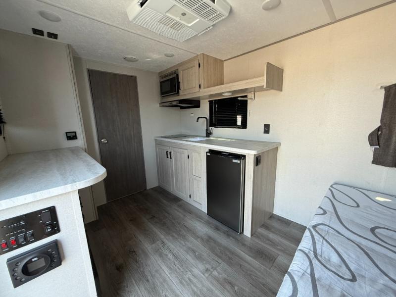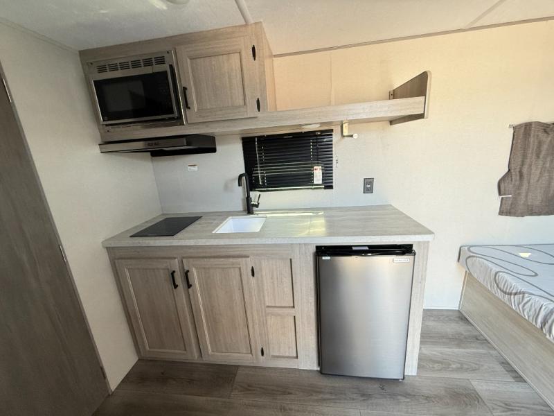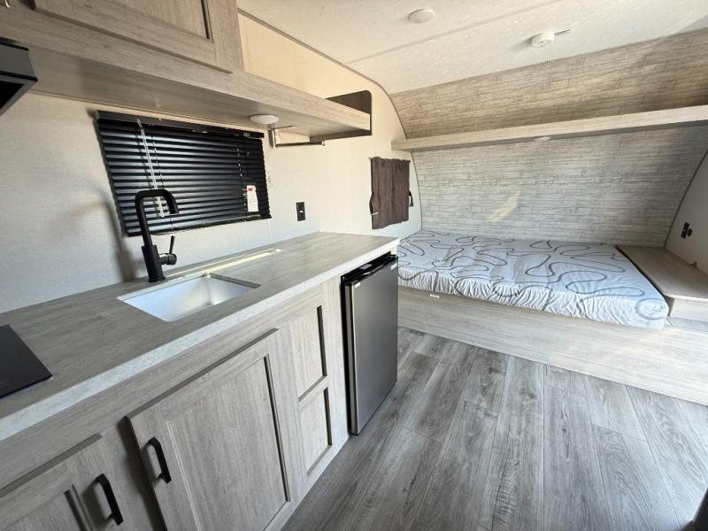 This couple's trailer will be perfect for all your outdoor adventures! There is a 60" x 74" Murphy bed up front with dual nightstands to keep your things tidy, and in the morning, you can fold up the bed to relax on the sofa. The bar top with two stools also includes storage below, plus there is a pantry and overhead storage for even more storage space. A full rear bath includes a 36" x 30" shower, a 12V 14" bath power vent fan, a marine toilet with foot flush, plus a linen closet to keep clean towels close by. This model also includes full kitchen amenities, including a GE two burner cooktop, a GE stainless microwave oven, plus a 3.3 cu. ft. 12V refrigerator to keep food fresh!