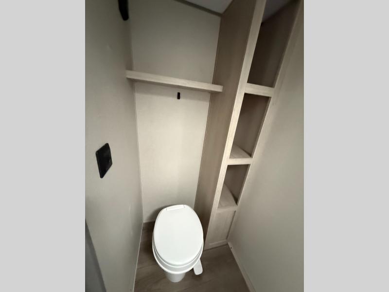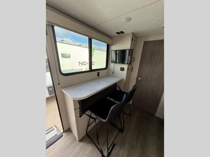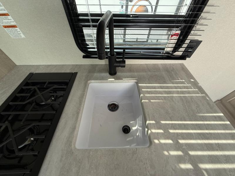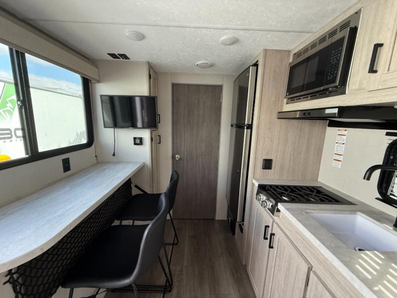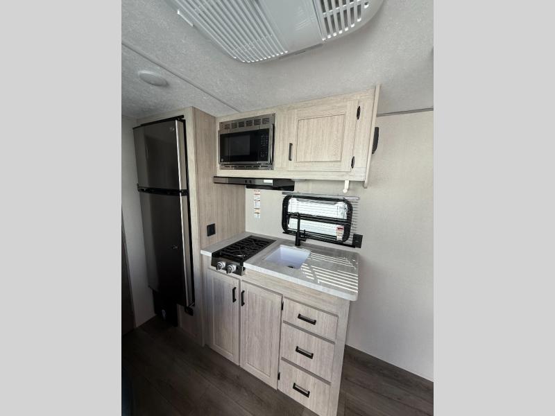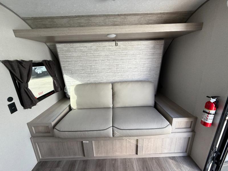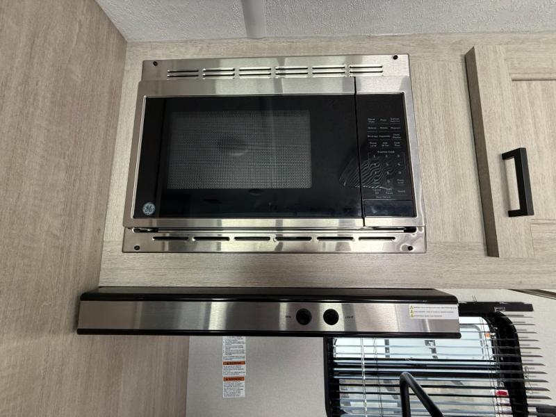This couple's trailer will be perfect for all your outdoor adventures! There is a 60" x 74" Murphy bed up front with dual nightstands to keep your things tidy, and in the morning, you can fold up the bed to relax on the sofa. The bar top with two stools also includes storage below, plus there is a pantry and overhead storage for even more storage space. A full rear bath includes a 36" x 30" shower, a 12V 14" bath power vent fan, a marine toilet with foot flush, plus a linen closet to keep clean towels close by. This model also includes full kitchen amenities, including a GE two burner cooktop, a GE stainless microwave oven, plus a 3.3 cu. ft. 12V refrigerator to keep food fresh!
