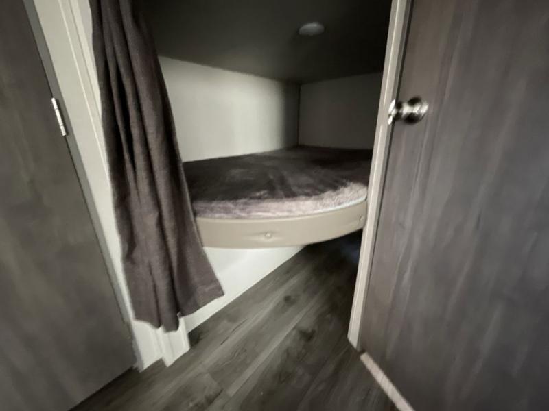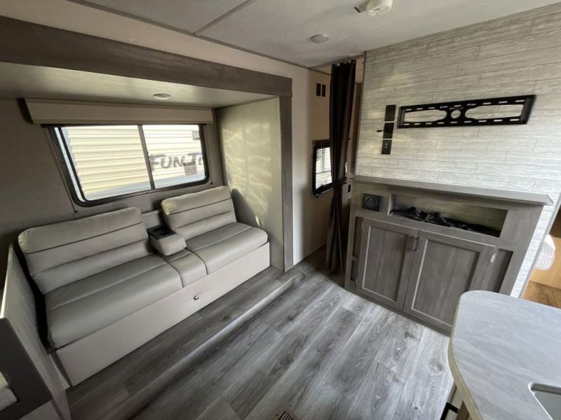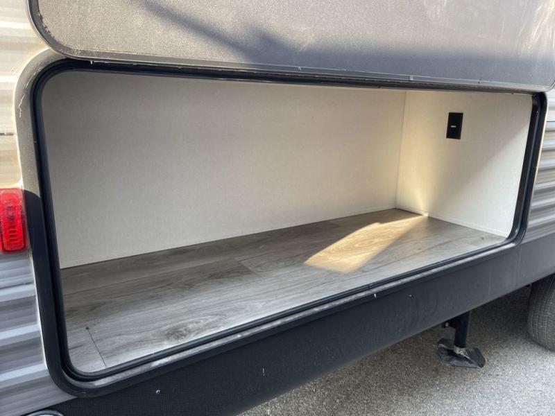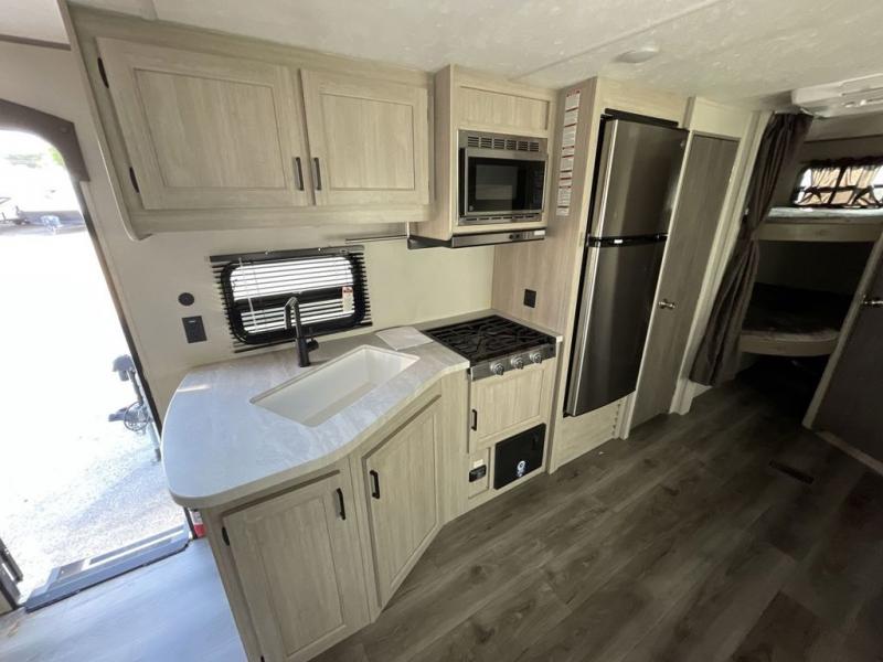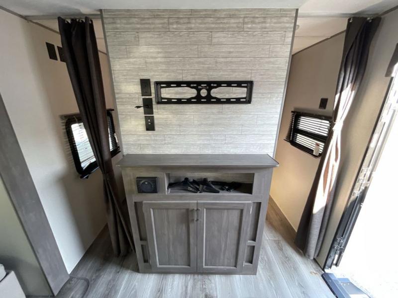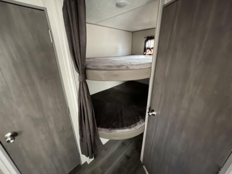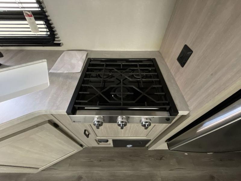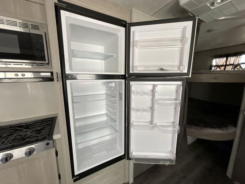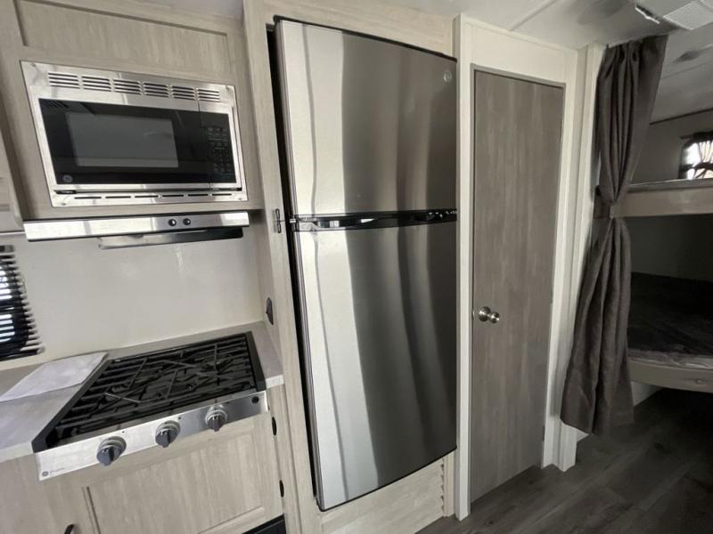 This is the perfect mid-size travel trailer for you and your family! The 46" x 74" double-size bunk beds with lower interior storage offer a comfortable sleeping space for the kids and you will have your own private sleeping space with the 60" x 74" queen bed in the front private bedroom. Freshen up each morning in the rear corner bathroom with the tub/shower and a mirror to get ready each morning. You can prepare your best home cooked meals with the GE stainless three burner cooktop and GE stainless 10.7 cu. ft. 12V refrigerator, then enjoy them together at the booth dinette. The sofa is near the entertainment center for a relaxing movie night. Don't leave any of your outdoor gear behind either thanks to the front pass-through storage area and the exterior outside storage area. You could even add the optional outside camper kitchen to grill the catch of the day on the pull out griddle!