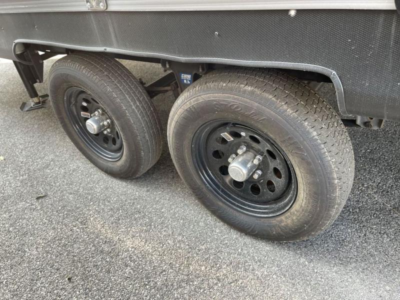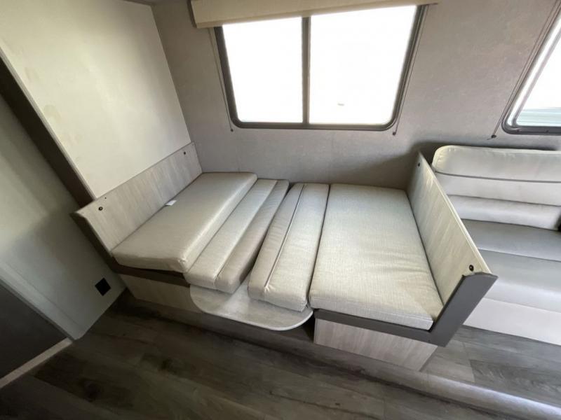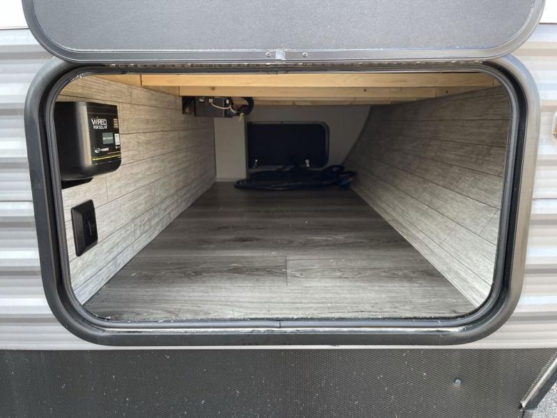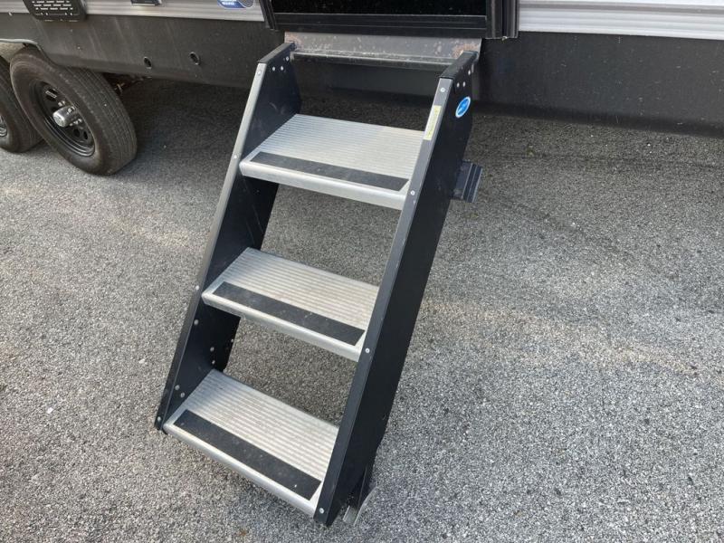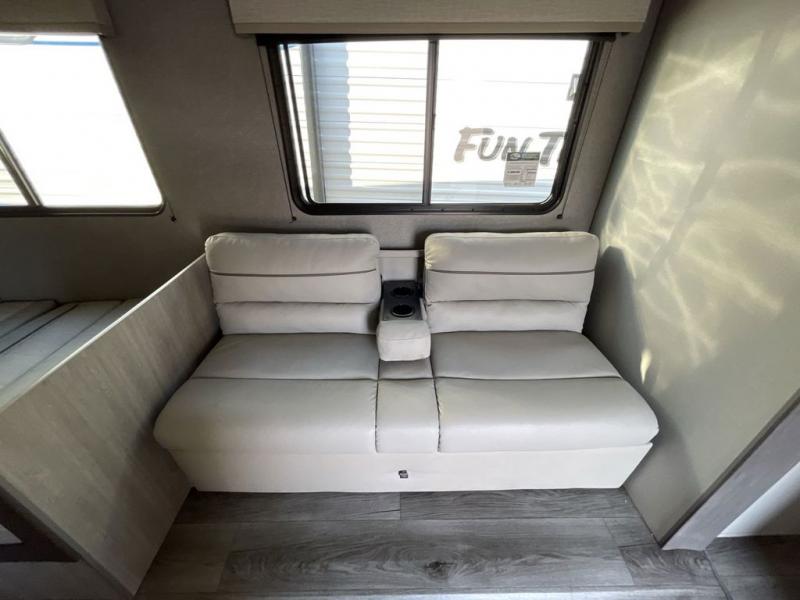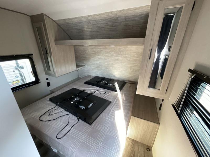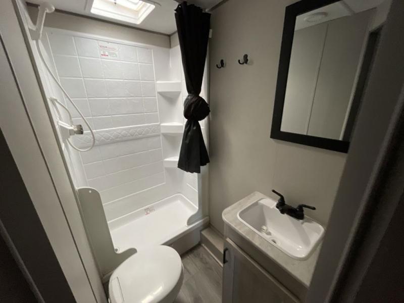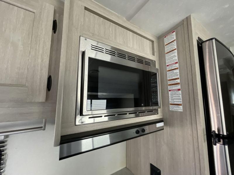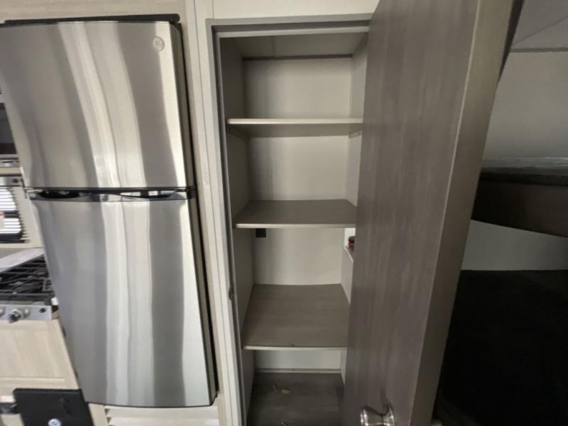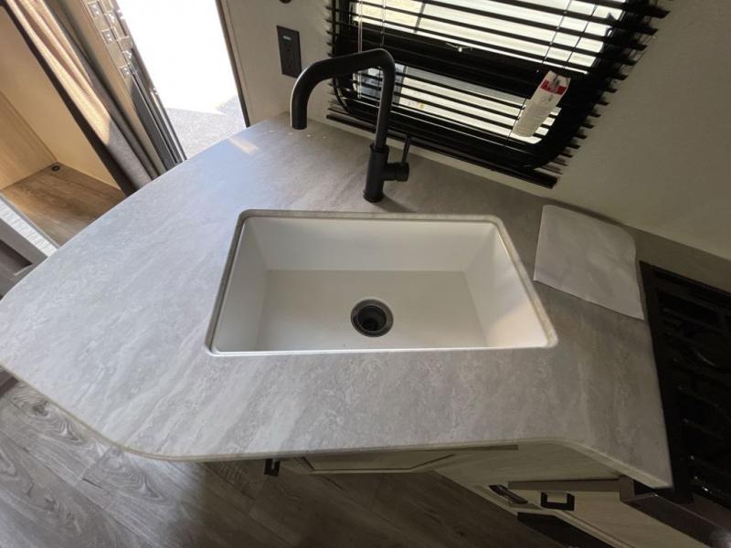 This is the perfect mid-size travel trailer for you and your family! The 46" x 74" double-size bunk beds with lower interior storage offer a comfortable sleeping space for the kids and you will have your own private sleeping space with the 60" x 74" queen bed in the front private bedroom. Freshen up each morning in the rear corner bathroom with the tub/shower and a mirror to get ready each morning. You can prepare your best home cooked meals with the GE stainless three burner cooktop and GE stainless 10.7 cu. ft. 12V refrigerator, then enjoy them together at the booth dinette. The sofa is near the entertainment center for a relaxing movie night. Don't leave any of your outdoor gear behind either thanks to the front pass-through storage area and the exterior outside storage area. You could even add the optional outside camper kitchen to grill the catch of the day on the pull out griddle!
