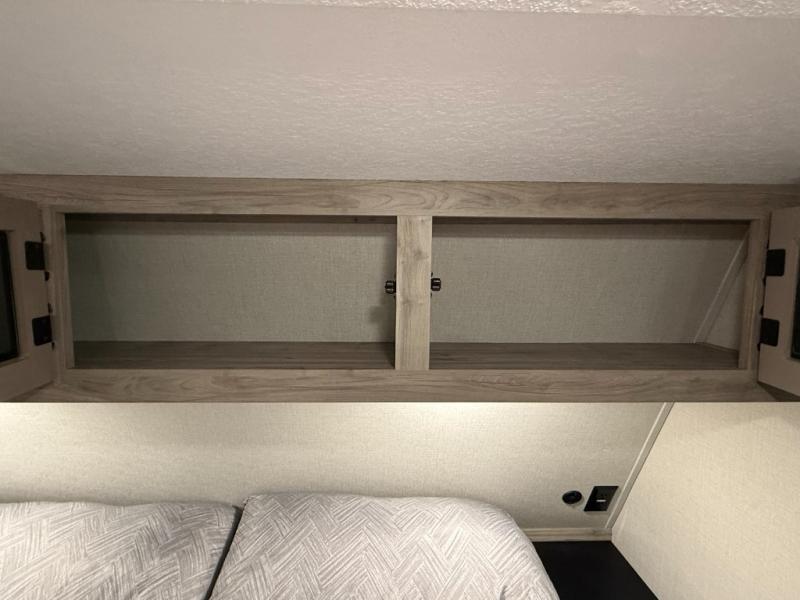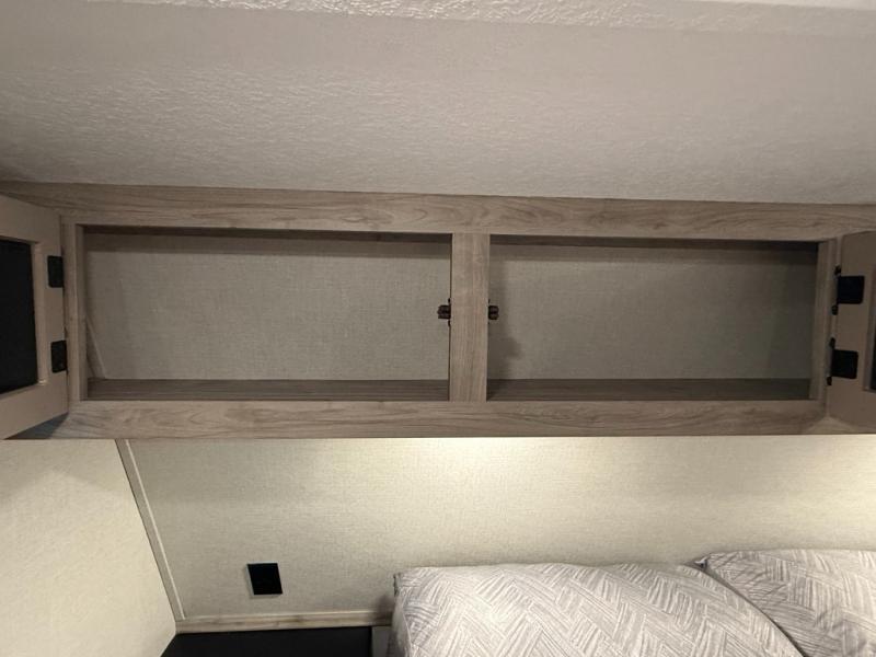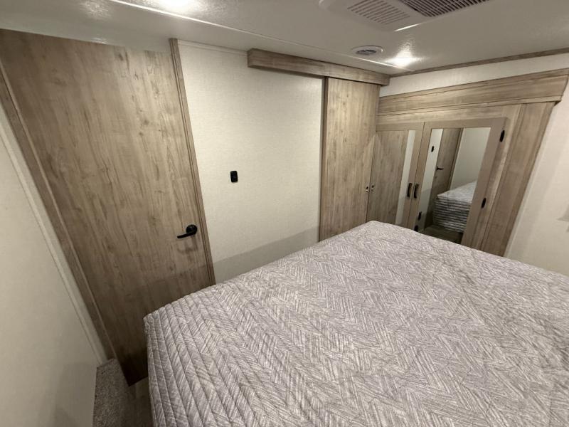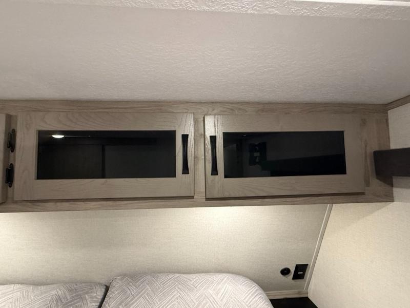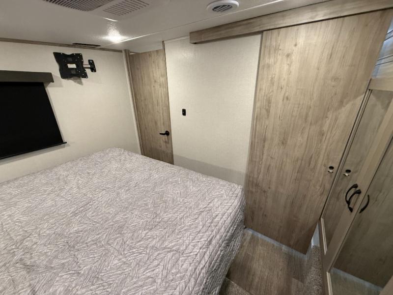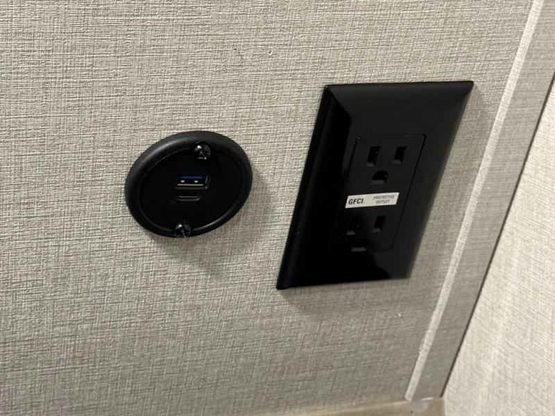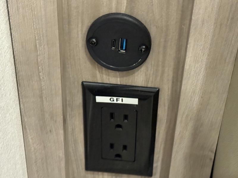 Bedroom includes USB/USB-C ports at bedside, 110 V outlets, blackout roller shades, ducted A/C vents (select) and upgraded nightstands/wrap-around ledge in some models.