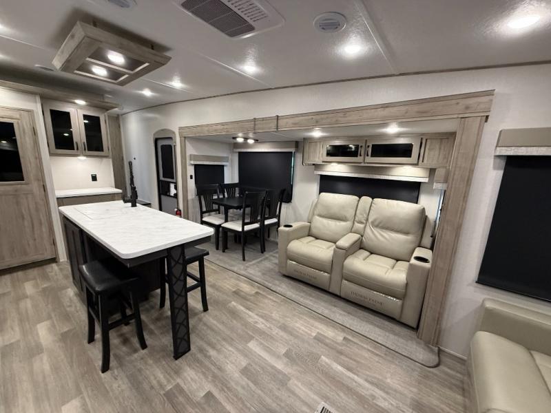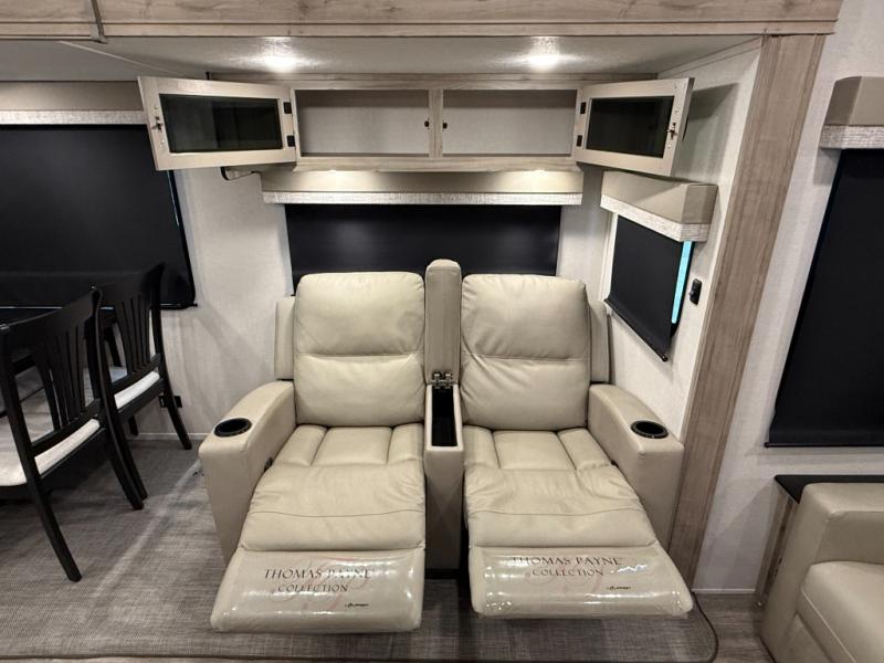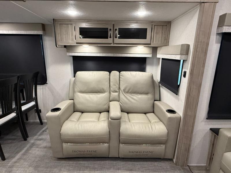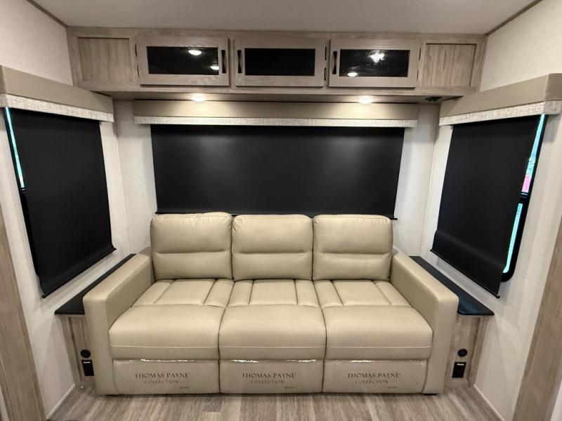 Rear living area: Includes seating (e.g., a 78" tri-fold sofa or theatre seating depending on configuration) for relaxing and entertainment.