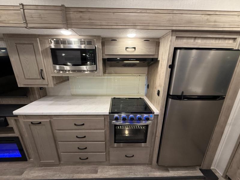 Kitchen with high-rise faucet, extra-deep single basin sink, stainless appliances (e.g., GE® 10 cu ft 12 V fridge in some models), residential-style cooktop & oven.