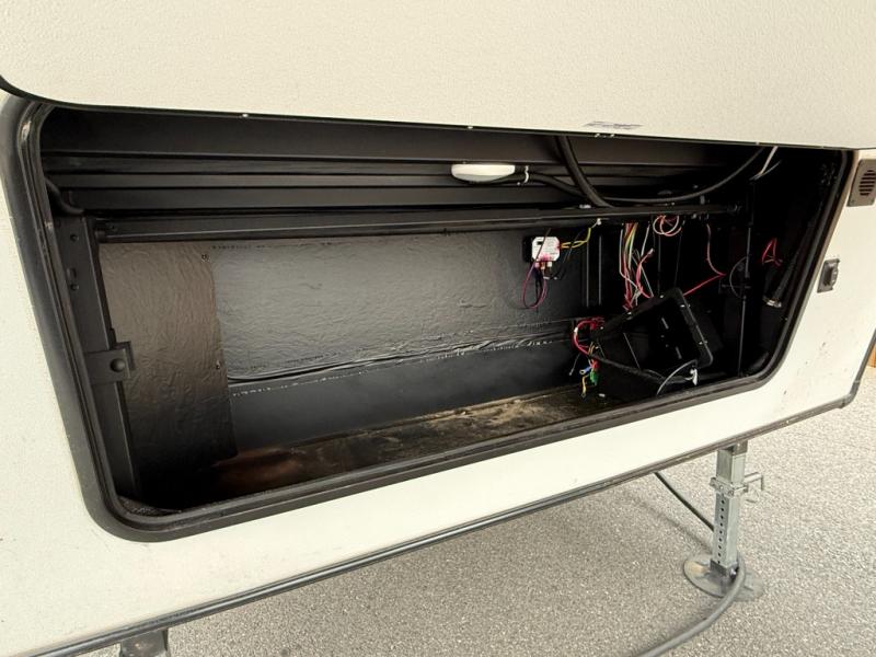 Exterior amenities: Electric awning with LED light strip & one-hand pitch adjustment, solid step main entry (3-step or 4-step depending), 2" accessory receiver hitch on rear bumper, luxury suspension system (Road Armor® by Trail Air®) and camera prep (backup & sideview).
