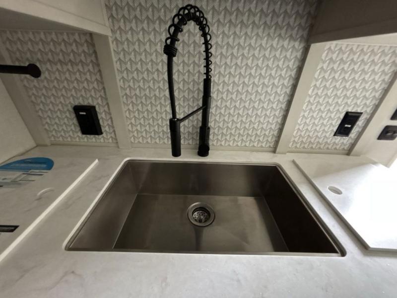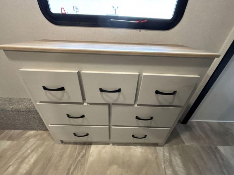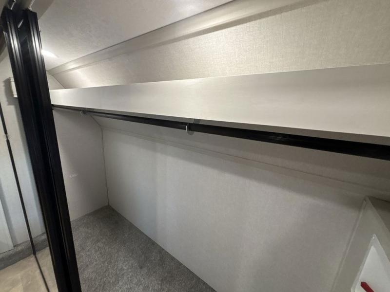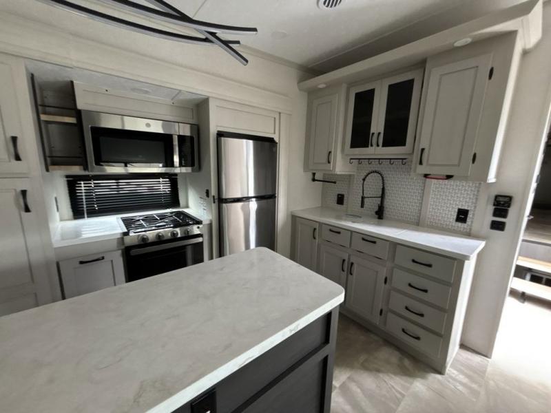 What could be better than a camping trip with family and friends? A camping trip in this spacious fifth wheel that can sleep eight people comfortably! There is a private middle bunkhouse with double-size bunks and overhead cabinets to store belongings, and a front private bedroom with a queen bed slide out. You'll find storage space in the large bedroom wardrobe that also includes washer and dryer prep if you plan to go full-time or camp for longer periods of time. Everyone can meet in the main living area that includes dual opposing slides, theatre seating, a free-spanning table, plus a tri-fold hide-a-bed sofa! And we didn't even mention the fully-equipped kitchen with stainless steel appliances, an extra deep single basin sink, plus tons of counter space with overhead cabinets for more storage!