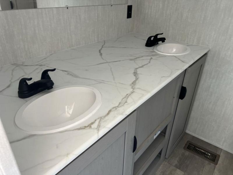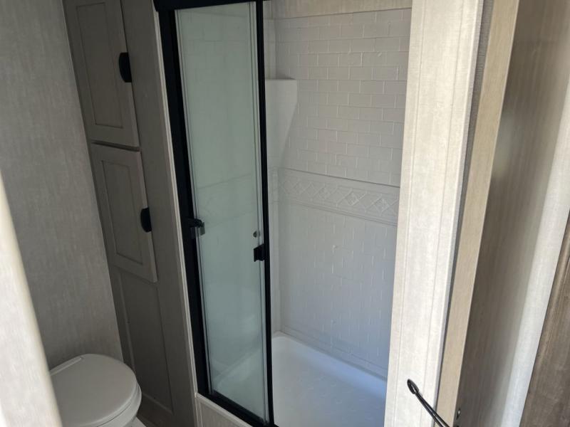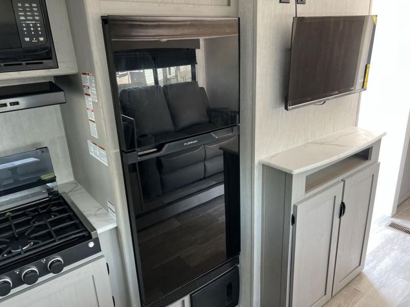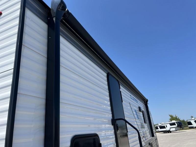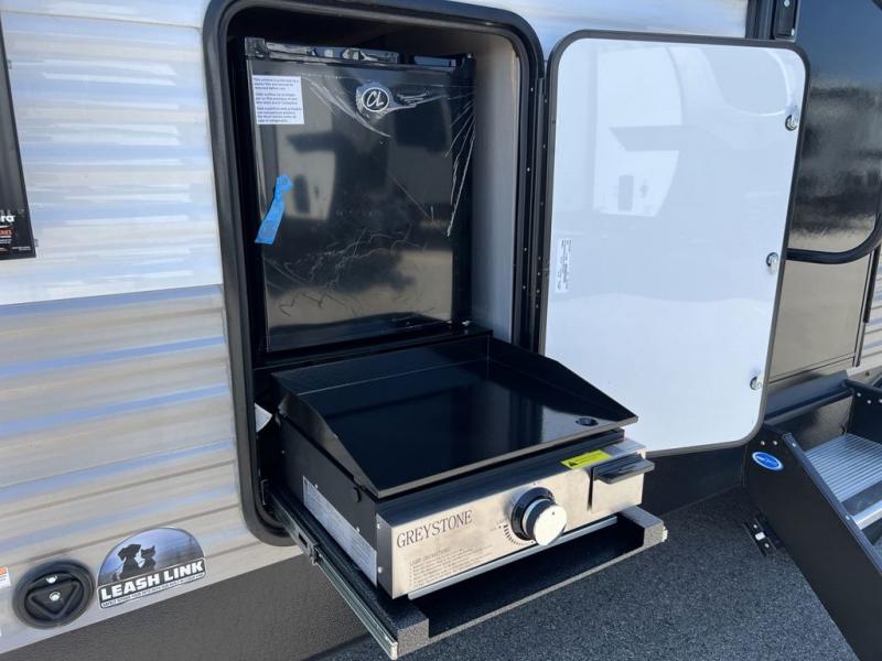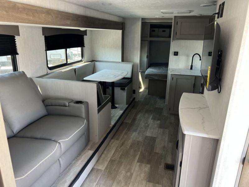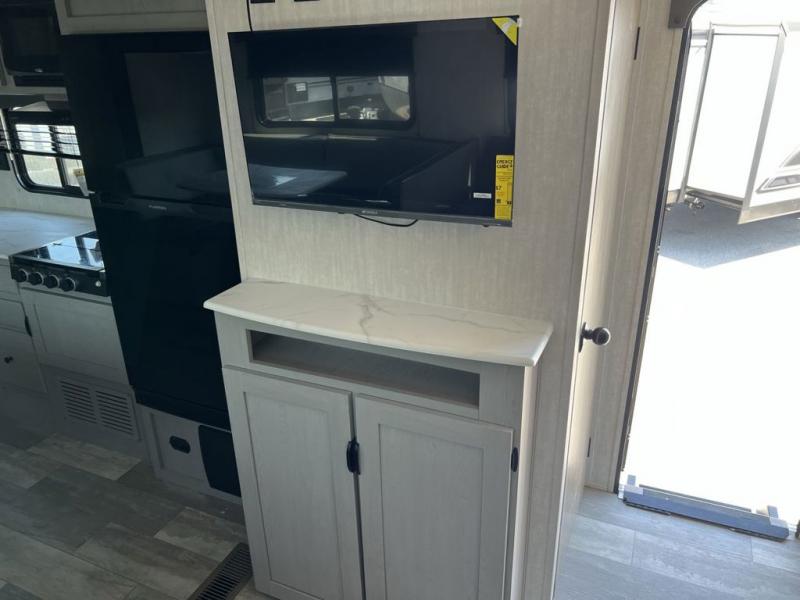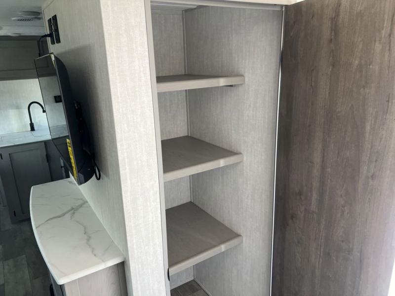 Pack your bags and head to the campground in this spacious travel trailer! The owners will love having their own space in the front private bedroom, complete with an RV queen bed plus dual wardrobes and shelves. If you have any guests staying over, they can sleep on the sofa and booth dinette within the large slide out, and an optional fireplace can be added to this space to make it feel a little more like home. A full kitchen will let you make meals each day, and the outside camp kitchen with a small refrigerator will be perfect for lunch outside. The spacious full rear bath features a large bath countertop, a shower with a glass door, and a linen cabinet to name a few conveniences. The walk-in pantry is another feature you are sure to appreciate, especially since it has washer and dryer prep if you choose to add these appliances.