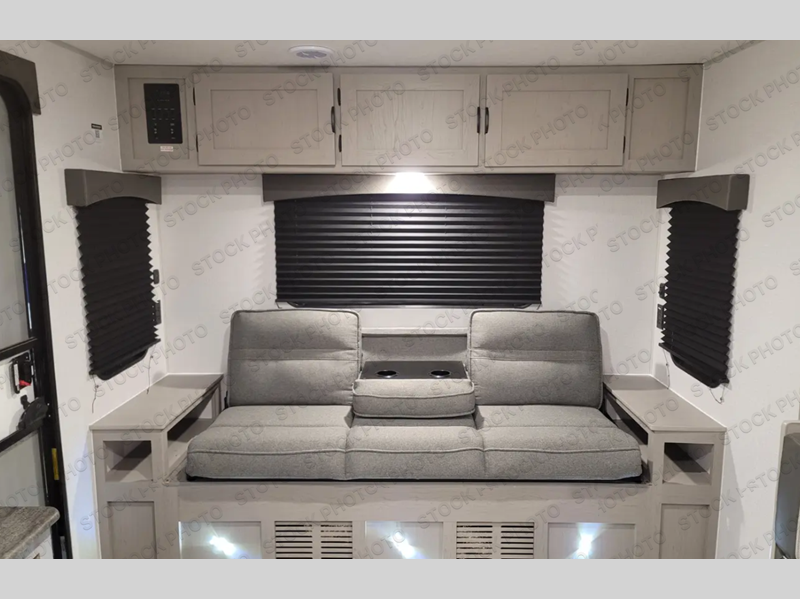 Camp in true luxury with this travel trailer! Inside, you will find dual entry doors creating a smooth flow of traffic in and out of the unit. One of the entrances even leads directly into the front private bedroom which offers a 60" x 74" RV queen bed with wardrobes on either side, another wardrobe, an entertainment center, and an entrance into the walk-thru bathroom. Prepare meals and snacks in the kitchen using the three burner cooktop and microwave oven, or choose to add the optional outdoor camp kitchen with griddle if you enjoy cooking outside as well. Eat your meals and play card games at the U-shaped dinette then relax on the rear 72" sofa while watching a movie with the entertainment center!