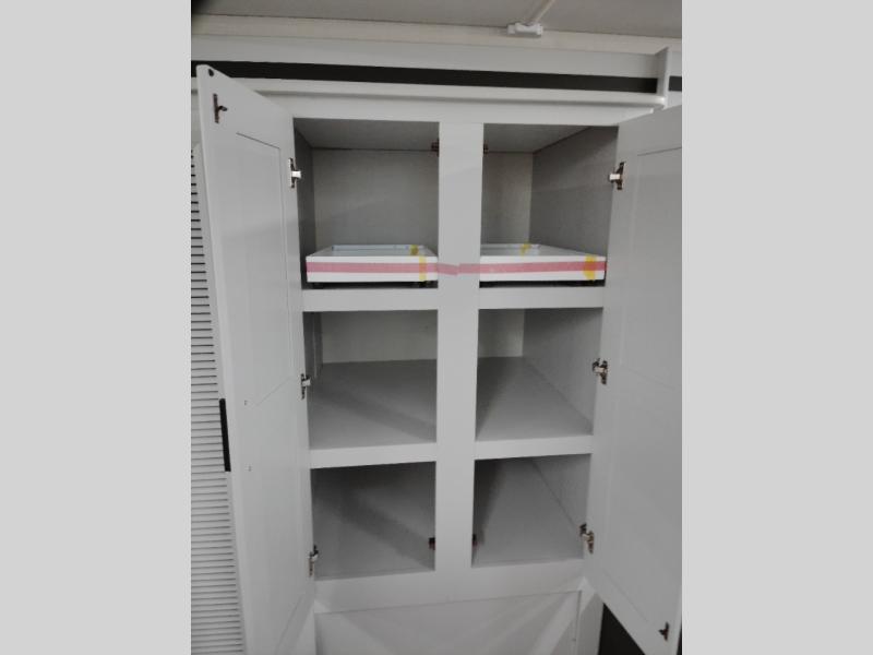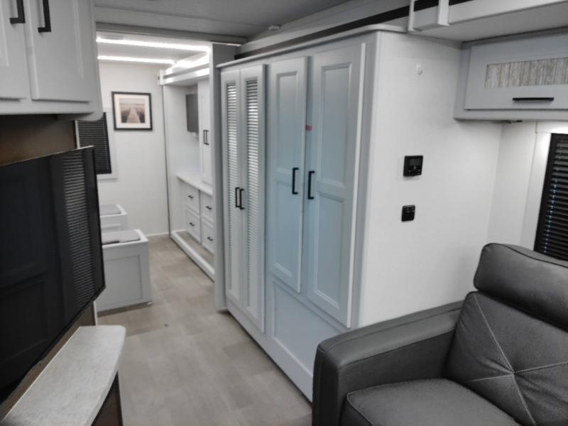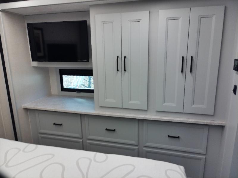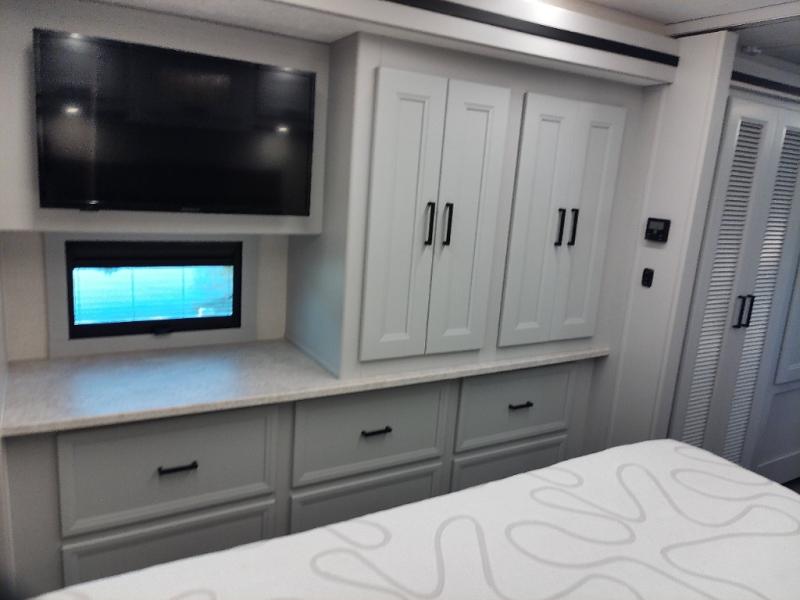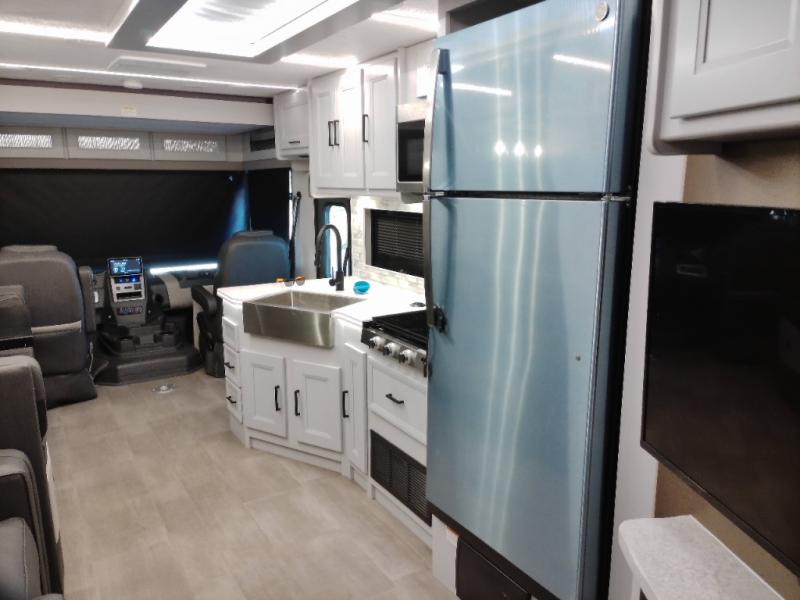 This motorhome perfectly blends comfort, style, and freedom for unforgettable adventures. The rear bedroom offers a 70 x 74 king bed, LED TV, generous wardrobe storage, overhead cabinets, and a sleek design. Additionally, this motorhome features a full bathroom, stackable washer/dryer prep, and linen/pantry storage, ideal for extended trips and comfortable for the whole family. The kitchen boasts a residential-sized refrigerator, microwave, overhead cabinets, a three-burner cooktop, and a spacious 76” dinette perfect for enjoying meals with family and friends. Plus, outdoor kitchen for al fresco dining. Cook, dine, and entertain with ease, wherever the road takes you. Finally, enjoy quality time with family and friends in the incredible living room equipped with a 40” LED TV, a warm fireplace, and a 78” sofa ideal for relaxation.
