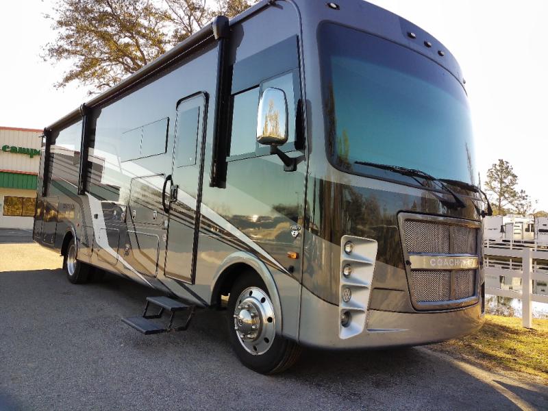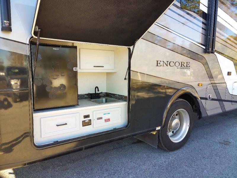 Each one of these Coachmen RV Encore Class A gas motorhomes have been engineered for maximum comfort! A Ford F53 chassis holds them together and a 7.3L V8 engine powers them to each destination. Both the crowned, laminated fiberglass roof and the high gloss gelcoat sidewalls come with Azdel superlite composite to prevent your unit from rotting away. Automatic leveling jacks make for an easy and quick set up when you arrive. You will appreciate having an exterior propane hookup and the pass-through full basement storage area has plenty of space for all of your outdoor gear, plus the radius trunk doors come with slam latch. With high definition back up and side cameras, you can travel with peace of mind. Come find your favorite one today!