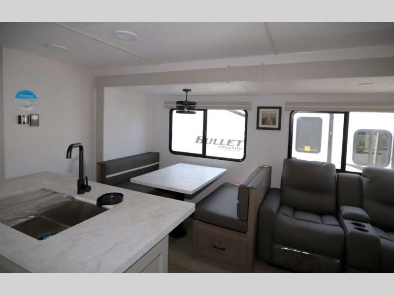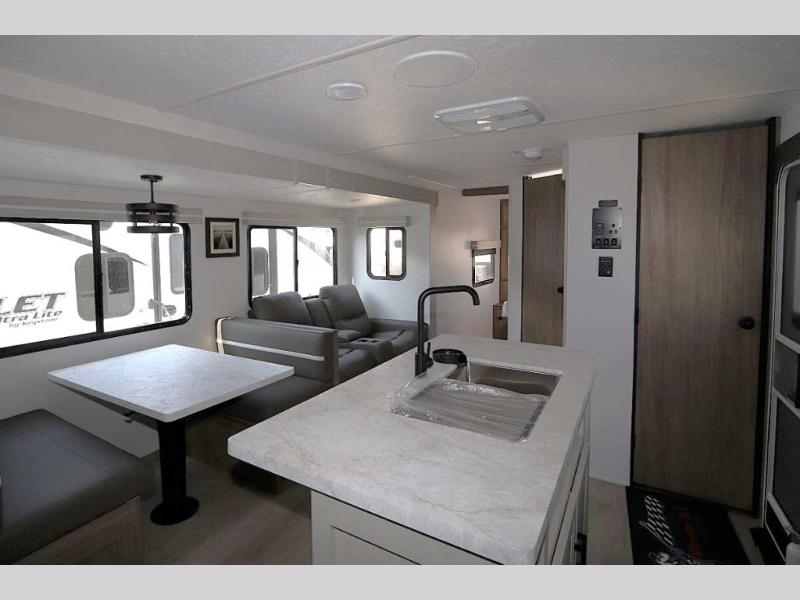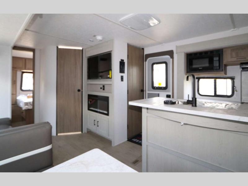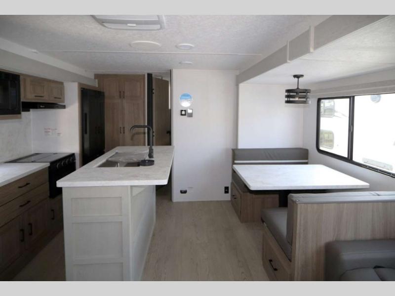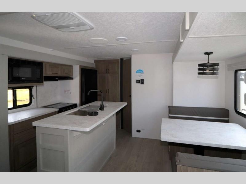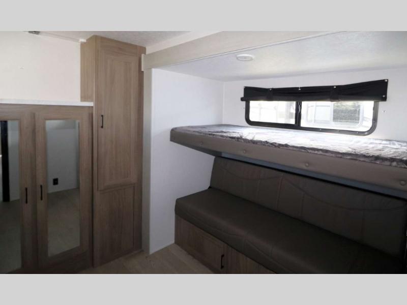 It won't be hard to find comfort and convenience in this travel trailer for eight. Once you've checked in at your campsite, grab your gear from the pass-through storage, put out the 20' awning, then start lunch on the full camp kitchen! If you'd rather cook inside, you'll find a three burner range and a microwave oven to cook meals, along with an 8 cu. ft. double door refrigerator and pantry for food storage, plus a kitchen island for more prep space! The booth dinette provides a place to dine or play games, and the hide-a-bed sofa can be switched out for an optional theater seat if you don't need the additional sleeping space. A stand-out feature on this model is the rear private bunkhouse with a flip-up bunk and roll-over sofa within a slide out, a second bunk across the room, a wardrobe with space for a TV, plus a second wardrobe for storage. And don't overlook the dual entry bath that leads to the front master bedroom, complete with a queen bed with underbed storage and dual wardrobes!