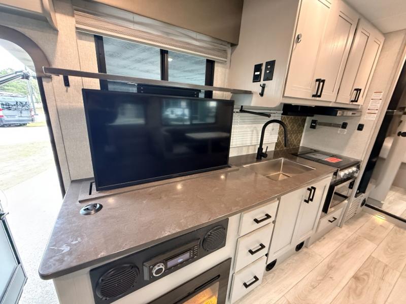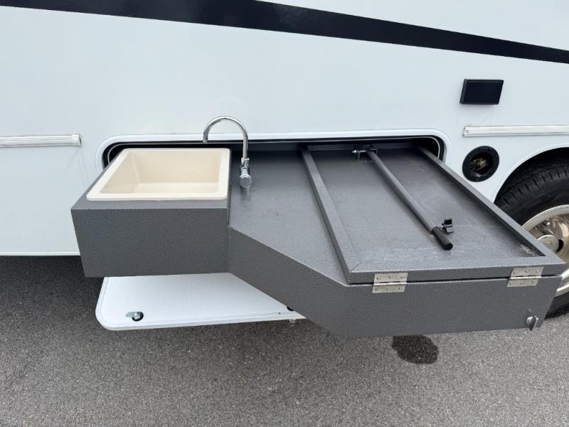Perfect indoor and outdoor spaces define this great motorhome! Inside you’ll feel right at home with a spacious living area. The sofa faces the TV which is on a lift so can be tucked away out of sight when you aren’t watching. The U-dinette offers even more space for the whole family to enjoy meals cooked in the kitchen. A mid-coach bath can be used by two people at once as the shower is across the hall from the toilet/sink room. A rear bedroom with queen bed and roomy wardrobes lets you bring many changes of clothes. Step outside under the power patio awning with LED light, or add on the optional camp kitchen so you can cook under the open sky. There is even an optional outside entertainment center if you enjoy watching the big game outdoors! This model also includes the CRV Supersprings Ride with heavy duty stabilizer bars, chassis electronic stability control, SumoSprings front shock absorbers, and more!