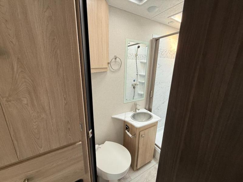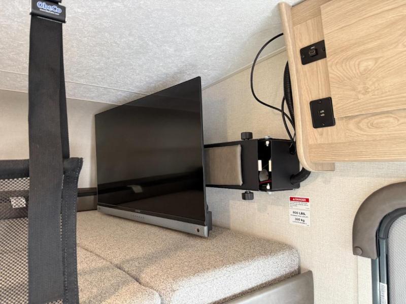 You will feel so lucky traveling down the highway in this Leprechaun Class C gas motorhome! The spacious J-lounge can be used for dining, sleeping, or game night, and the kids will love the bunk over cab that includes a swing-arm TV! The Murphy queen bed is both comfortable and functional since this area can also be a multi-function bedroom/cargo bay area once it's folded up during the day. You will also be able to offer a full bathroom to anyone that stops by.
