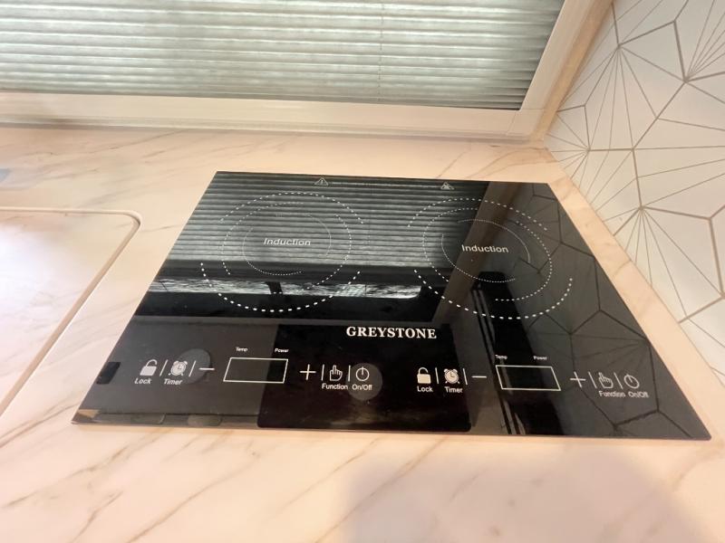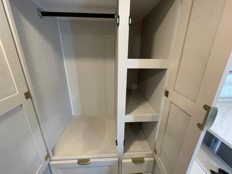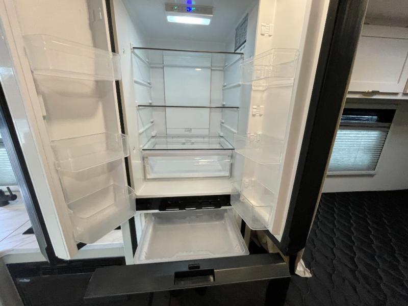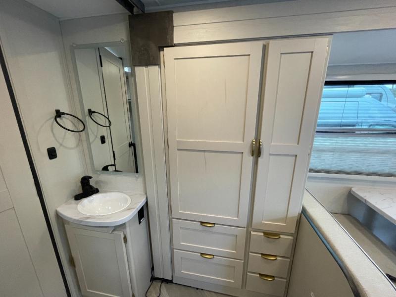 The living area features comfortable seating and plenty of room to relax after a day of adventures. The galley kitchen is thoughtfully designed with modern appliances, generous counter space, and storage for all your culinary essentials. Preparing meals feels just like home, whether you’re making breakfast before a hike or dinner at the campground.