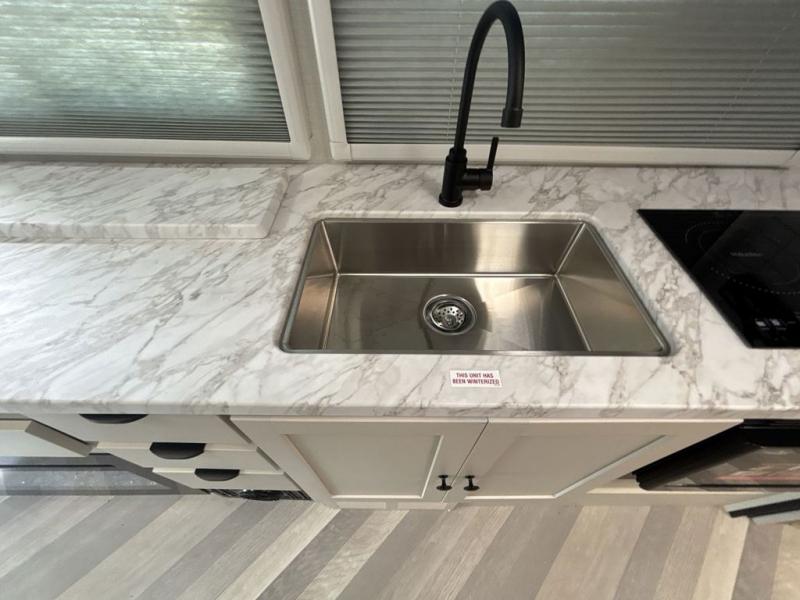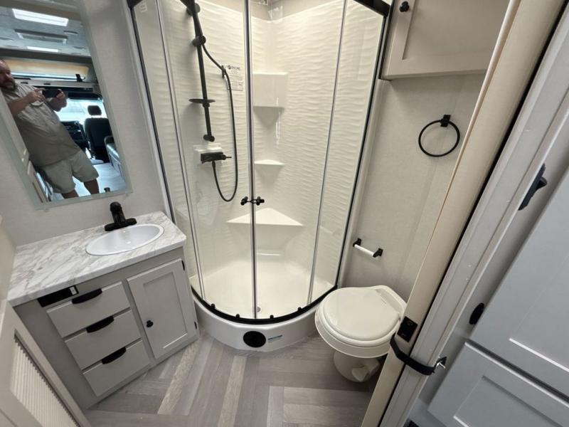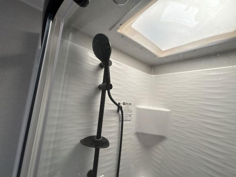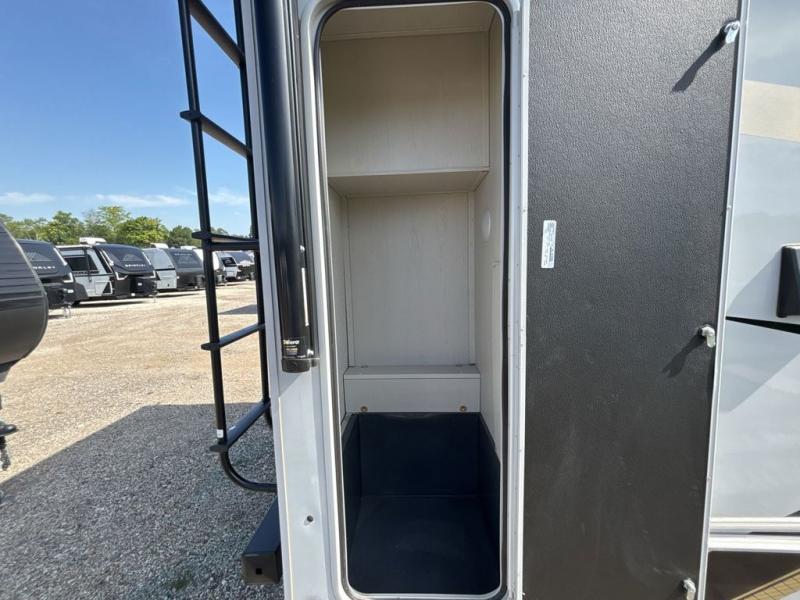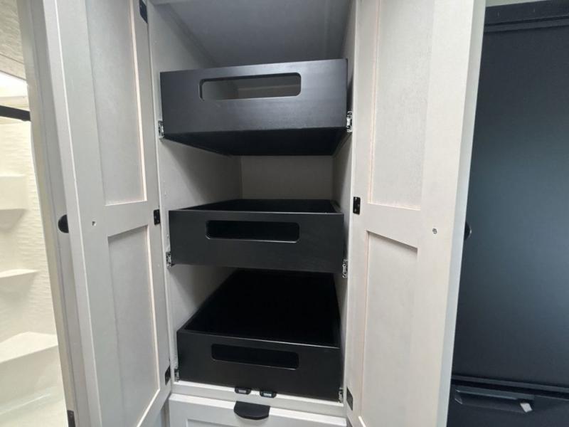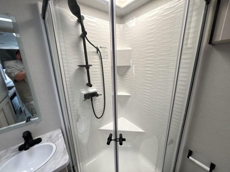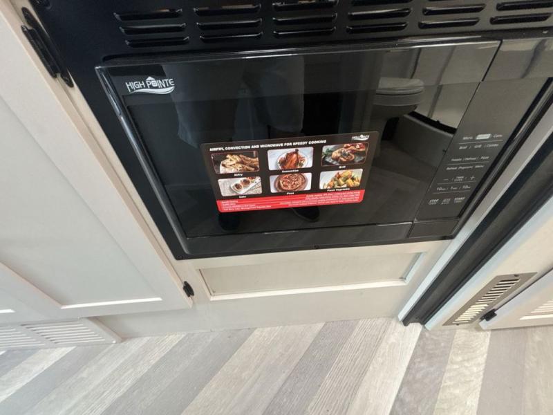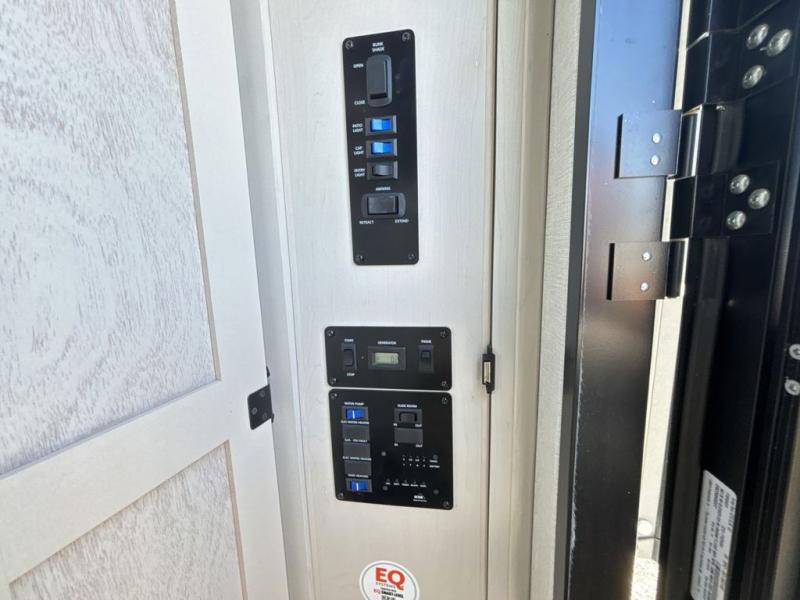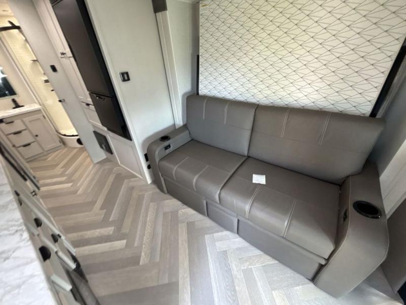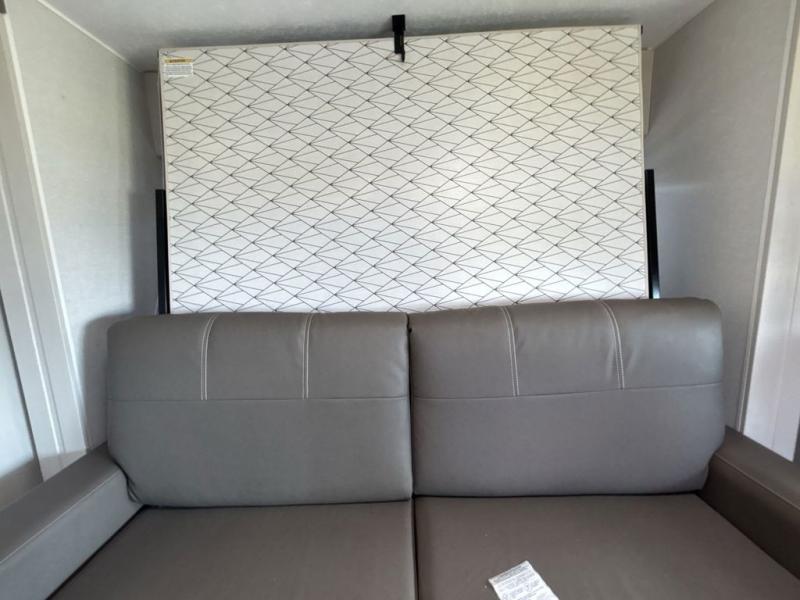 You will enjoy the versatility that this Murphy bed model provides. Depending on whether it is daytime or evening will determine if you have a 60" x 74" bed that slides out or a 62" sofa to enjoy. There is a 45" x 76" cab over bunk that can be used for added sleeping for two more guests, or used as added storage space. The rear full bath is spacious and private and includes a 32" x 32" angled shower, toilet, vanity with sink, plus linen cabinet, and wardrobe. The kitchen features everything needed to create meals while on the go, and a cozy fireplace is included beneath the coach TV for your enjoyment. Outside, you will find a second TV beneath the armless awning so you can enjoy watching your favorite movies and games whenever you like.