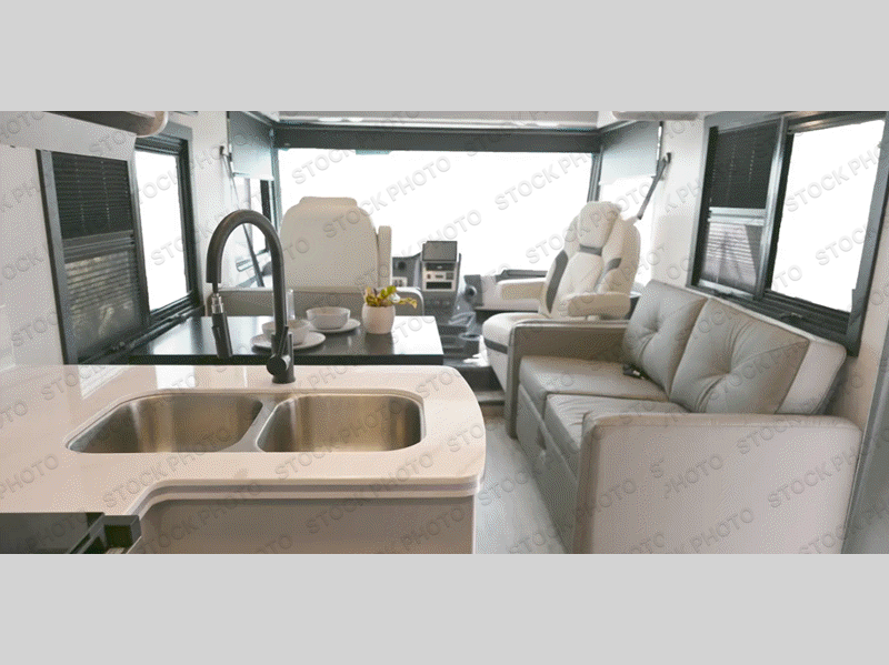 Live your best life on the road with this motorhome! The rear private bedroom has a 60" x 74" queen bed to lay your head on at night with wardrobes on either side of it for your clothes. A separated bathroom makes it easy for one person to freshen up in the 24" x 32" shower while another uses the private toilet and sink. Enjoy home cooked meals while out on the road with the stainless steel three burner cooktop, the 12V stainless steel double door 10 cu. ft. refrigerator, and even the stainless steel microwave oven. Eat your meals, play card games, and even transform the 42" x 70" booth dinette into an extra sleeping space. The 63" sofa has storage below for an extra blanket or board games. If you need to get some work done while you're away then you will appreciate the computer work station with 12V, 110V, and USB outlets in front of the passenger chair!