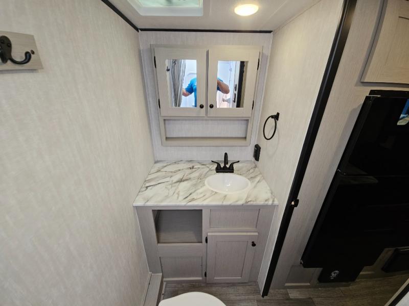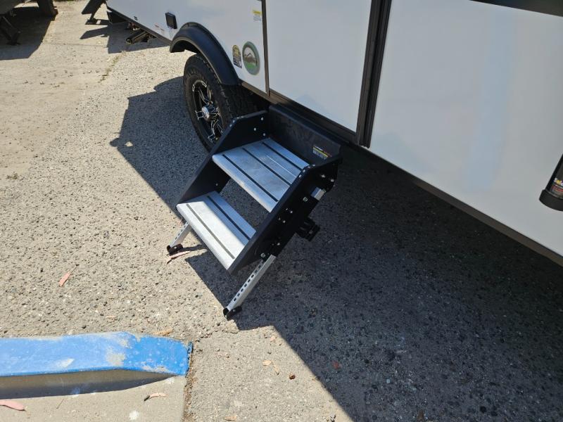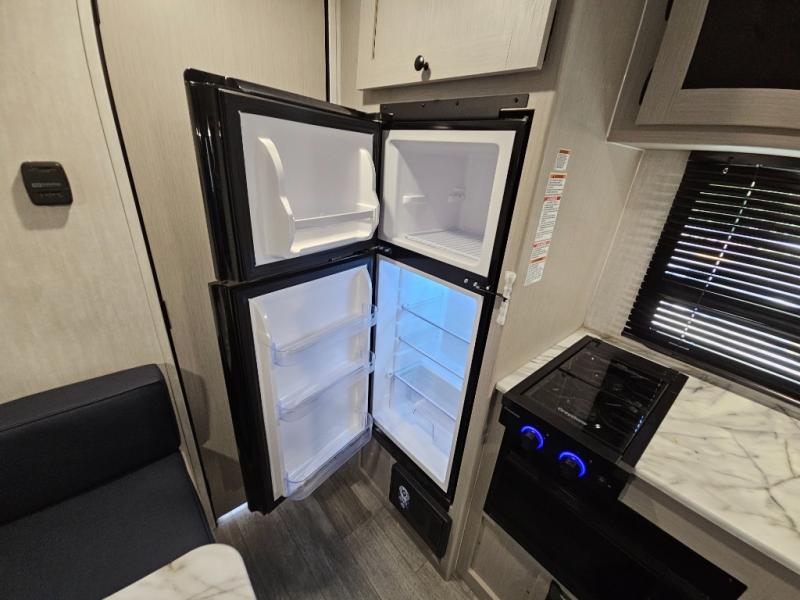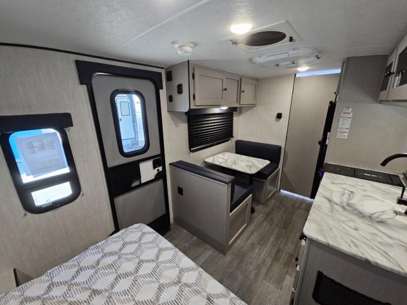 Enjoy camping in this cute Remote trailer features a rear full bath including shower with skylight for more natural lighting, a vanity with sink, and overhead storage. A 54" x 74" bed will be waiting for two of you to provide a comfortable night's rest, and if you have a third camper you can convert the booth dinette for sleeping for one more, or maybe two small children. Dine inside at the booth dinette and play card games at the table, or enjoy spending time outside under the 13' power awning with LED light. You can even cook burgers and dogs while enjoying nice weather with the help of the outdoor cast iron griddle.