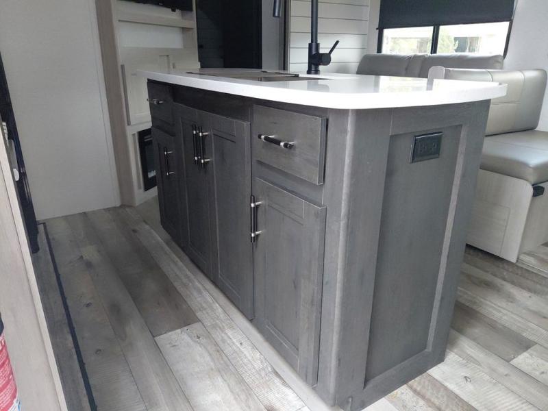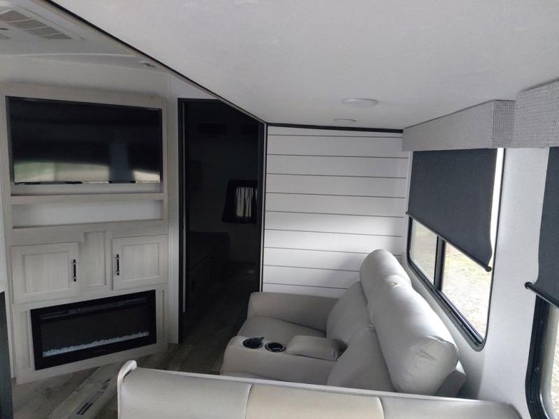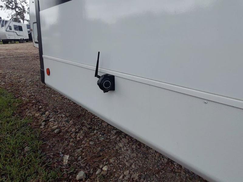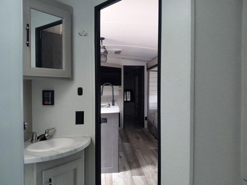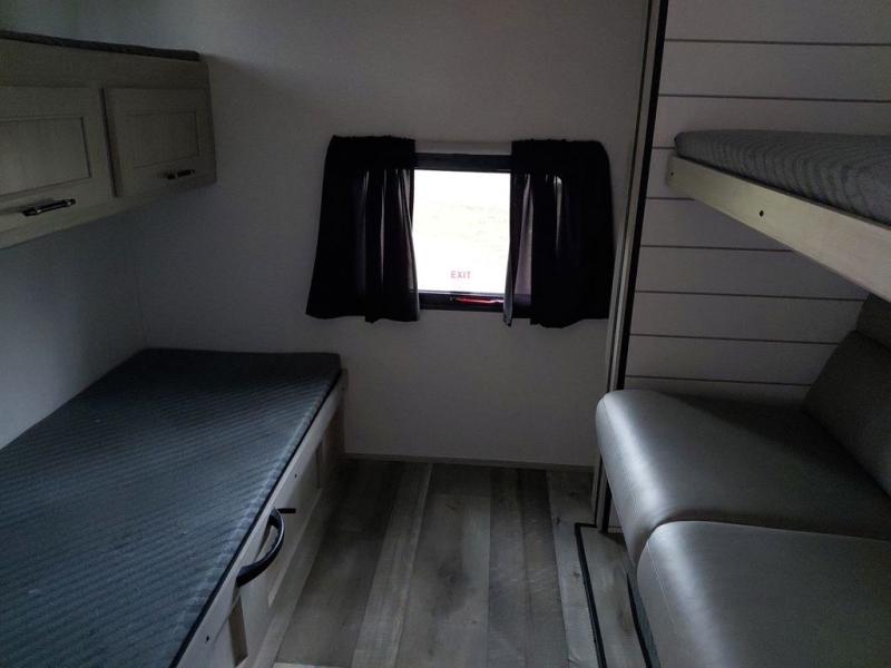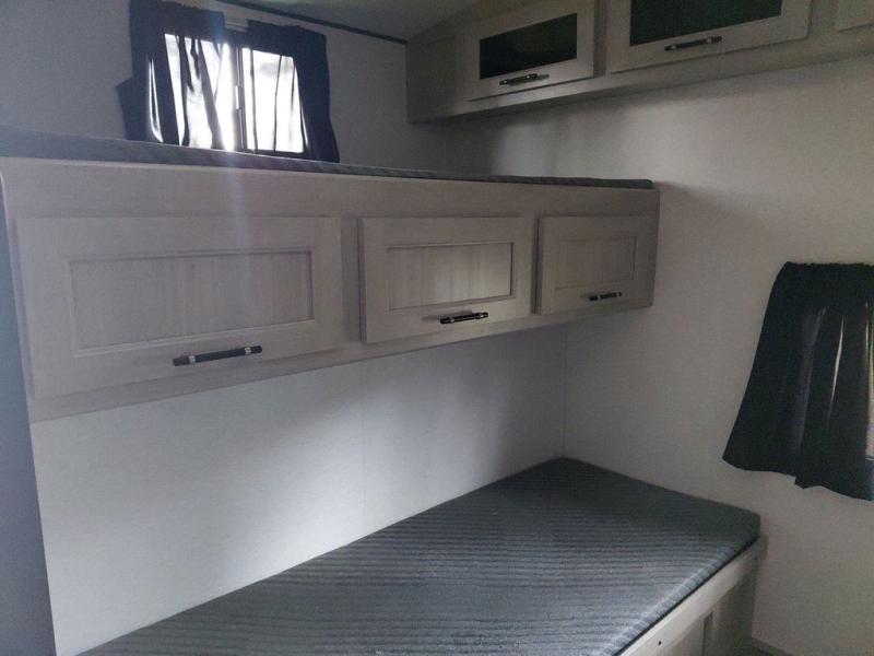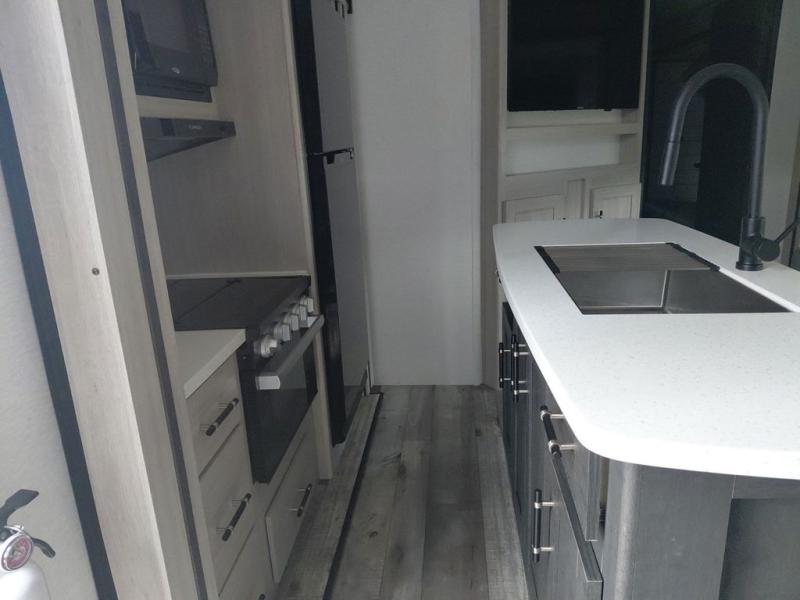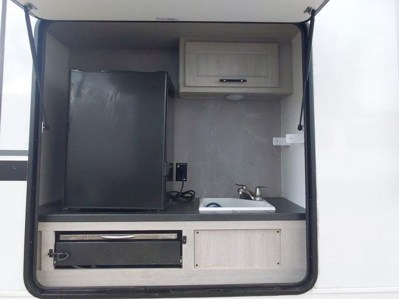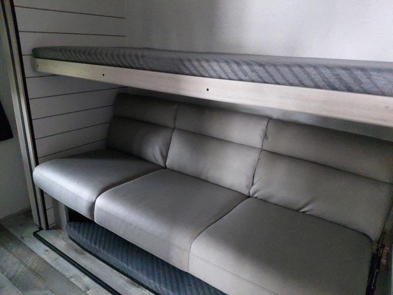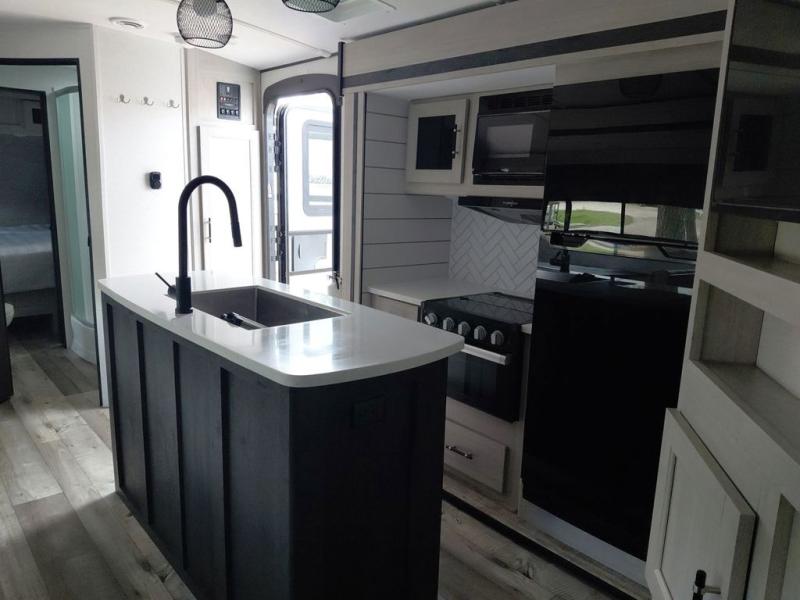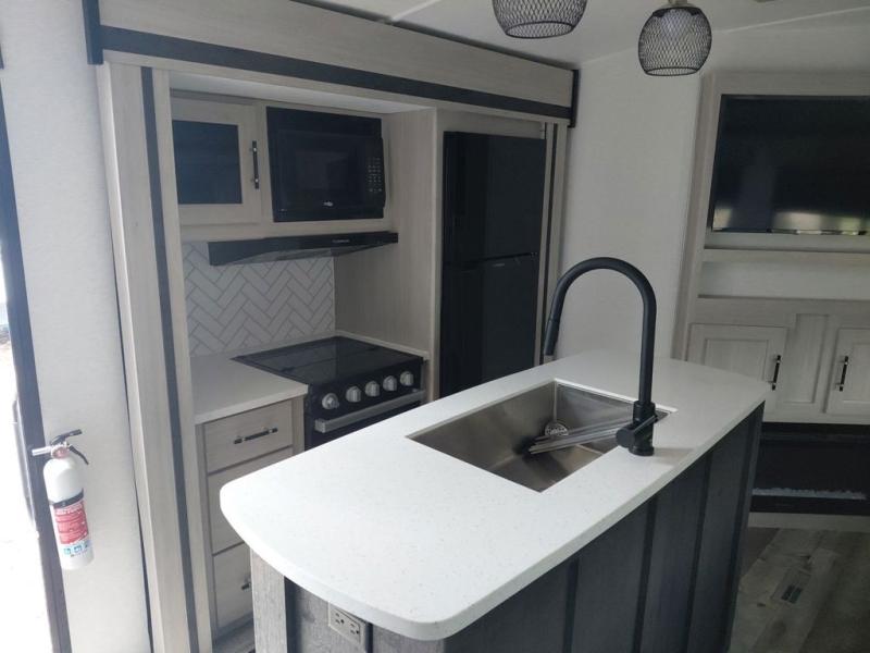 This travel trailer is packed with convenient features and luxury comforts for a camping trip you won't soon forget. Once you arrive at the campground, put out the electric awning and make a quick lunch on the exterior camp kitchen. The kitchen island inside will be the perfect place to cut up all the fixings for the burgers and you can grab the chips from the pantry. The kids will love the private bunkhouse that includes two bunks, a jackknife sofa with a kick, plus a dual entry half bath for convenience. The full walk-through bath will create a front master bedroom you are sure to love. Here, the king bed will provide a great night's rest and there are dual wardrobes for all your clothes.