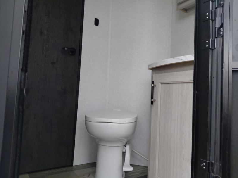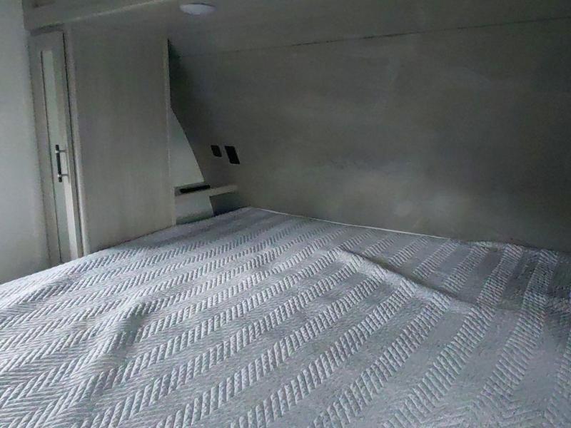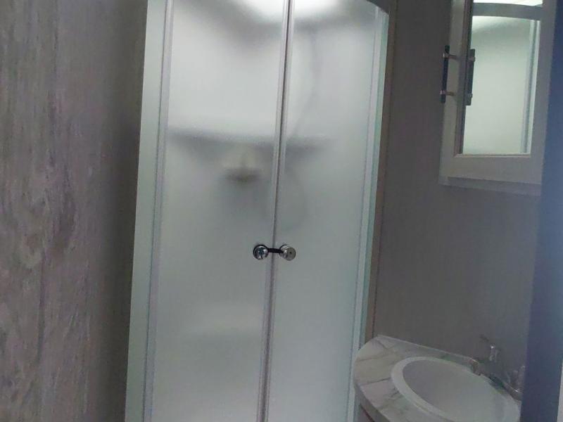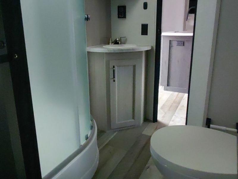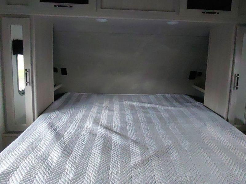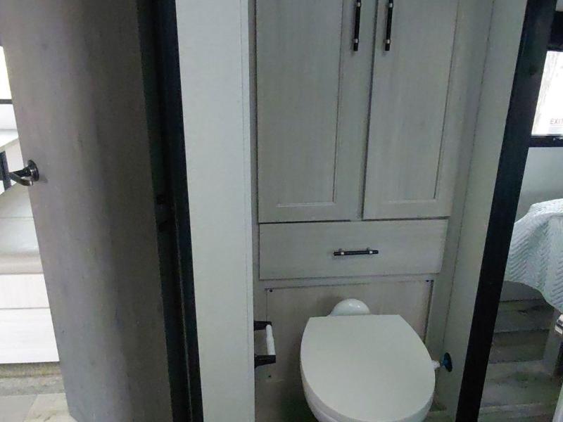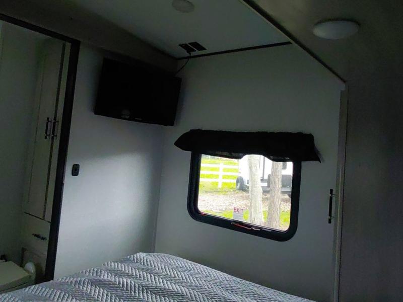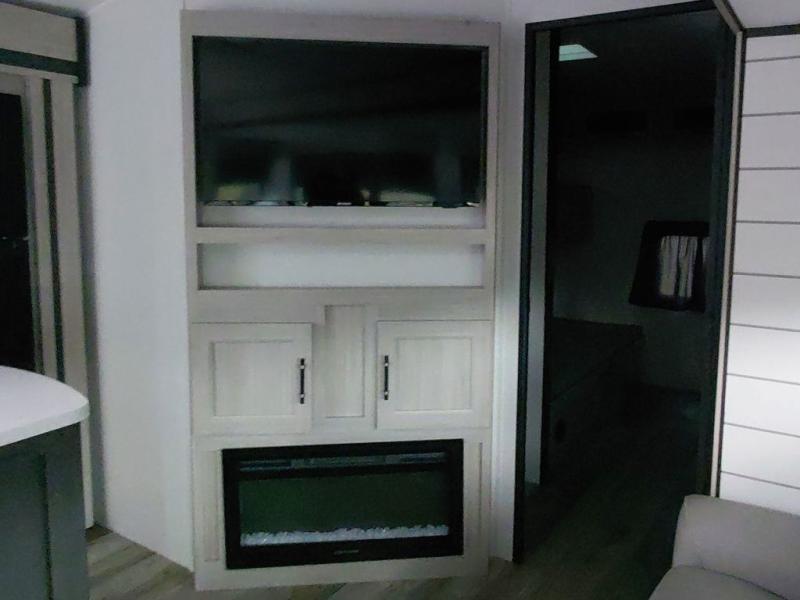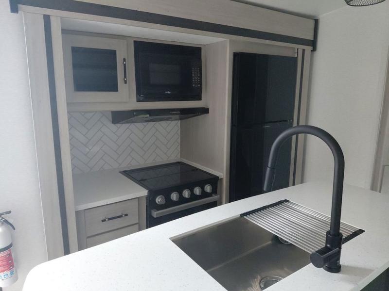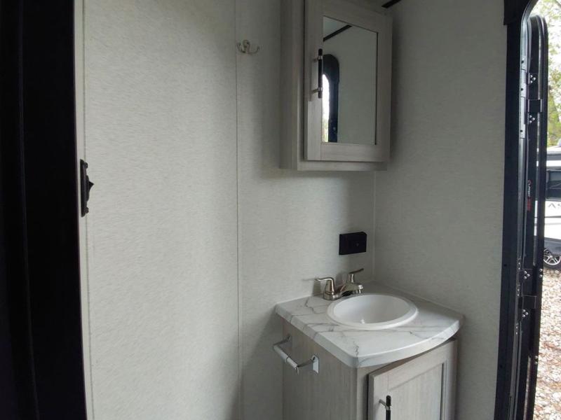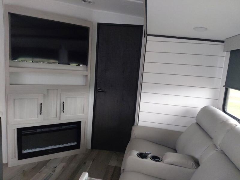 This travel trailer is packed with convenient features and luxury comforts for a camping trip you won't soon forget. Once you arrive at the campground, put out the electric awning and make a quick lunch on the exterior camp kitchen. The kitchen island inside will be the perfect place to cut up all the fixings for the burgers and you can grab the chips from the pantry. The kids will love the private bunkhouse that includes two bunks, a jackknife sofa with a kick, plus a dual entry half bath for convenience. The full walk-through bath will create a front master bedroom you are sure to love. Here, the king bed will provide a great night's rest and there are dual wardrobes for all your clothes.