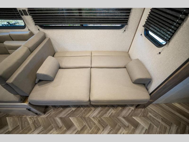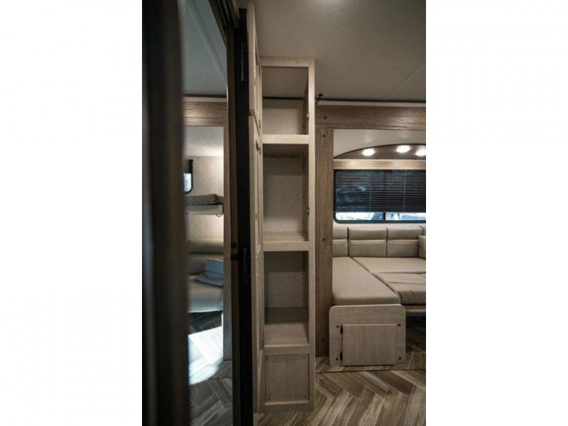With dual entry doors, you will experience a smooth flow of traffic in and out of this travel trailer! The rear private bunkhouse includes two sets of bunk beds plus a fifth bunk over a jack knife sofa, so your kids can invite a few friends to come along. Across from the full bathroom is a linen closet to keep your towels close by and a U-shaped dinette to enjoy your meals at, play games, and even transform into an extra sleeping space. At night you can either relax on the 60" jackknife sofa by the fireplace or head to the front private bedroom and lie down on the 60" x 74" RV queen bed with closets on either side to keep your clothes looking their best!