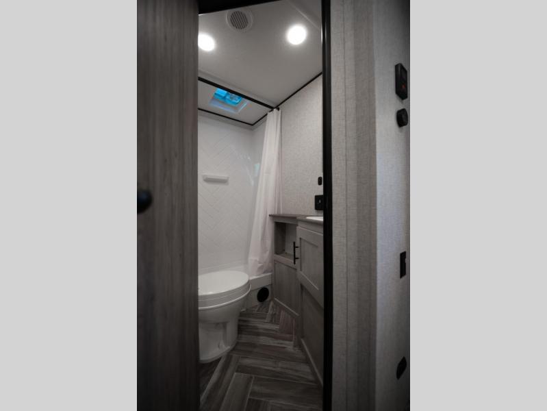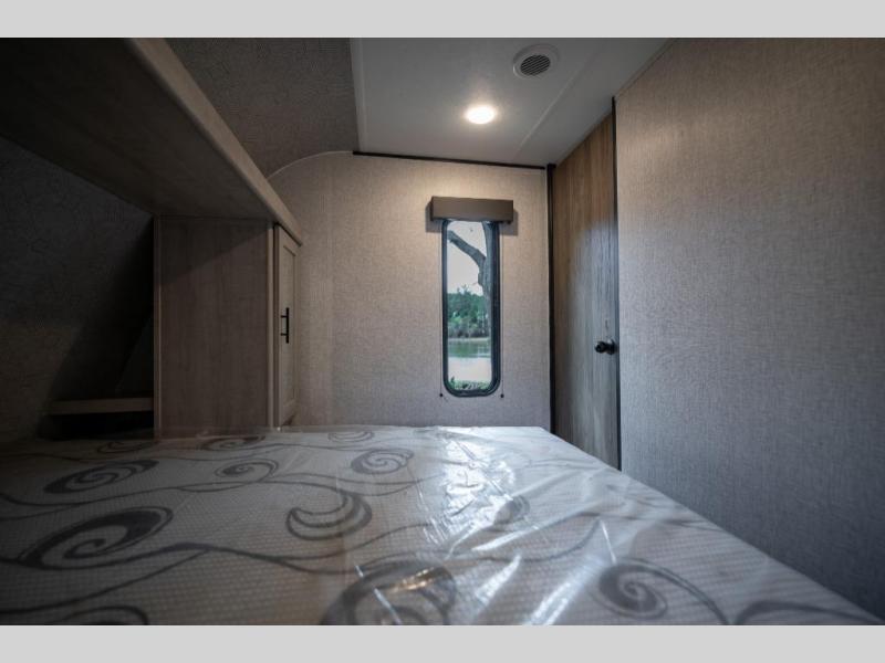 If you've been searching for a travel trailer that can sleep more campers and give you more interior space, this is the one! There are double-size bunks with a ladder for the little ones, an RV queen bed in the front bedroom, plus a jackknife sofa and booth dinette that will double as seating and sleeping space. You will be able to make home cooked meals for your crew since there is a three burner range with a glass top and LED lit knobs, and the 10 cu. ft. 12V refrigerator can keep your food fresh. This model also includes a full bath with a 30" x 36" shower, a foot flush toilet, and a medicine cabinet to keep items organized.