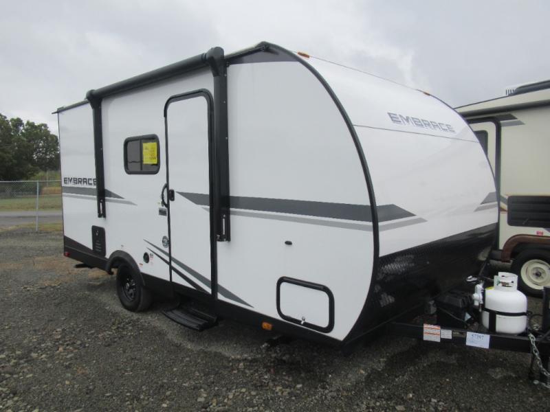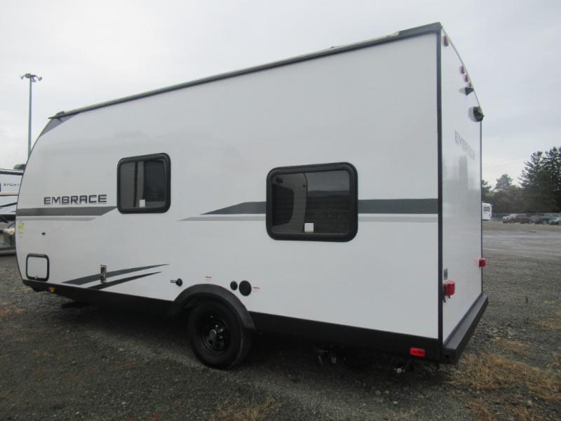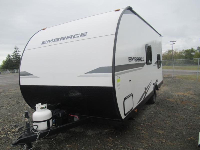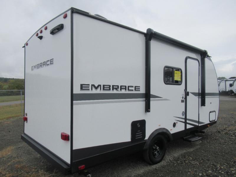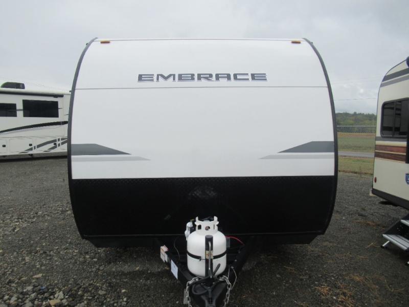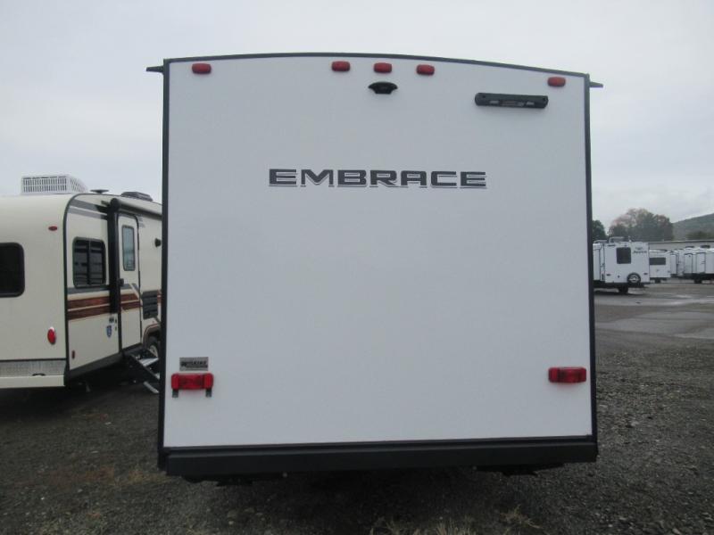 Experience a peace of mind with each one of these Cruiser Embrace travel trailers! The diamond plate stone guard and tough coat heavy duty smooth corrugated exterior metal will help protect against rock and debris on the way to the campground. There are stabilizer jacks for easy set up, and the power awning with an LED light and arm adjustment is sure to come in handy when camping. You'll find many comforts inside, along with an LED light, a two burner range, and an electric water heater so you can enjoy a hot shower after a day outdoors!