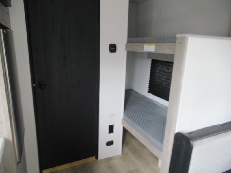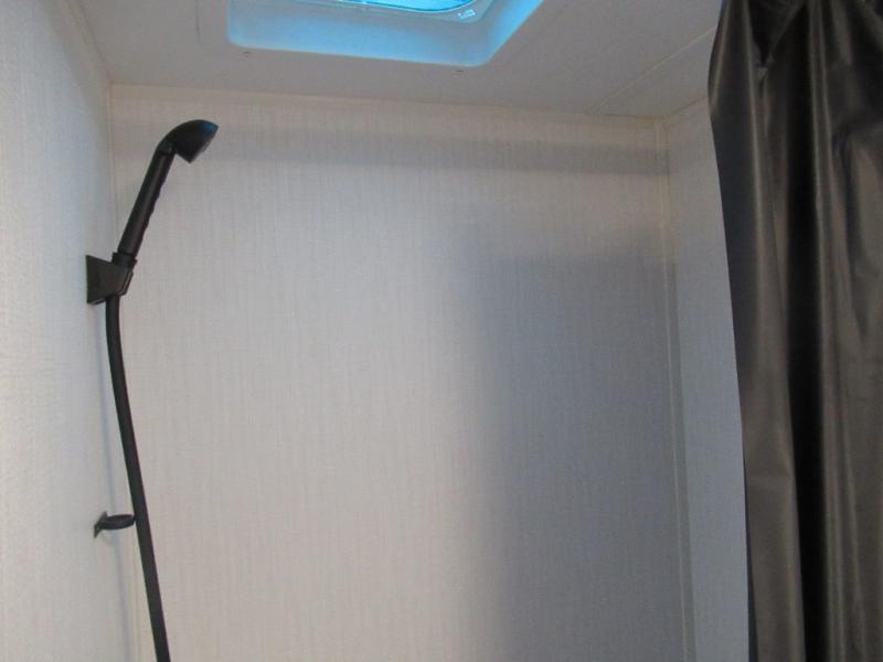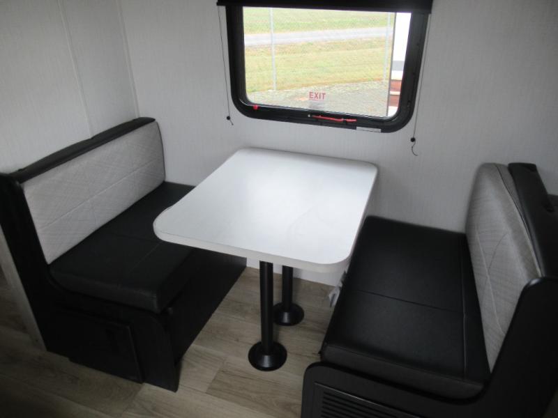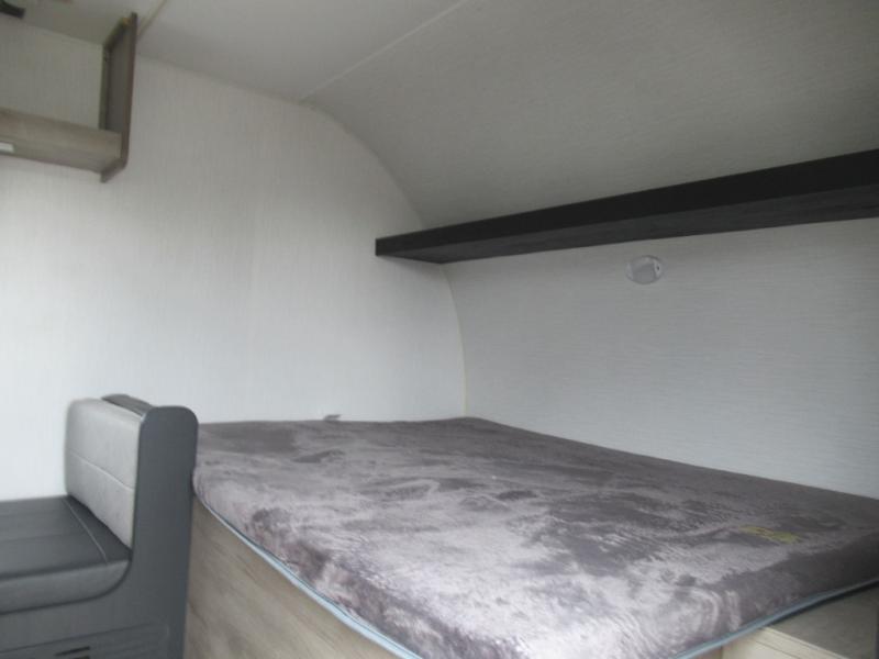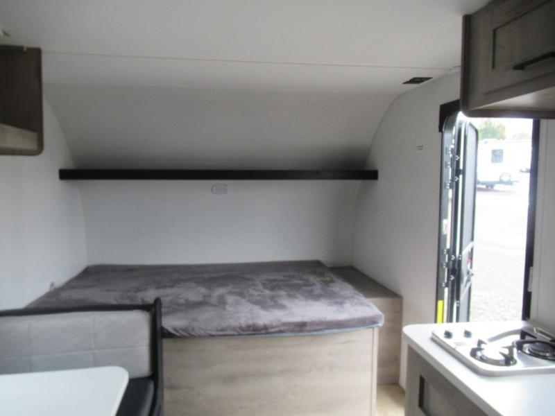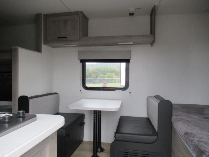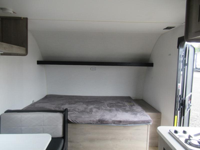 This single axle unit may be compact, but you can confidently sleep five each night thanks to the rear corner bunk beds! Up front you'll find a queen bed with a shelf above for your things, and there is even a booth dinette which which double as dining and sleeping space. A two burner cooktop and double door refrigerator will let you cook and store food each day, and the 8' power awning provides shade if you want to eat outside. There is also a private shower and toilet so you don't have to use the camp's facilities at night!